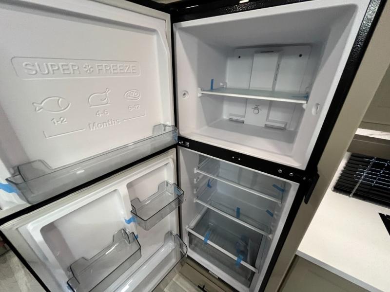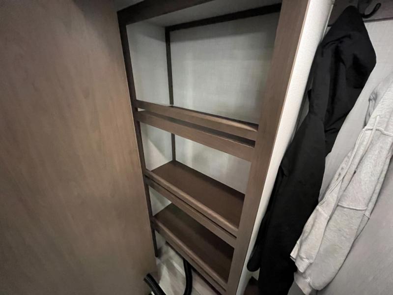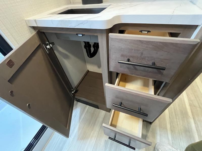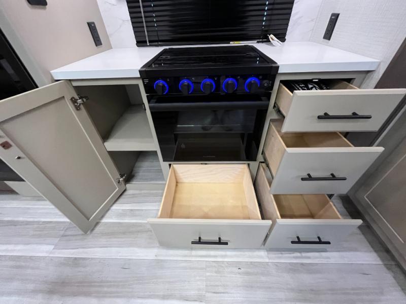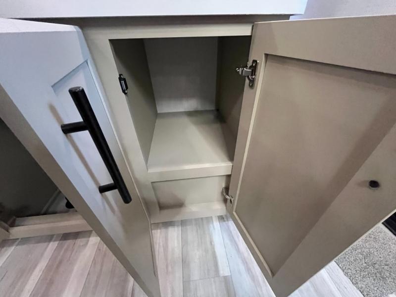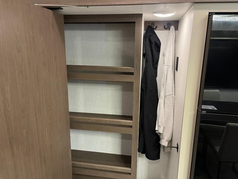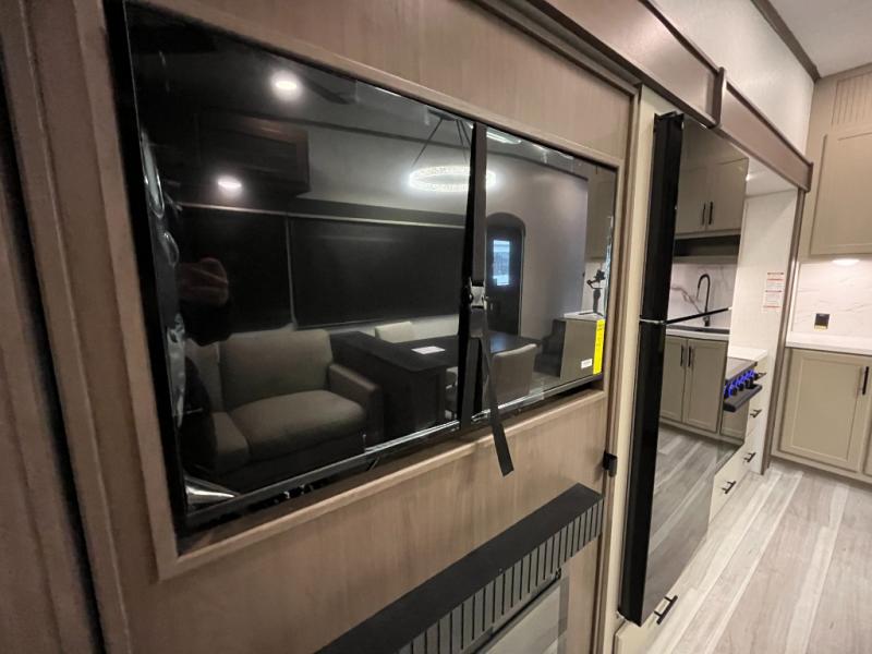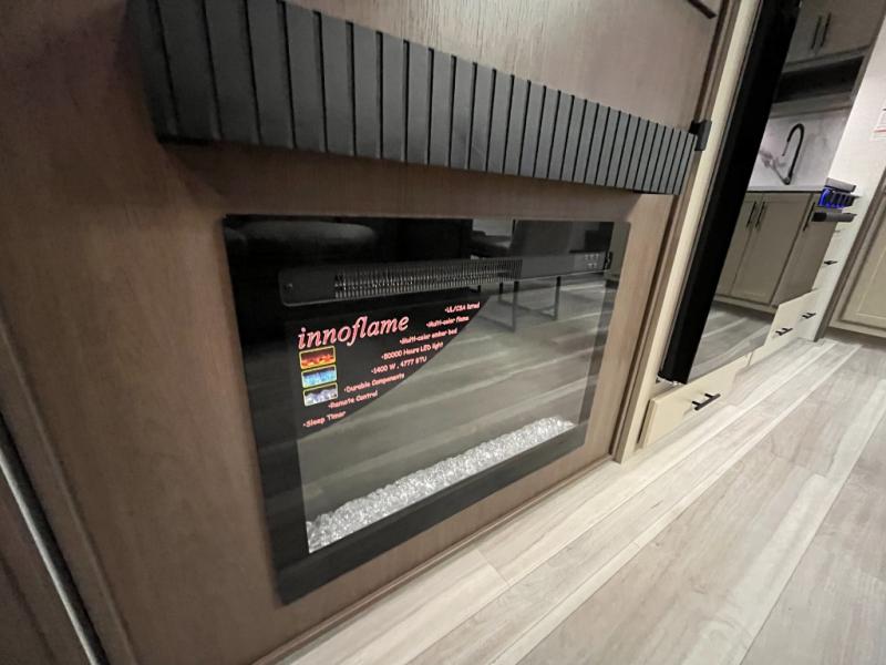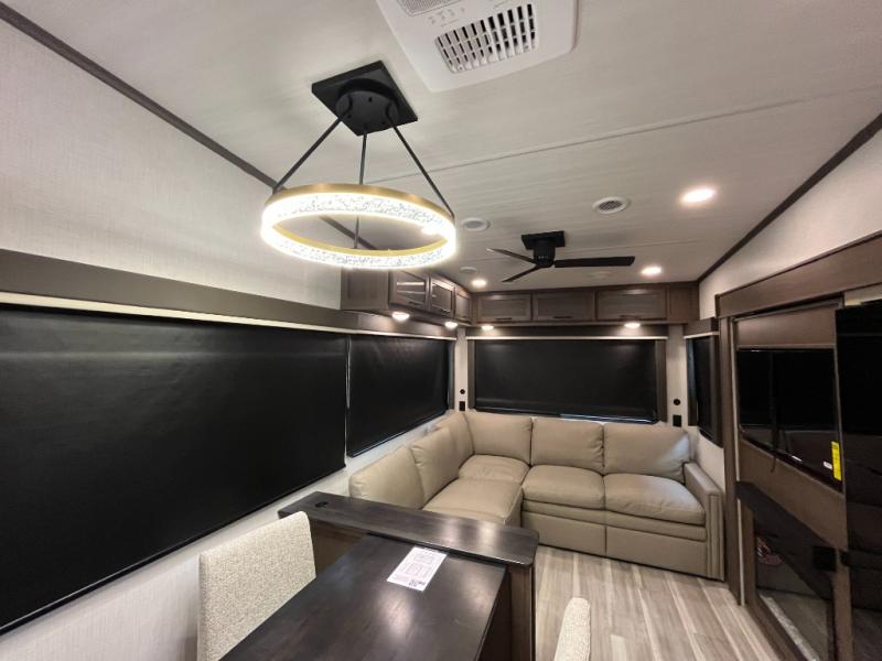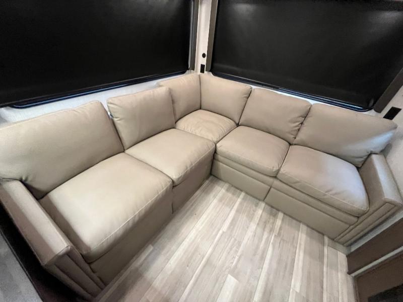Comfort is just a step away in this fifth wheel with a large slide out. Here, you'll find the hidden pantry behind the pivoting entertainment door plus your kitchen appliances. The stainless steel sink will let you easily clean up, and the pivot dinette with two extra folding chairs provides versatile space to dine or work. Your crew can get comfortable on the L-shaped sofa after dinner, or head outdoors under the 18' power awning. A full bath lets you clean up after a day at the lake, and the front private bedroom with a king bed gives you your own space at night. There are also dual wardrobes and nightstands plus a wardrobe with washer and dryer prep for the option to go full-time!