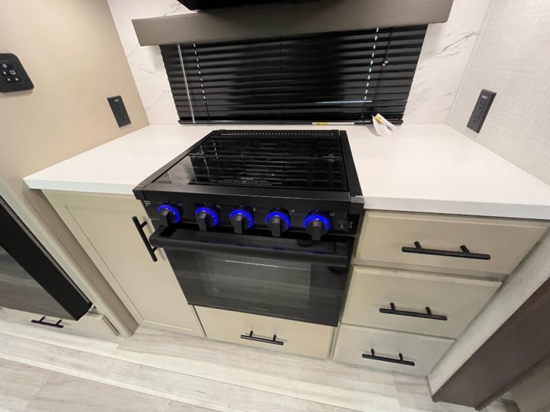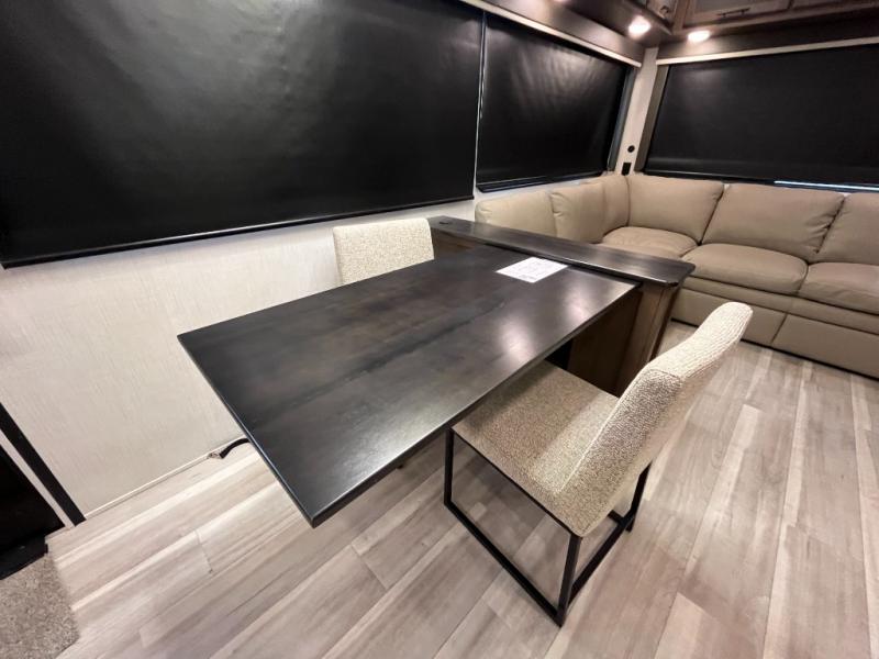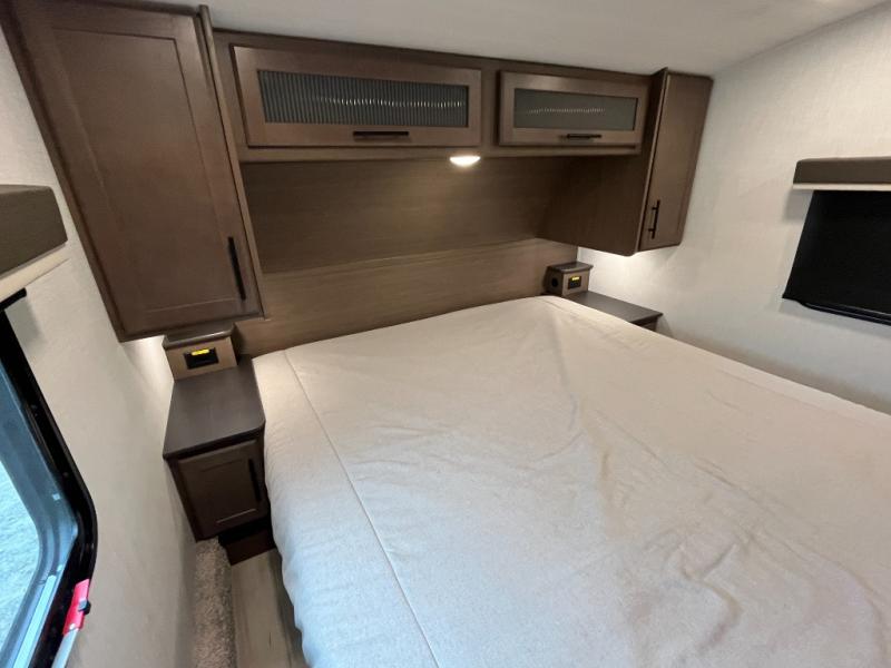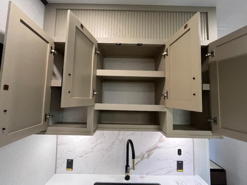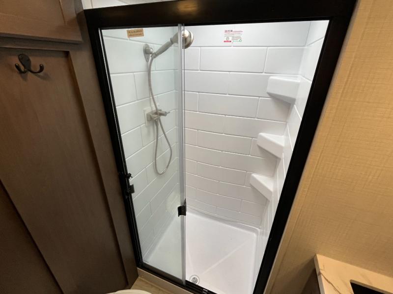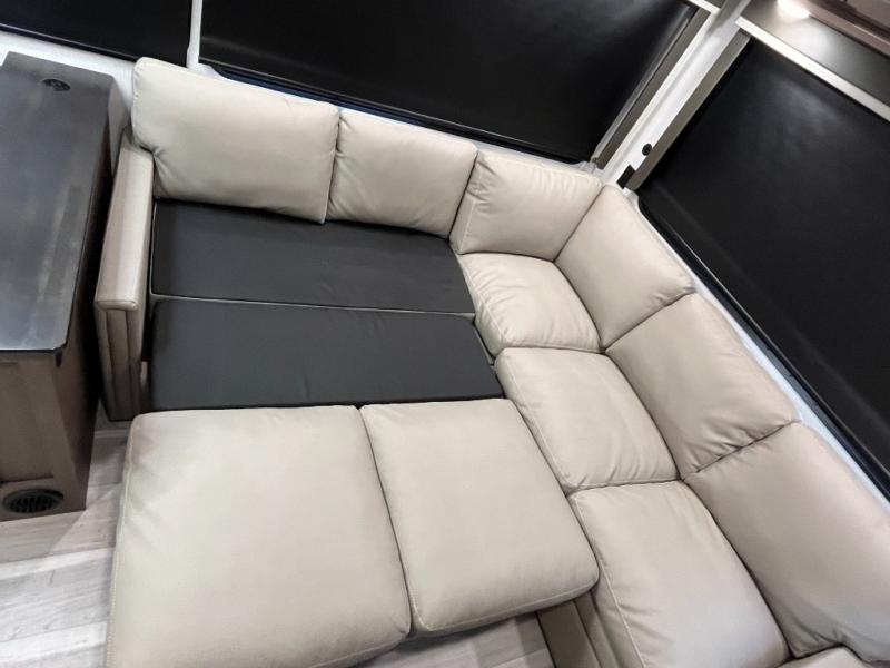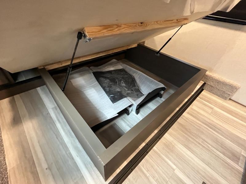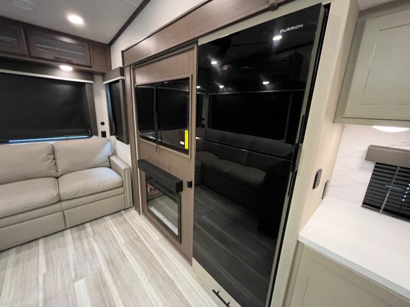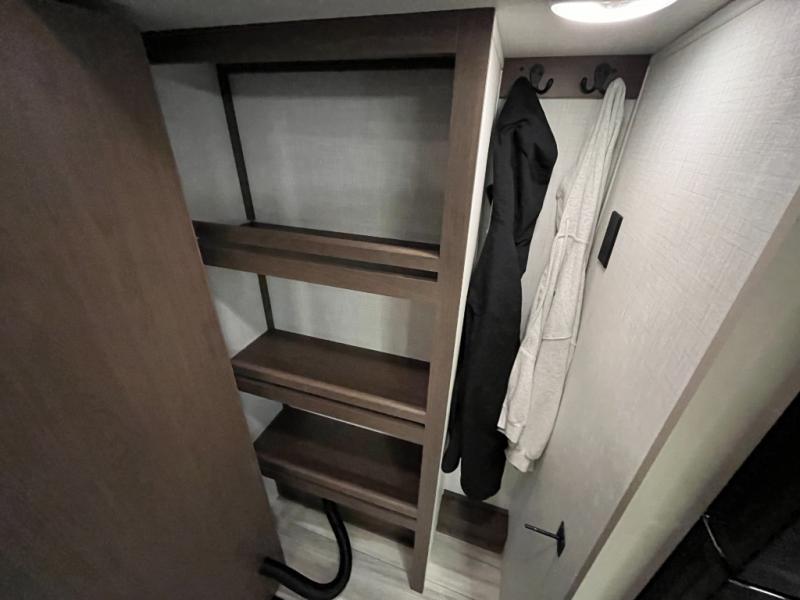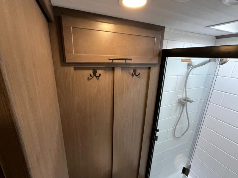Comfort is just a step away in this fifth wheel with a large slide out. Here, you'll find the hidden pantry behind the pivoting entertainment door plus your kitchen appliances. The stainless steel sink will let you easily clean up, and the pivot dinette with two extra folding chairs provides versatile space to dine or work. Your crew can get comfortable on the L-shaped sofa after dinner, or head outdoors under the 18' power awning. A full bath lets you clean up after a day at the lake, and the front private bedroom with a king bed gives you your own space at night. There are also dual wardrobes and nightstands plus a wardrobe with washer and dryer prep for the option to go full-time!