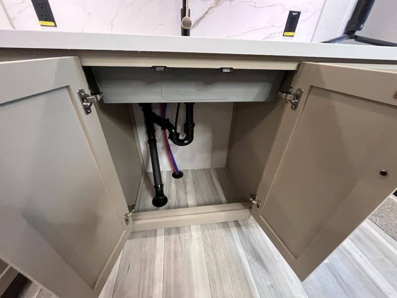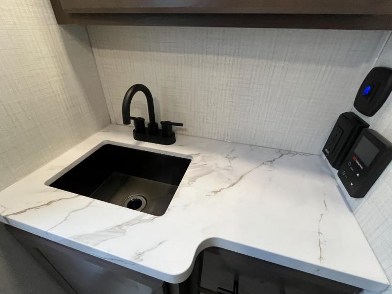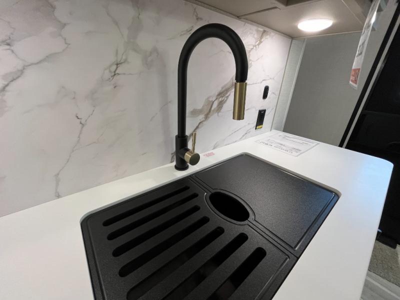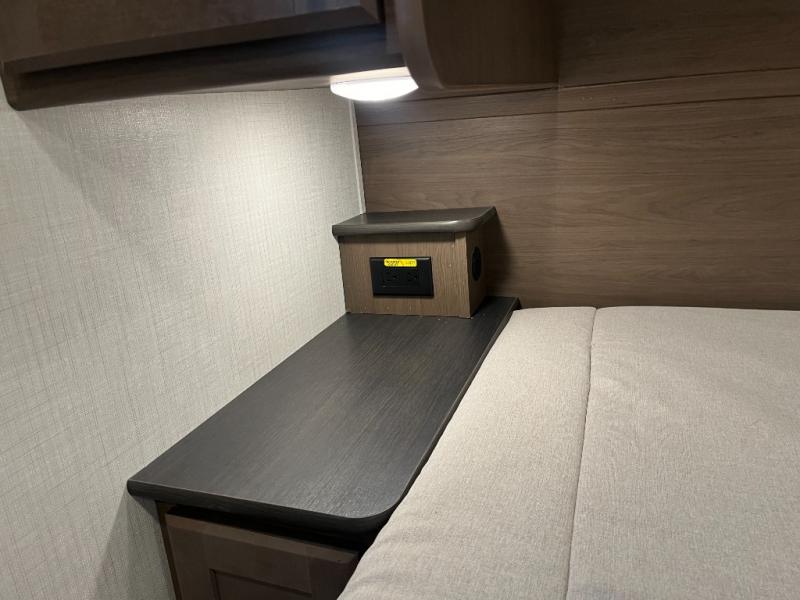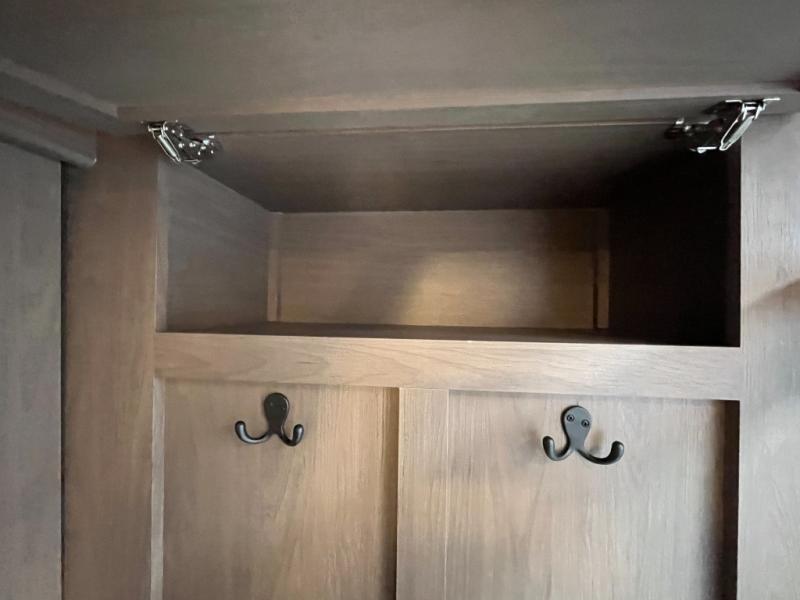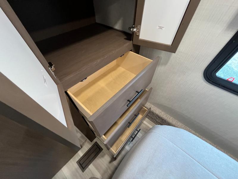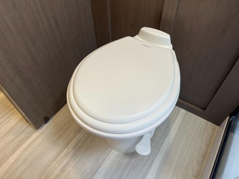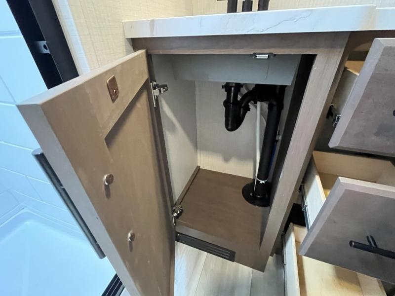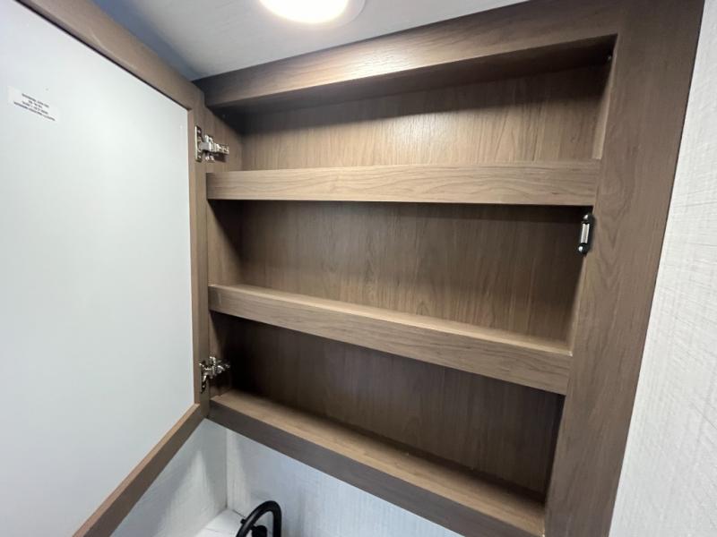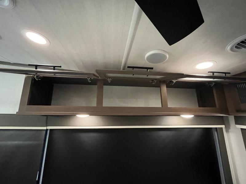 Comfort is just a step away in this fifth wheel with a large slide out. Here, you'll find the hidden pantry behind the pivoting entertainment door plus your kitchen appliances. The stainless steel sink will let you easily clean up, and the pivot dinette with two extra folding chairs provides versatile space to dine or work. Your crew can get comfortable on the L-shaped sofa after dinner, or head outdoors under the 18' power awning. A full bath lets you clean up after a day at the lake, and the front private bedroom with a king bed gives you your own space at night. There are also dual wardrobes and nightstands plus a wardrobe with washer and dryer prep for the option to go full-time!