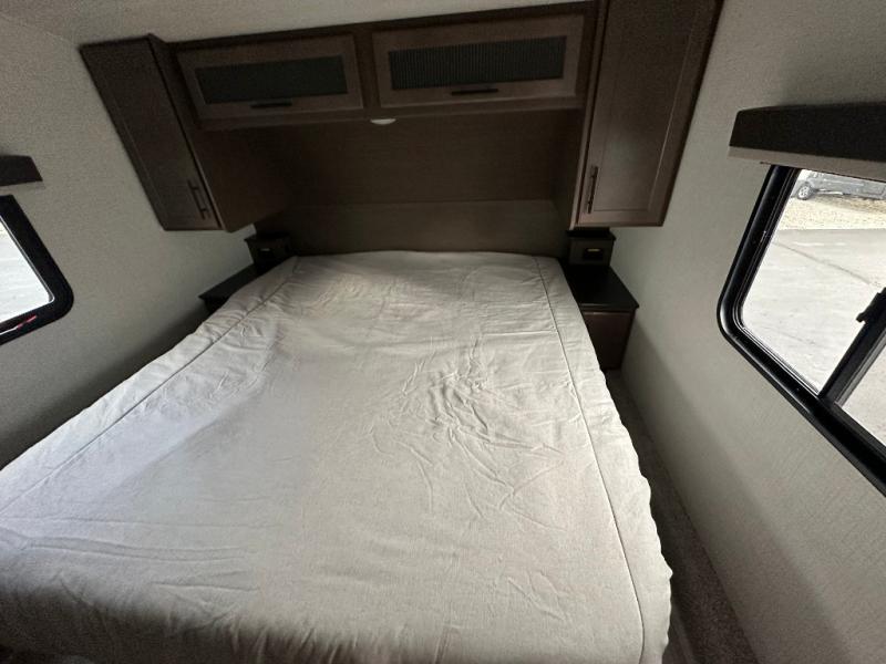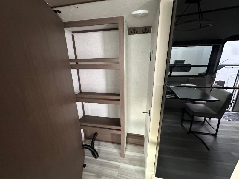 Comfort is just a step away in this fifth wheel with a large slide out. Here, you'll find the hidden pantry behind the pivoting entertainment door plus your kitchen appliances. The stainless steel sink will let you easily clean up, and the pivot dinette with two extra folding chairs provides versatile space to dine or work. Your crew can get comfortable on the L-shaped sofa after dinner, or head outdoors under the 18' power awning. A full bath lets you clean up after a day at the lake, and the front private bedroom with a king bed gives you your own space at night. There are also dual wardrobes and nightstands plus a wardrobe with washer and dryer prep for the option to go full-time!