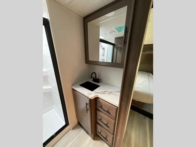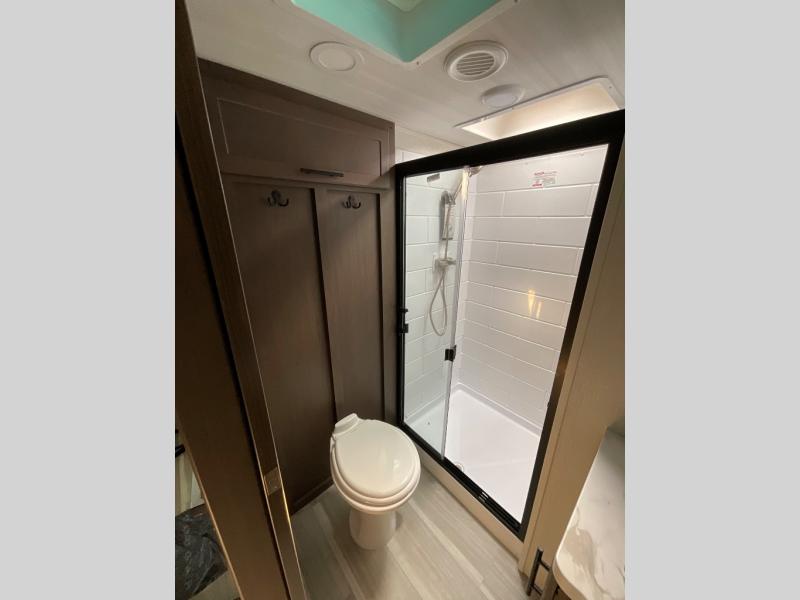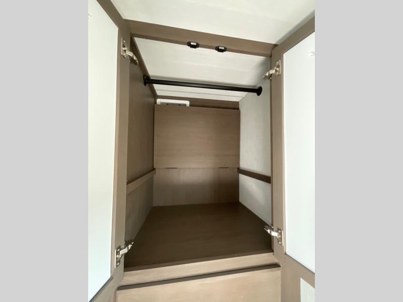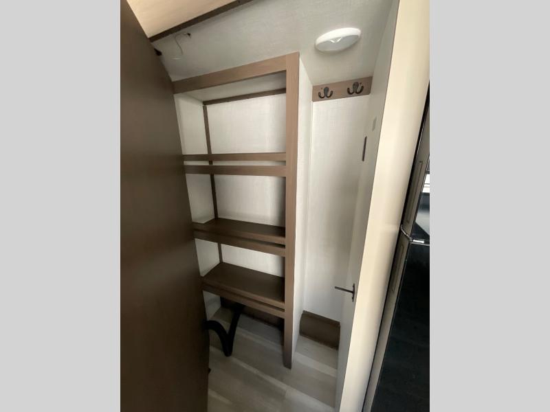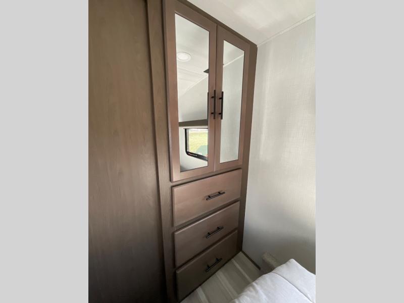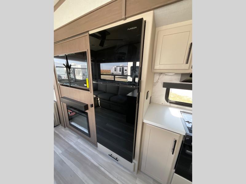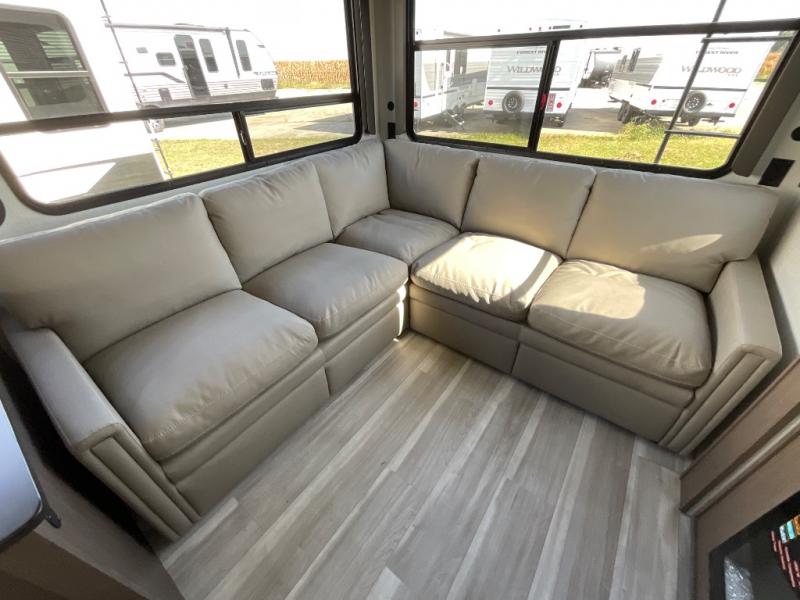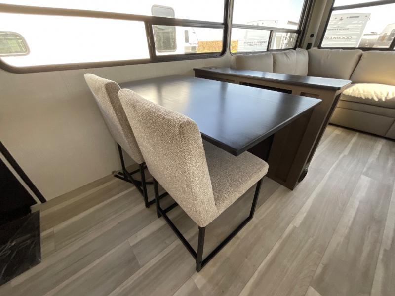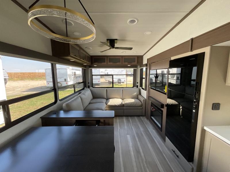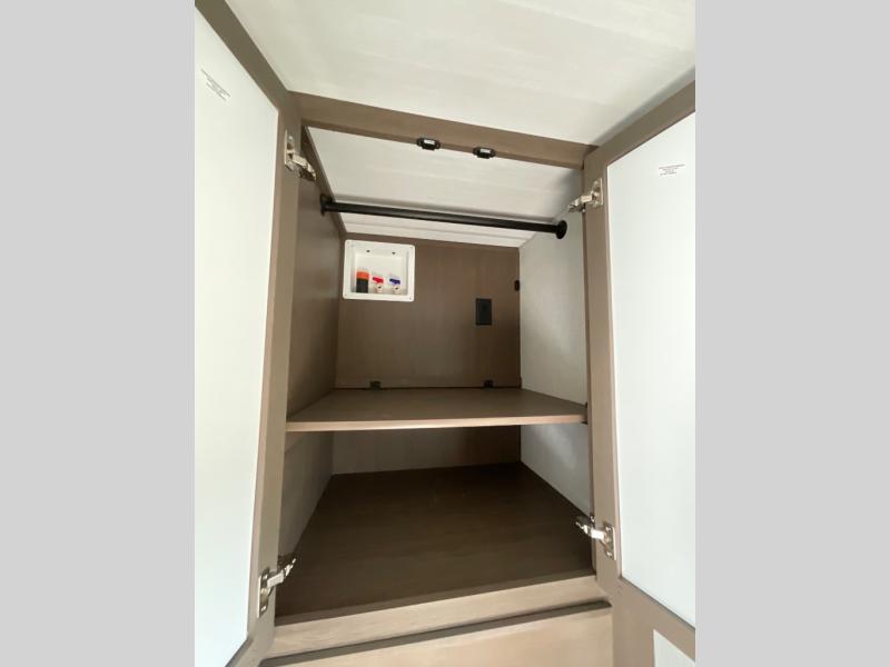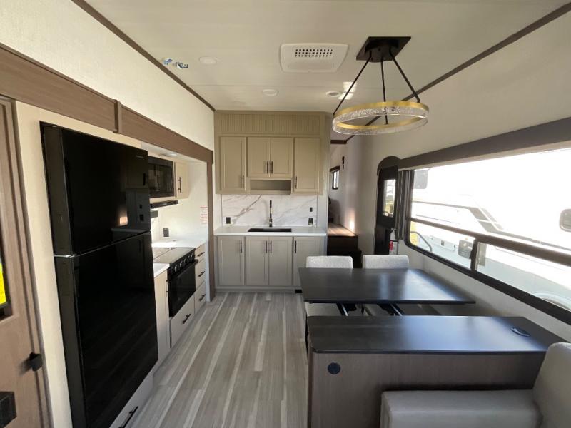 Comfort is just a step away in this fifth wheel with a large slide out. Here, you'll find the hidden pantry behind the pivoting entertainment door plus your kitchen appliances. The stainless steel sink will let you easily clean up, and the pivot dinette with two extra folding chairs provides versatile space to dine or work. Your crew can get comfortable on the L-shaped sofa after dinner, or head outdoors under the 18' power awning. A full bath lets you clean up after a day at the lake, and the front private bedroom with a king bed gives you your own space at night. There are also dual wardrobes and nightstands plus a wardrobe with washer and dryer prep for the option to go full-time!