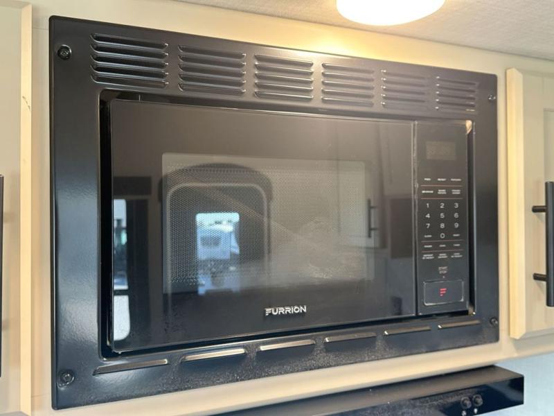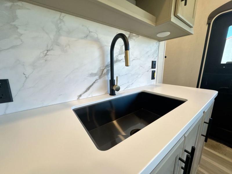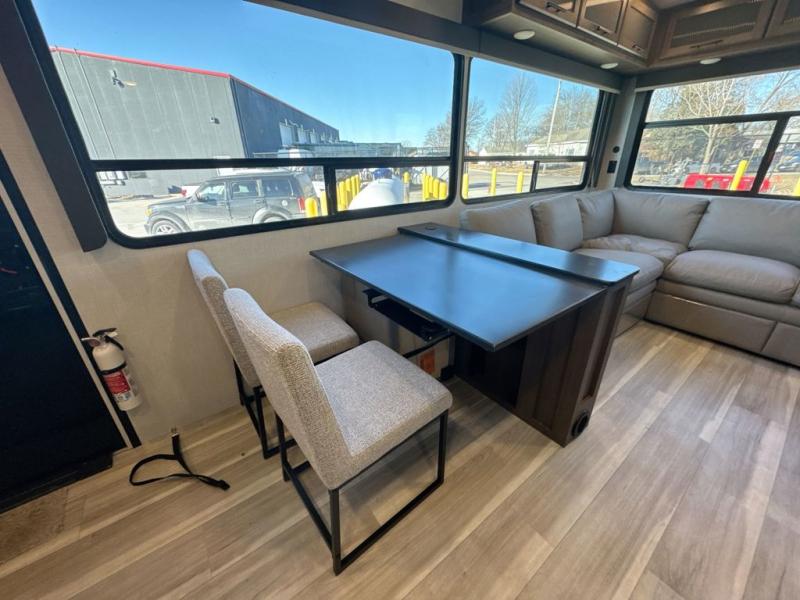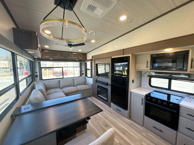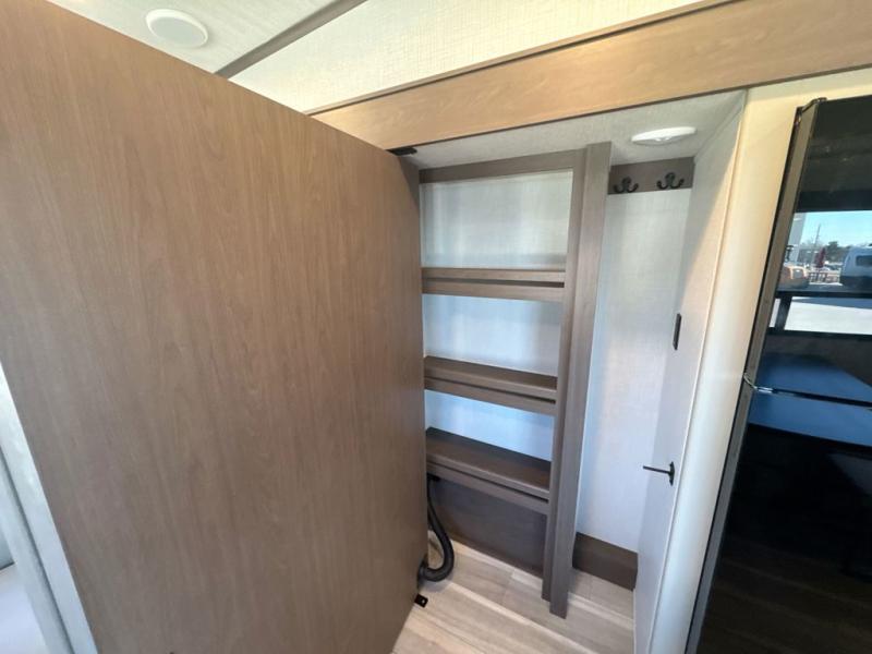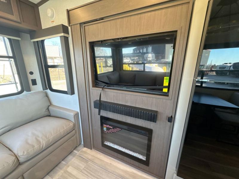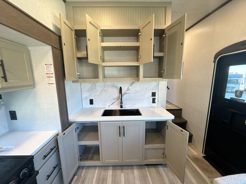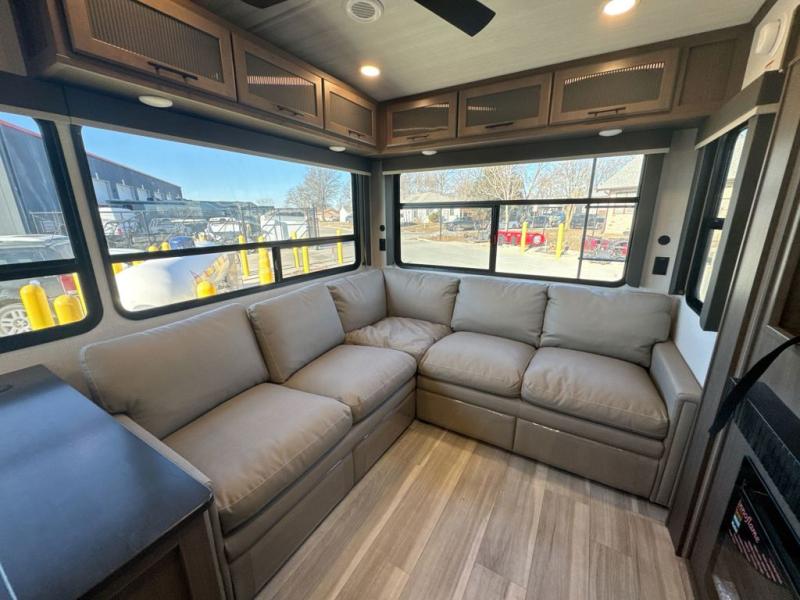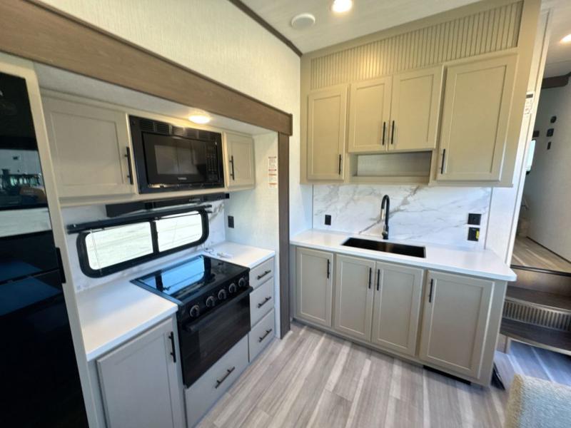 Comfort is just a step away in this fifth wheel with a large slide out. Here, you'll find the hidden pantry behind the pivoting entertainment door plus your kitchen appliances. The stainless steel sink will let you easily clean up, and the pivot dinette with two extra folding chairs provides versatile space to dine or work. Your crew can get comfortable on the L-shaped sofa after dinner, or head outdoors under the 18' power awning. A full bath lets you clean up after a day at the lake, and the front private bedroom with a king bed gives you your own space at night. There are also dual wardrobes and nightstands plus a wardrobe with washer and dryer prep for the option to go full-time!