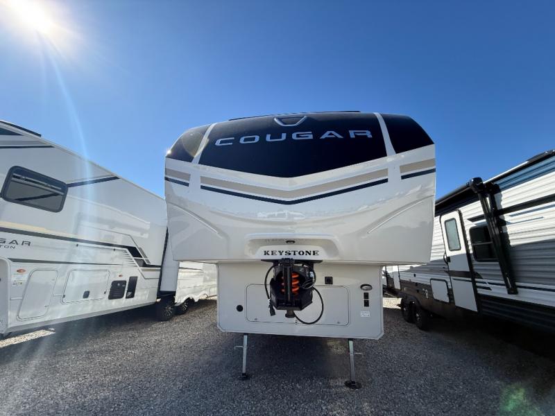 The Keystone Cougar Half-Ton fifth wheel and travel trailers are known as one of America's favorites for a reason! Some of those reasons are the exclusive features that come from Keystone, like the Winegard Air 360+ omni-directional rooftop antenna, the in-floor heating ducts, and the HyperCore composite wall construction with Vixen Fibrogloss high-gloss finish. The Cougar Half-Ton has a Climate Guard protection package with heat-deflecting white sidewalls, two roof attic vents, PEX plumbing and more to enjoy four season camping. Inside, you'll love the dimmable lighting, night roller shades throughout, shower skylight, and bedside USB outlets to keep your electronics charged.