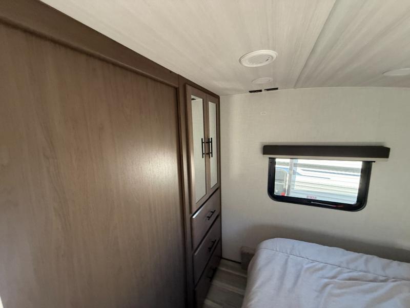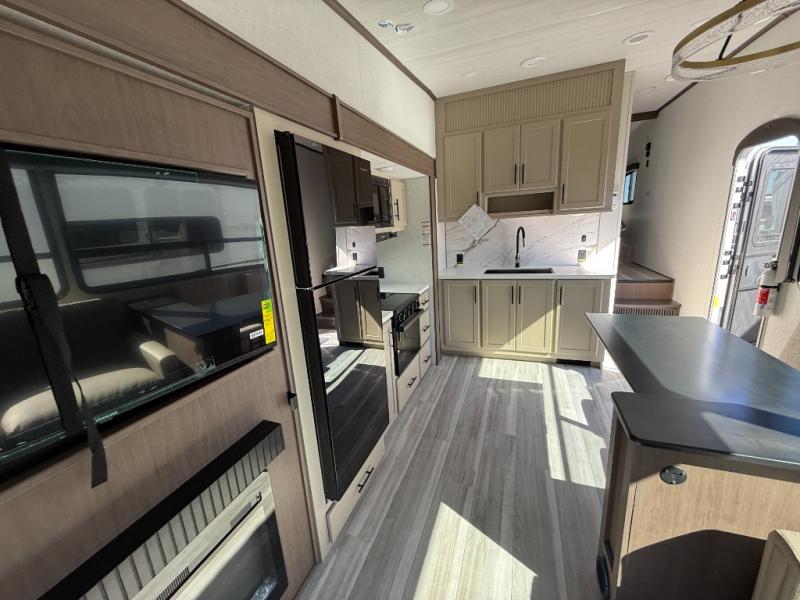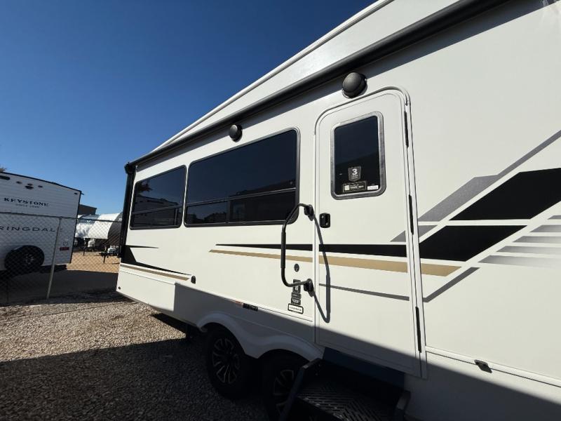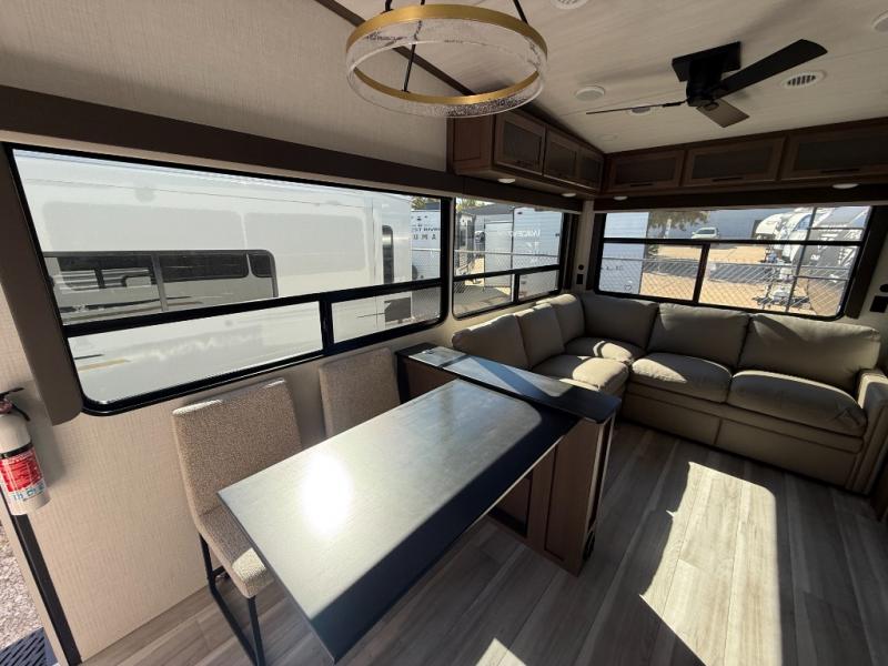 Comfort is just a step away in this fifth wheel with a large slide out. Here, you'll find the hidden pantry behind the pivoting entertainment door plus your kitchen appliances. The stainless steel sink will let you easily clean up, and the pivot dinette with two extra folding chairs provides versatile space to dine or work. Your crew can get comfortable on the L-shaped sofa after dinner, or head outdoors under the 18' power awning. A full bath lets you clean up after a day at the lake, and the front private bedroom with a king bed gives you your own space at night. There are also dual wardrobes and nightstands plus a wardrobe with washer and dryer prep for the option to go full-time!
