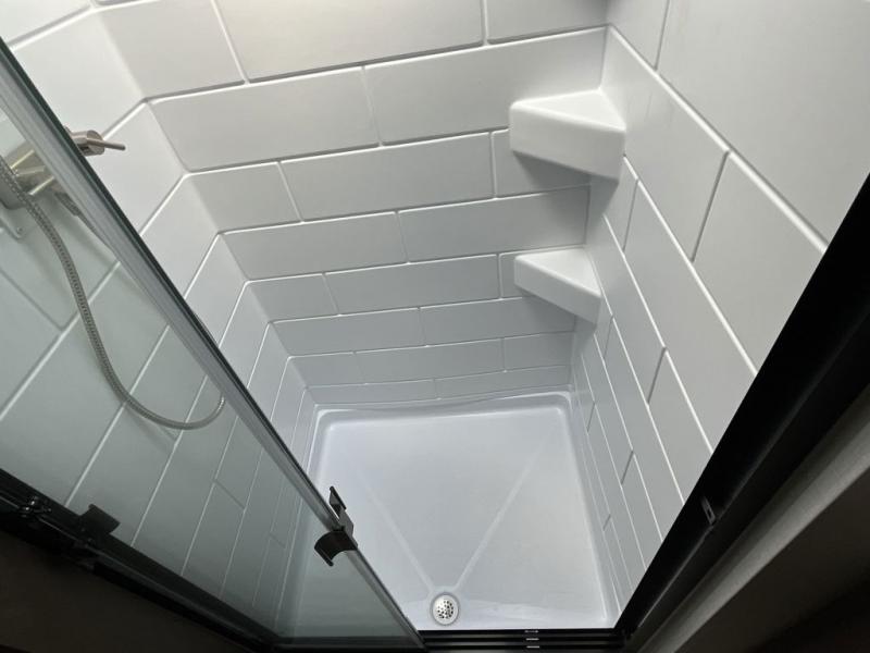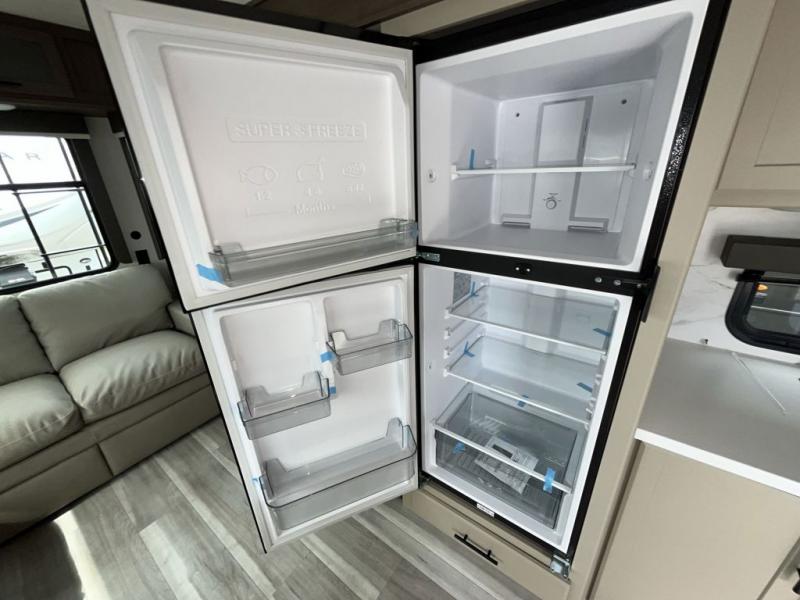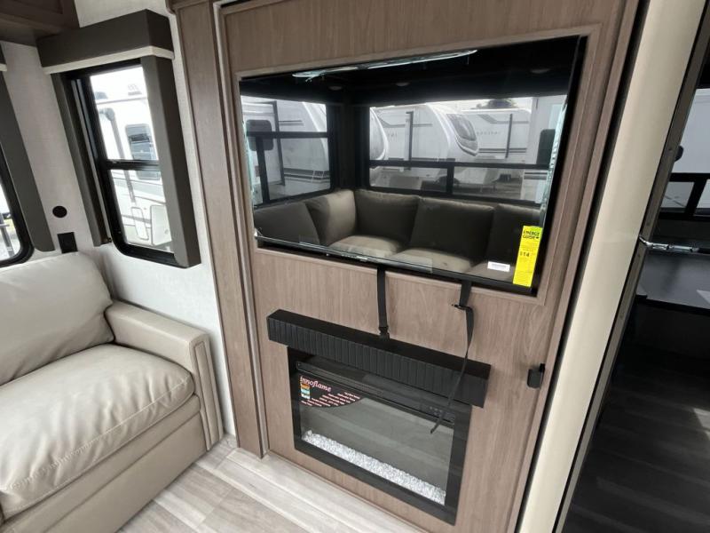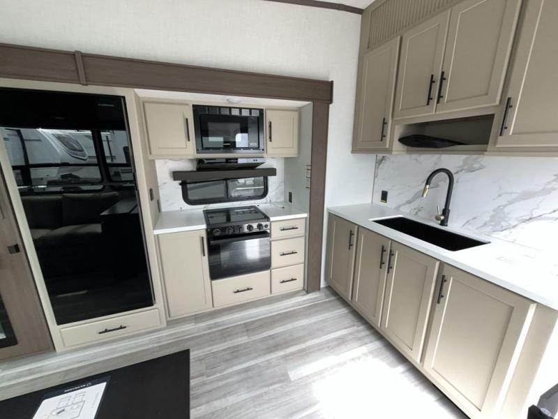 Comfort is just a step away in this fifth wheel with a large slide out. Here, you'll find the hidden pantry behind the pivoting entertainment door plus your kitchen appliances. The stainless steel sink will let you easily clean up, and the pivot dinette with two extra folding chairs provides versatile space to dine or work. Your crew can get comfortable on the L-shaped sofa after dinner, or head outdoors under the 18' power awning. A full bath lets you clean up after a day at the lake, and the front private bedroom with a king bed gives you your own space at night. There are also dual wardrobes and nightstands plus a wardrobe with washer and dryer prep for the option to go full-time!