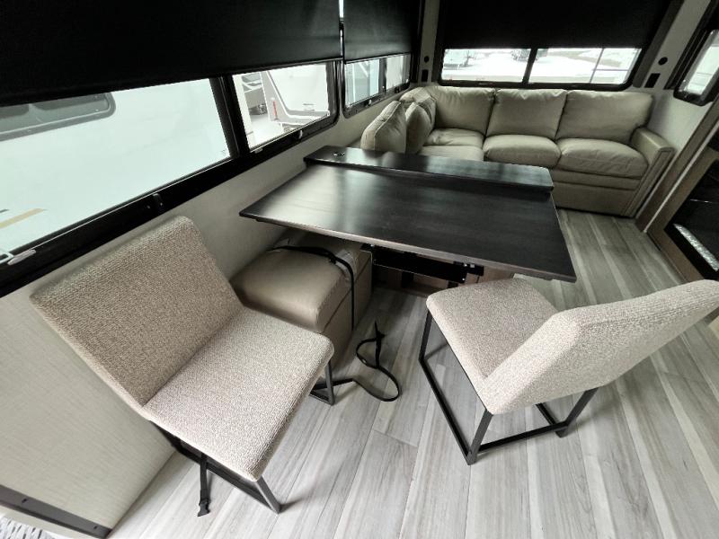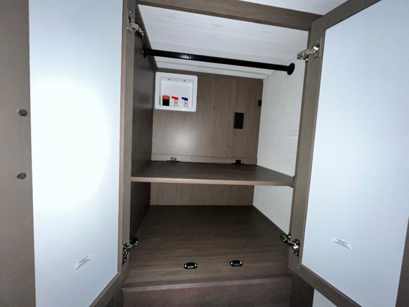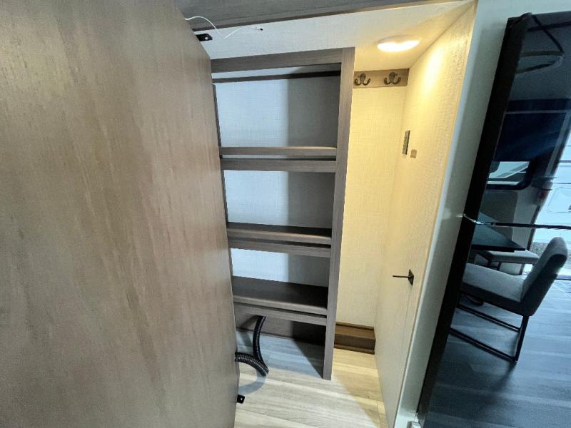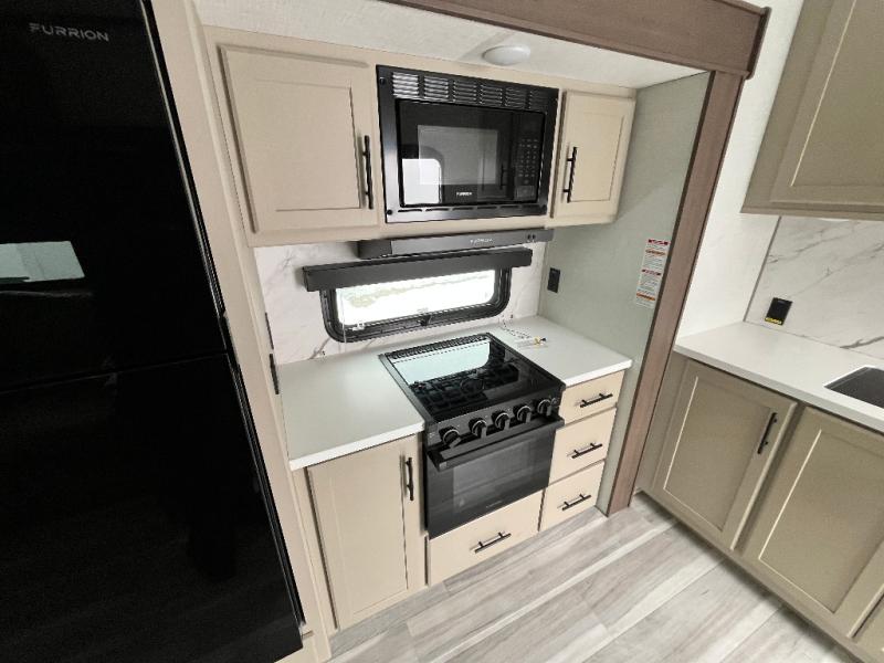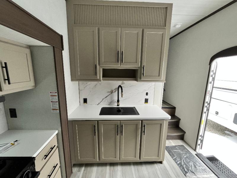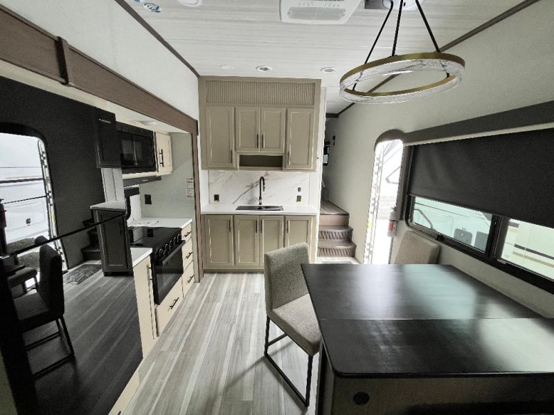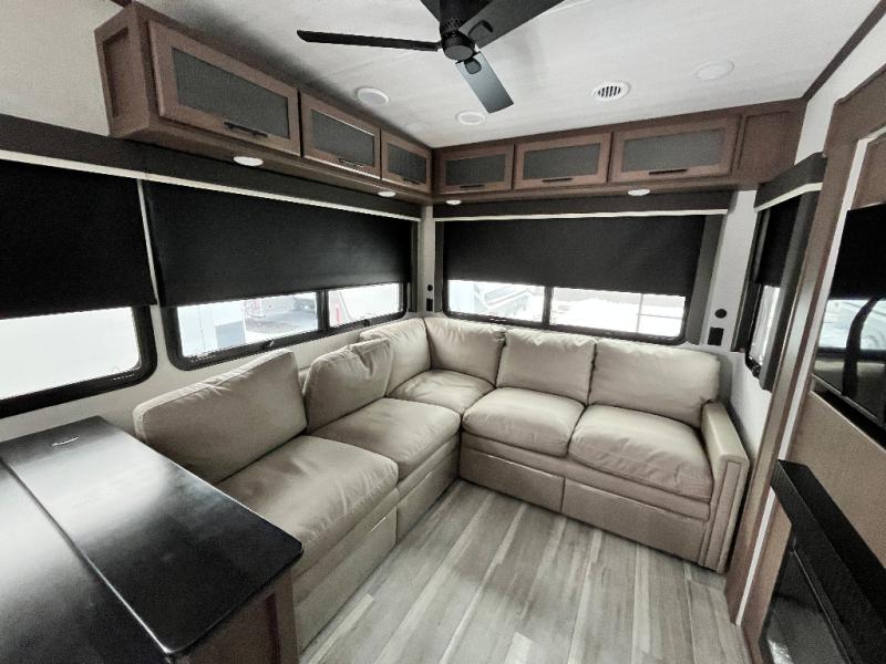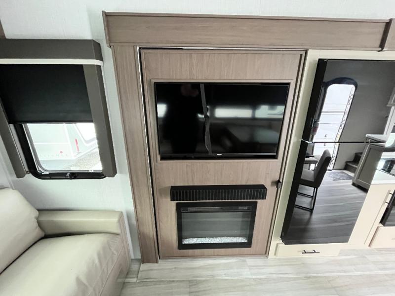 Comfort is just a step away in this fifth wheel with a large slide out. Here, you'll find the hidden pantry behind the pivoting entertainment door plus your kitchen appliances. The stainless steel sink will let you easily clean up, and the pivot dinette with two extra folding chairs provides versatile space to dine or work. Your crew can get comfortable on the L-shaped sofa after dinner, or head outdoors under the 18' power awning. A full bath lets you clean up after a day at the lake, and the front private bedroom with a king bed gives you your own space at night. There are also dual wardrobes and nightstands plus a wardrobe with washer and dryer prep for the option to go full-time!