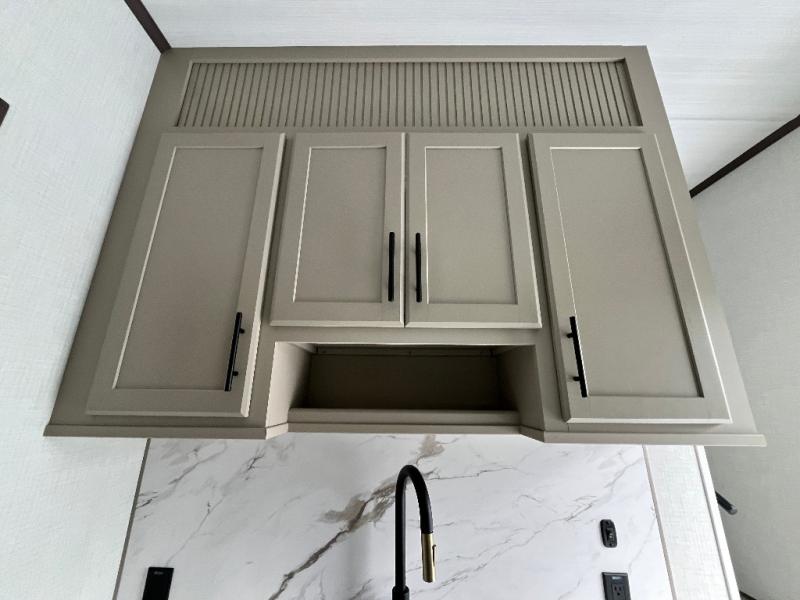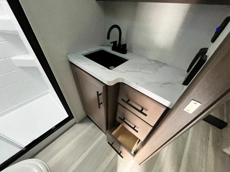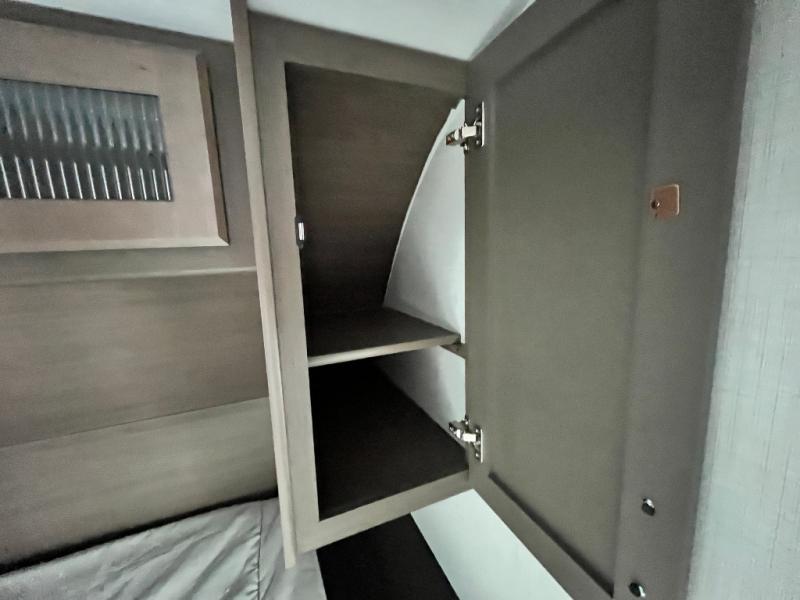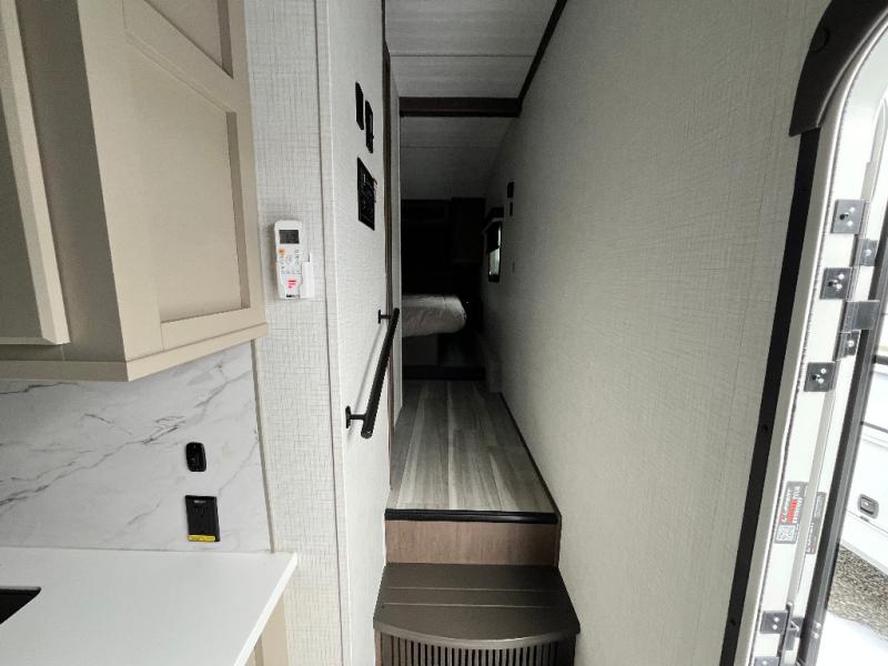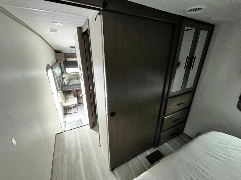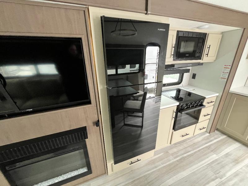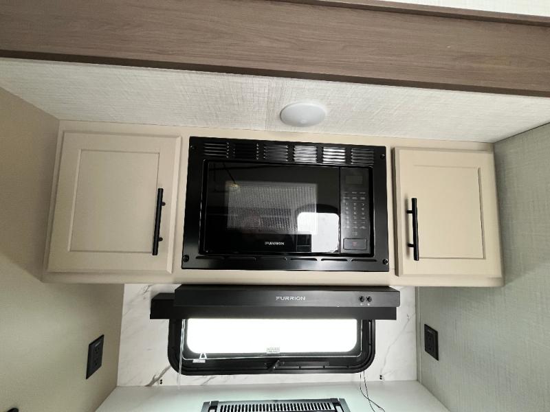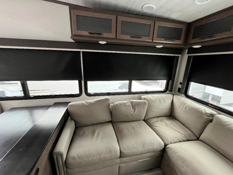 Comfort is just a step away in this fifth wheel with a large slide out. Here, you'll find the hidden pantry behind the pivoting entertainment door plus your kitchen appliances. The stainless steel sink will let you easily clean up, and the pivot dinette with two extra folding chairs provides versatile space to dine or work. Your crew can get comfortable on the L-shaped sofa after dinner, or head outdoors under the 18' power awning. A full bath lets you clean up after a day at the lake, and the front private bedroom with a king bed gives you your own space at night. There are also dual wardrobes and nightstands plus a wardrobe with washer and dryer prep for the option to go full-time!