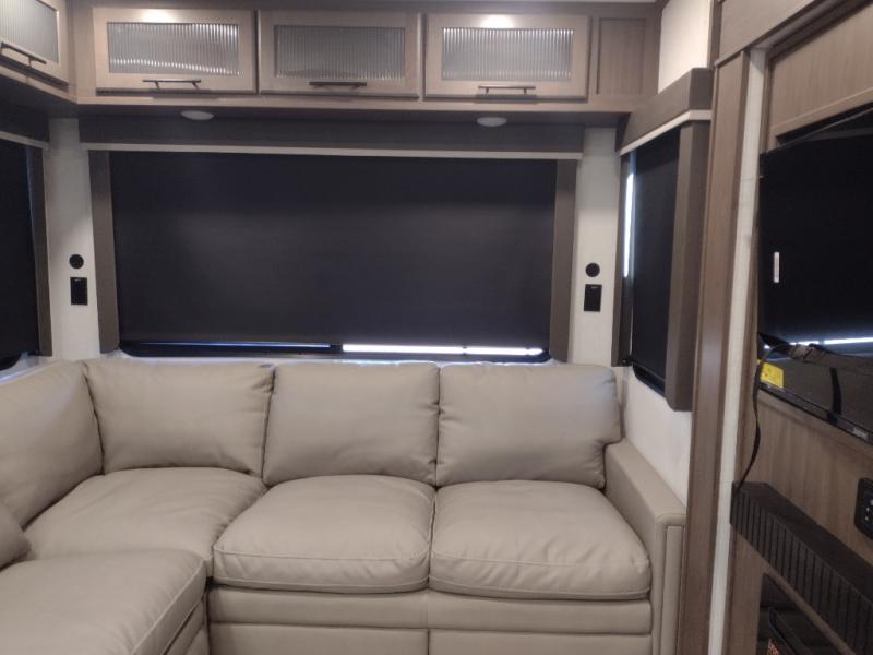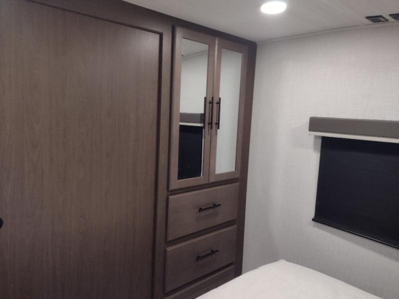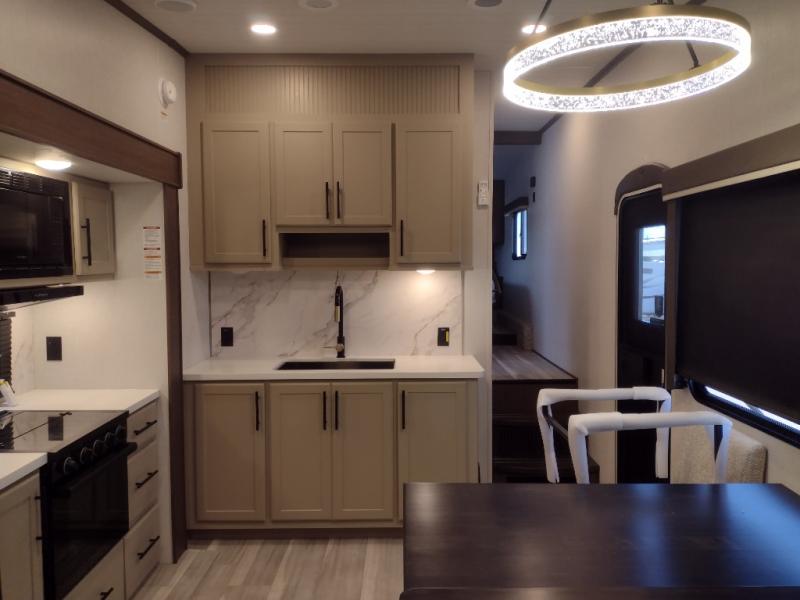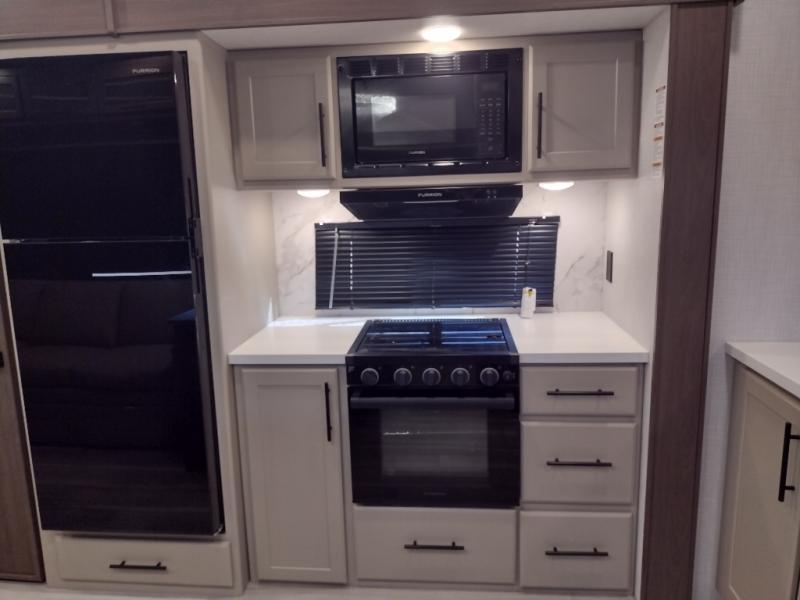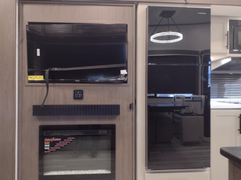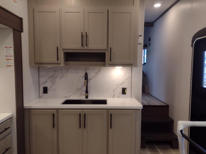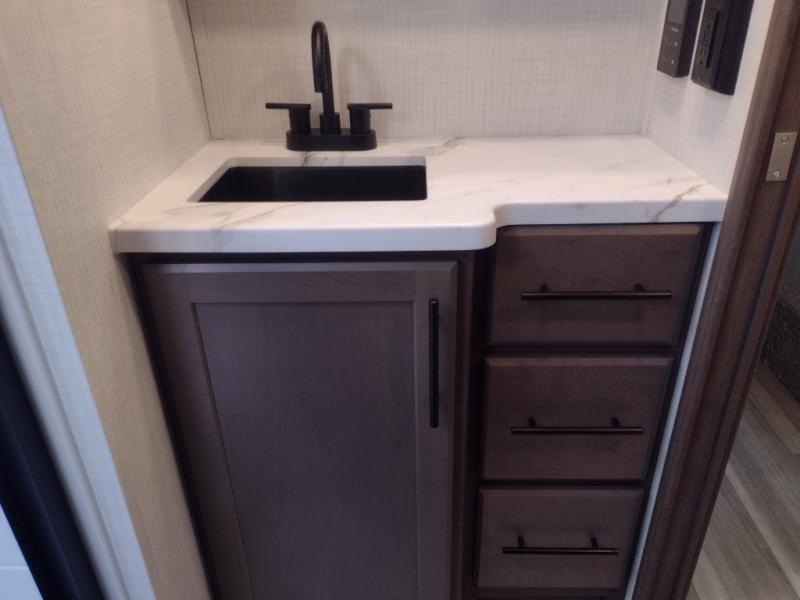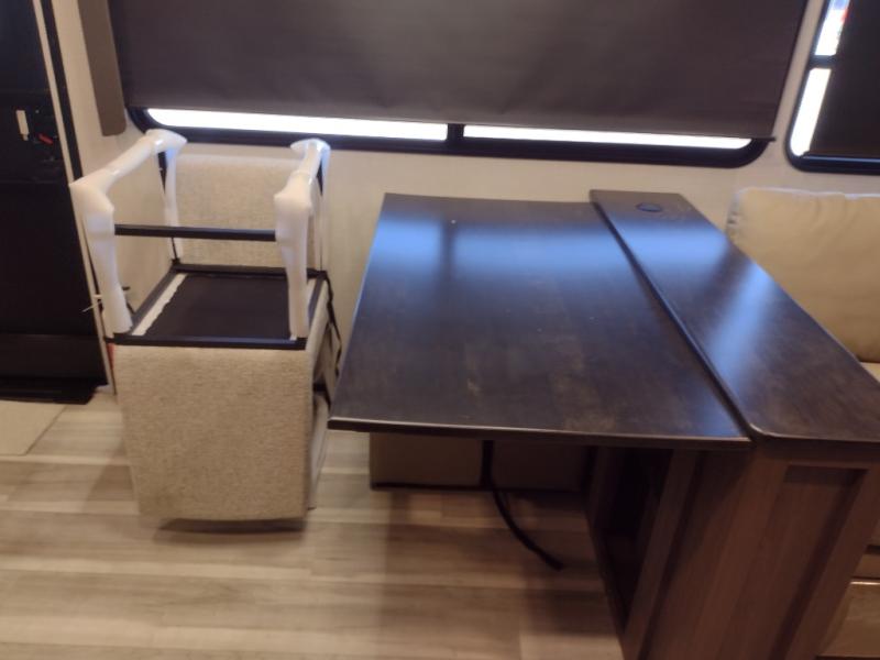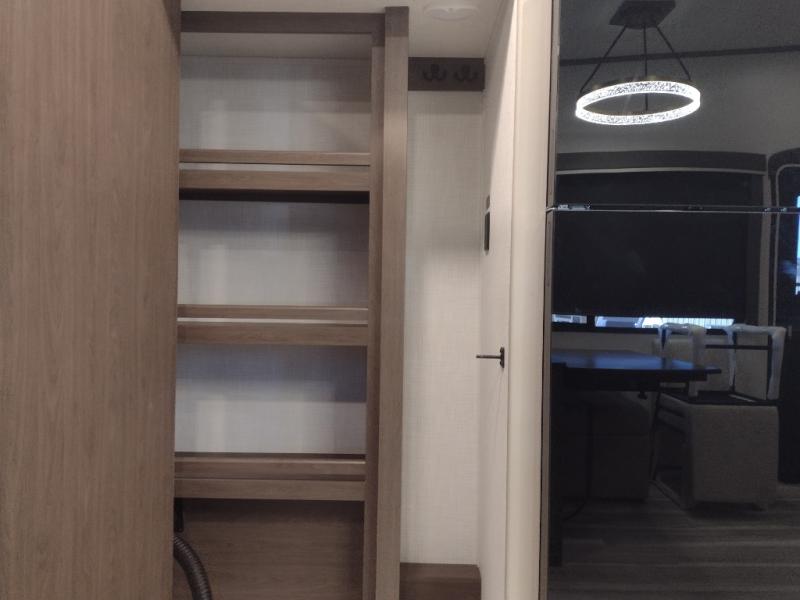 Comfort is just a step away in this fifth wheel with a large slide out. Here, you'll find the hidden pantry behind the pivoting entertainment door plus your kitchen appliances. The stainless steel sink will let you easily clean up, and the pivot dinette with two extra folding chairs provides versatile space to dine or work. Your crew can get comfortable on the L-shaped sofa after dinner, or head outdoors under the 18' power awning. A full bath lets you clean up after a day at the lake, and the front private bedroom with a king bed gives you your own space at night. There are also dual wardrobes and nightstands plus a wardrobe with washer and dryer prep for the option to go full-time!