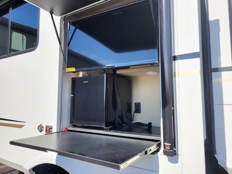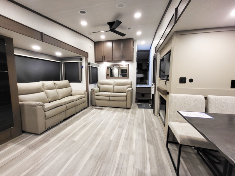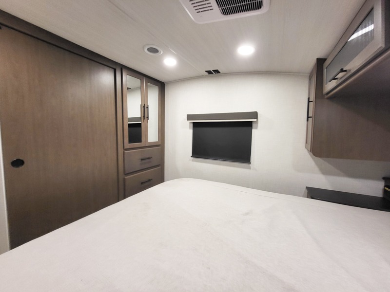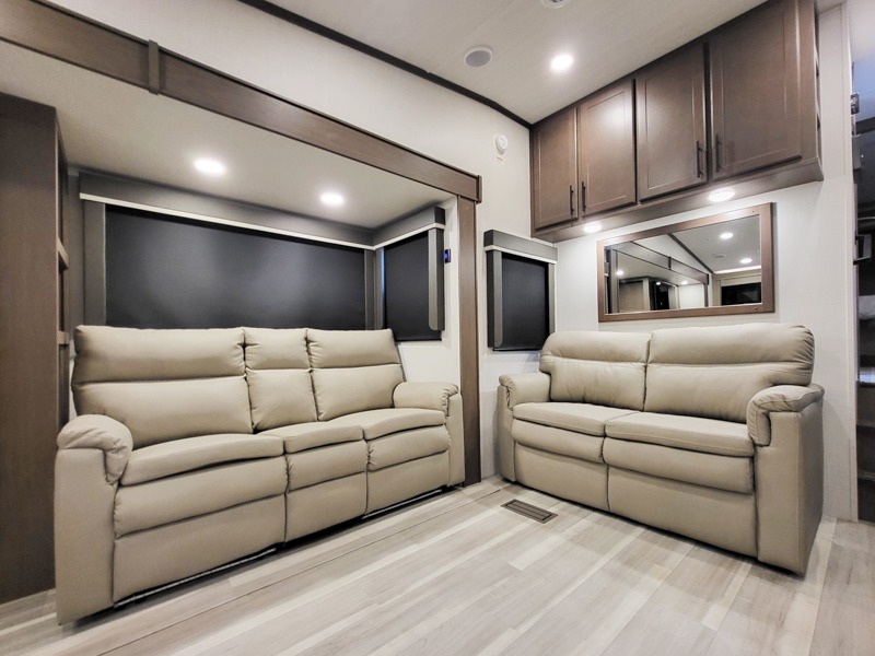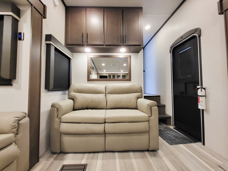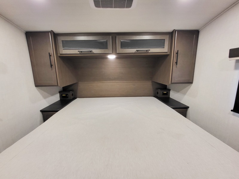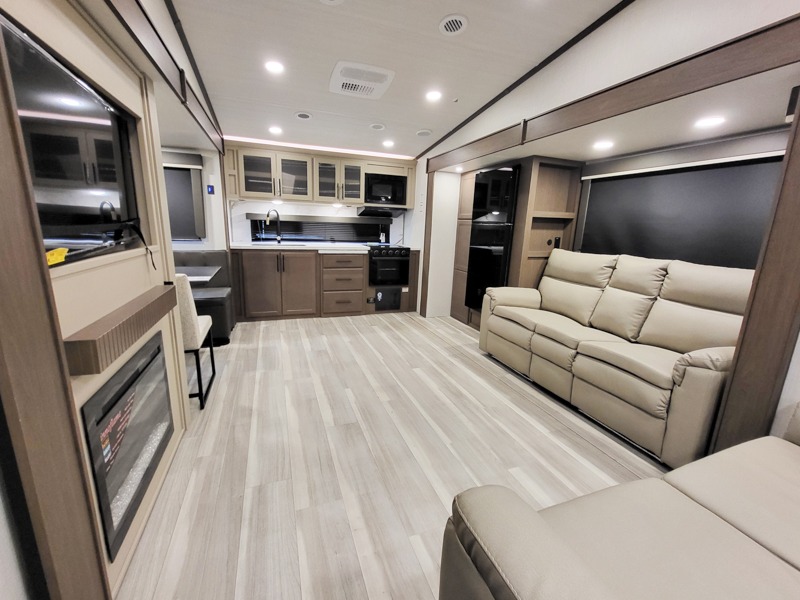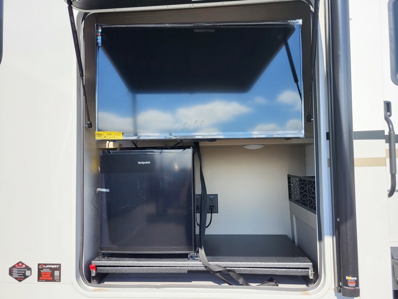 Time spent at the campground in this fifth wheel will be time well spent! Once you arrive, you can unload the unobstructed pass-thru storage, put out the two power awnings, and grab a cold drink from the outdoor mini refrigerator. Head inside to relax on the tri-fold sleeper sofa or theater seating across from the LED HDTV. The rear kitchen includes everything you need to make meals each day, including a pull-out countertop for more space plus a pantry and 12V refrigerator for food storage. The full bath with a 30" x 36" shower will let you freshen up before bed, and speaking of bedtime, the king bed in the front private bedroom is sure to bring a great night's rest. There are also dual wardrobes and nightstands here for your things, plus a third wardrobe with washer and dryer prep if you want to add these appliances.