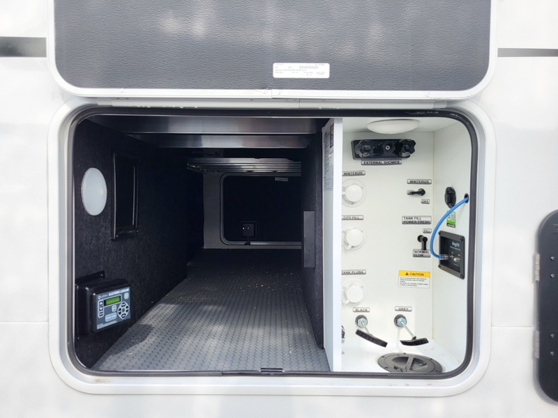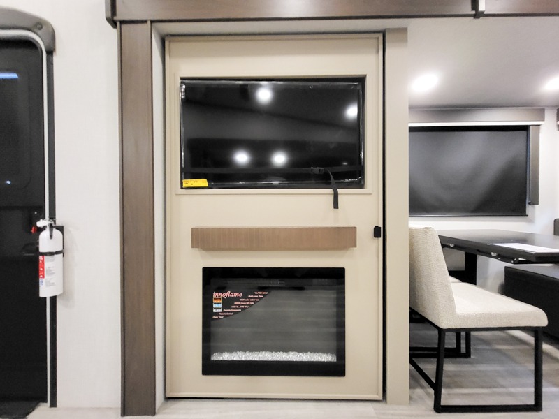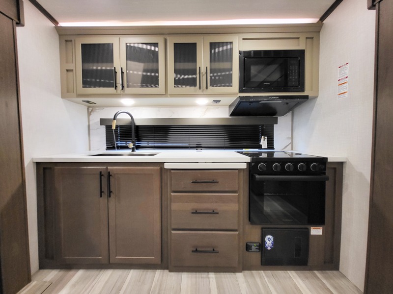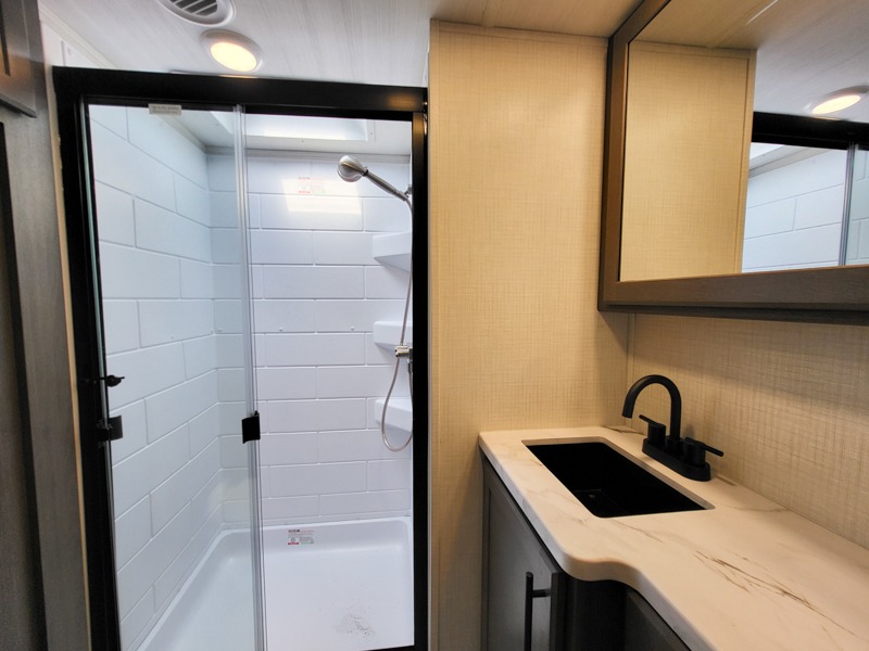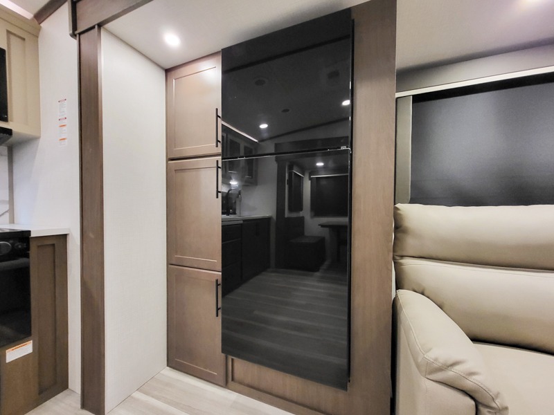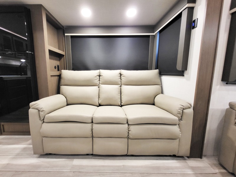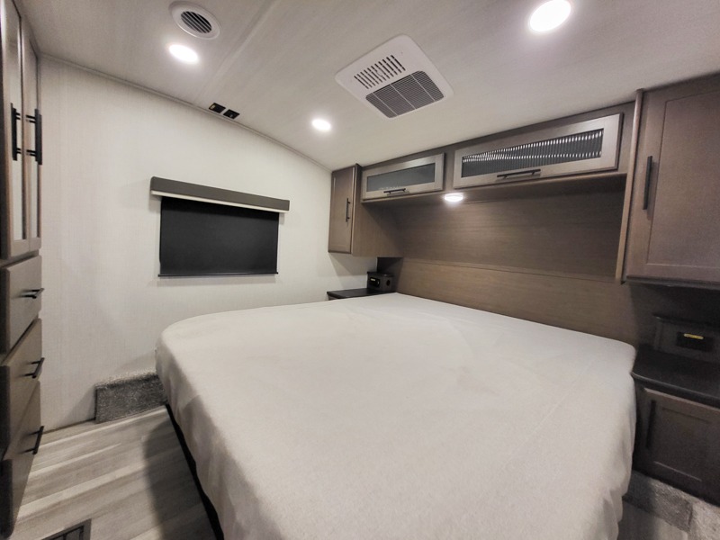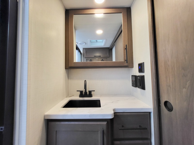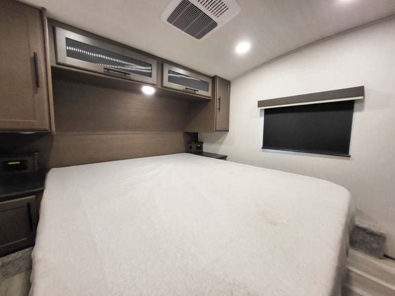 Time spent at the campground in this fifth wheel will be time well spent! Once you arrive, you can unload the unobstructed pass-thru storage, put out the two power awnings, and grab a cold drink from the outdoor mini refrigerator. Head inside to relax on the tri-fold sleeper sofa or theater seating across from the LED HDTV. The rear kitchen includes everything you need to make meals each day, including a pull-out countertop for more space plus a pantry and 12V refrigerator for food storage. The full bath with a 30" x 36" shower will let you freshen up before bed, and speaking of bedtime, the king bed in the front private bedroom is sure to bring a great night's rest. There are also dual wardrobes and nightstands here for your things, plus a third wardrobe with washer and dryer prep if you want to add these appliances.