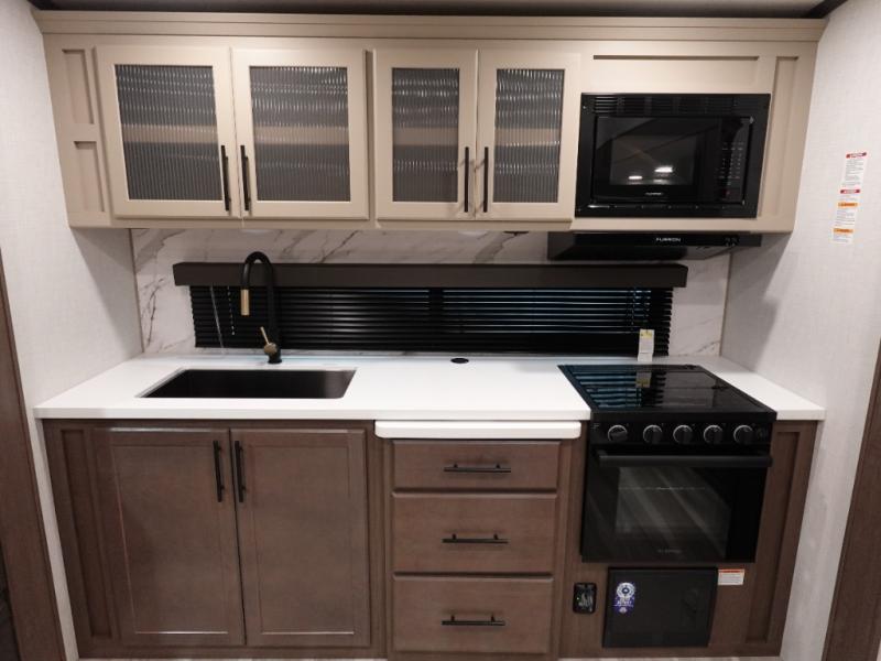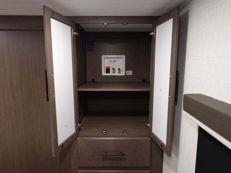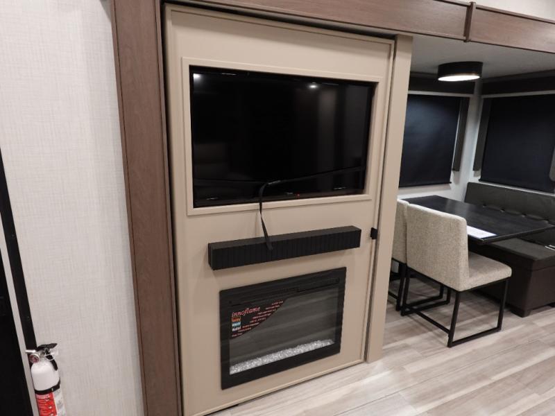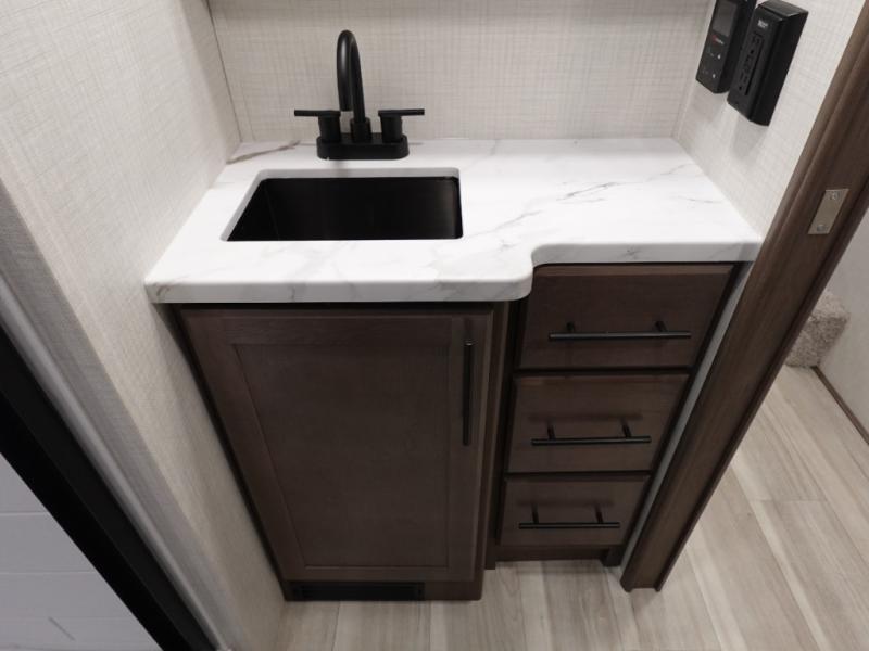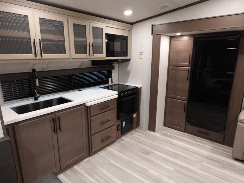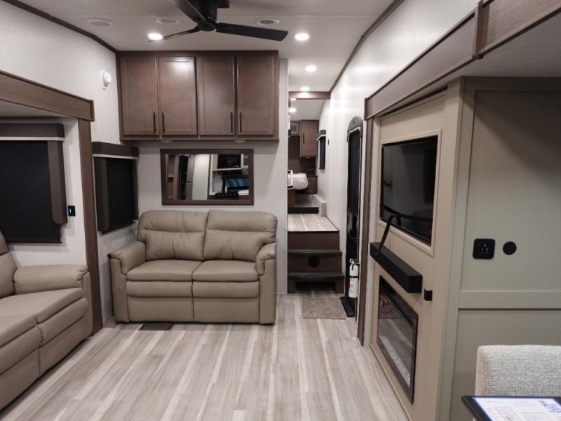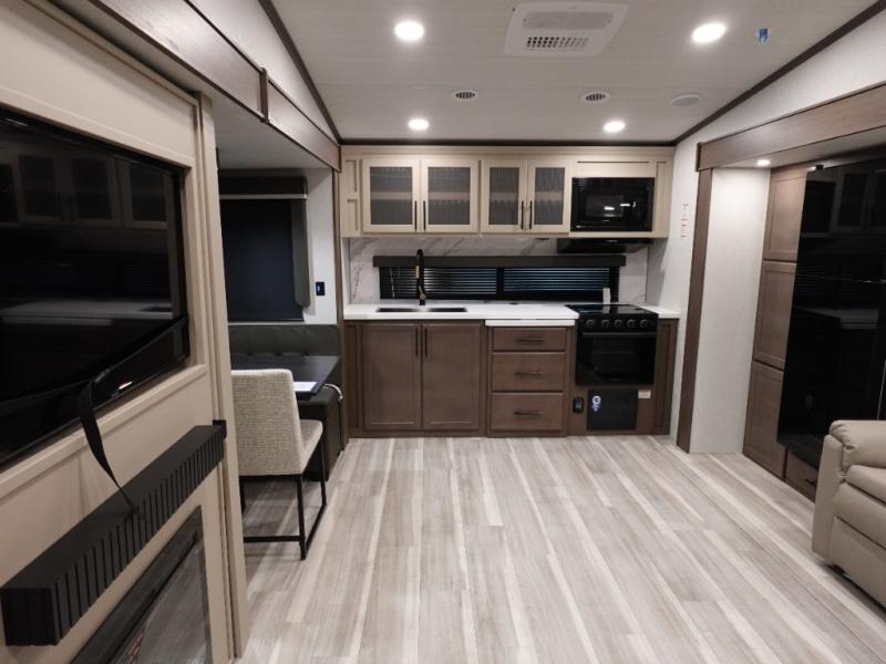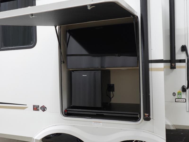 Time spent at the campground in this fifth wheel will be time well spent! Once you arrive, you can unload the unobstructed pass-thru storage, put out the two power awnings, and grab a cold drink from the outdoor mini refrigerator. Head inside to relax on the tri-fold sleeper sofa or theater seating across from the LED HDTV. The rear kitchen includes everything you need to make meals each day, including a pull-out countertop for more space plus a pantry and 12V refrigerator for food storage. The full bath with a 30" x 36" shower will let you freshen up before bed, and speaking of bedtime, the king bed in the front private bedroom is sure to bring a great night's rest. There are also dual wardrobes and nightstands here for your things, plus a third wardrobe with washer and dryer prep if you want to add these appliances.