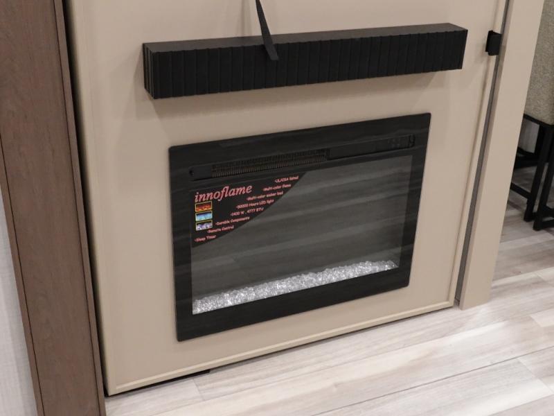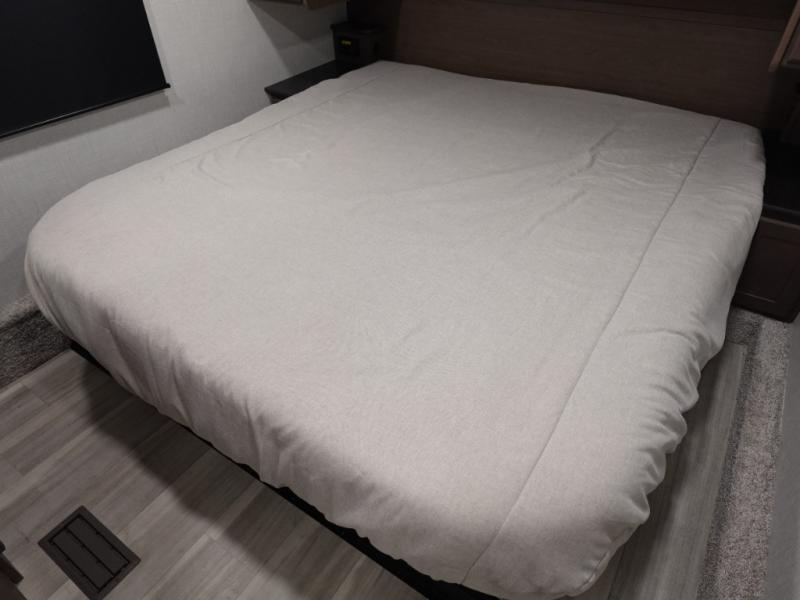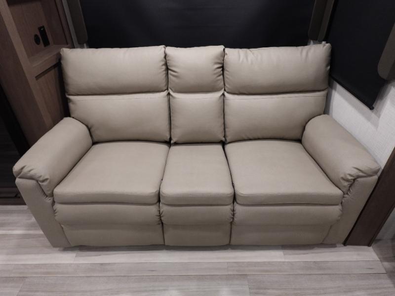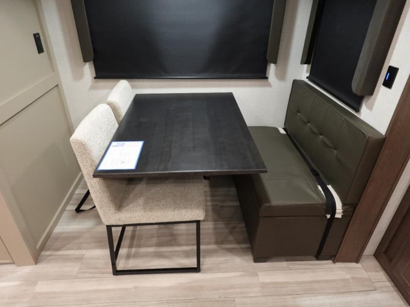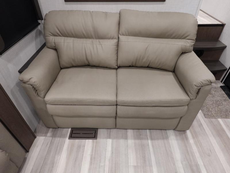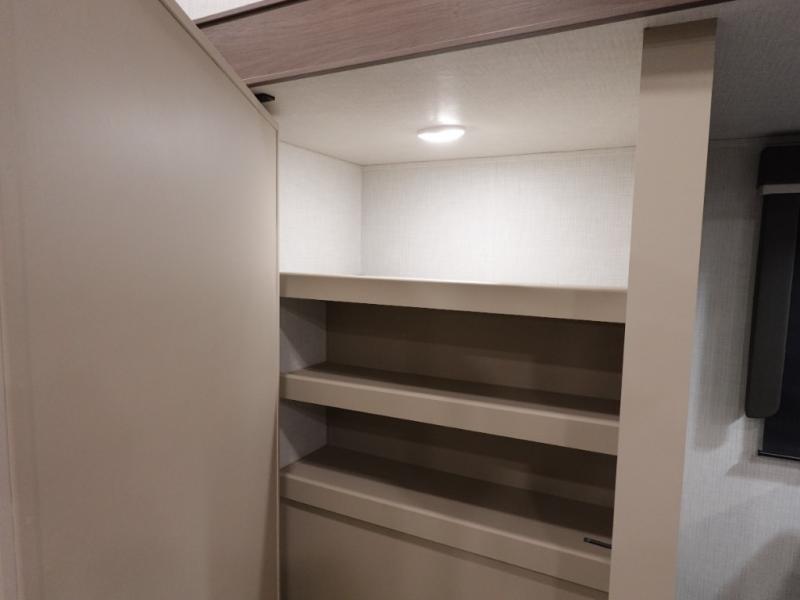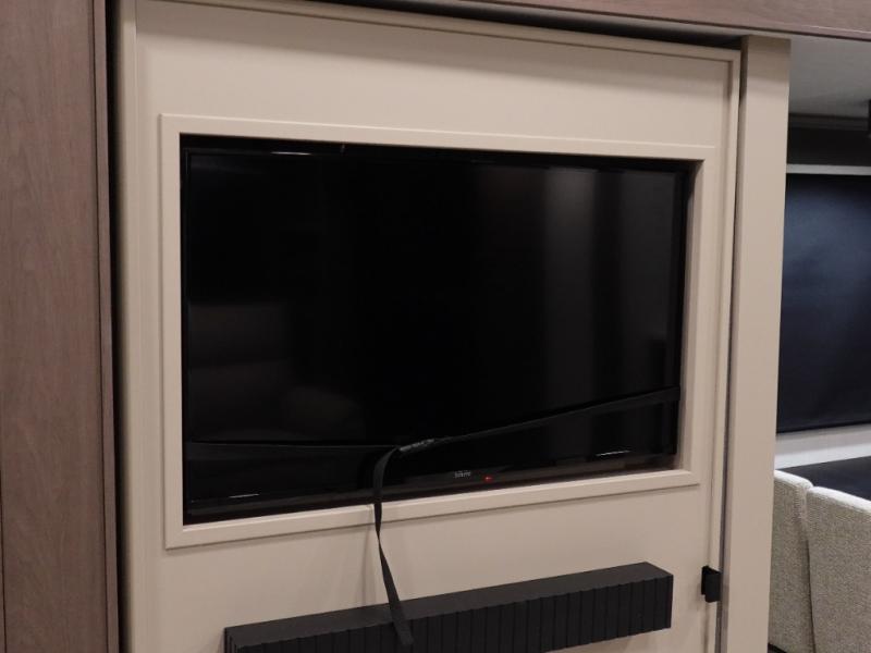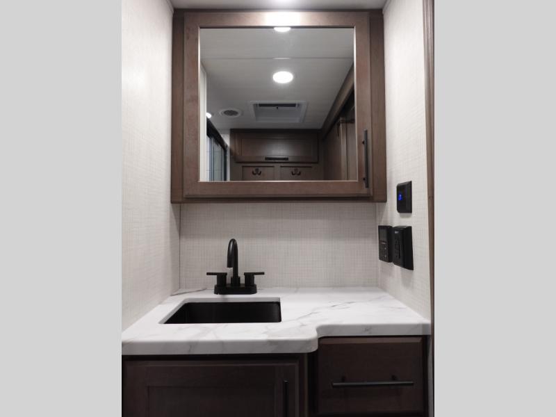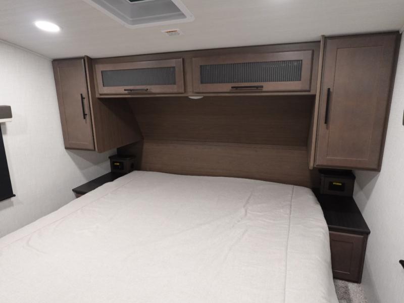 Time spent at the campground in this fifth wheel will be time well spent! Once you arrive, you can unload the unobstructed pass-thru storage, put out the two power awnings, and grab a cold drink from the outdoor mini refrigerator. Head inside to relax on the tri-fold sleeper sofa or theater seating across from the LED HDTV. The rear kitchen includes everything you need to make meals each day, including a pull-out countertop for more space plus a pantry and 12V refrigerator for food storage. The full bath with a 30" x 36" shower will let you freshen up before bed, and speaking of bedtime, the king bed in the front private bedroom is sure to bring a great night's rest. There are also dual wardrobes and nightstands here for your things, plus a third wardrobe with washer and dryer prep if you want to add these appliances.