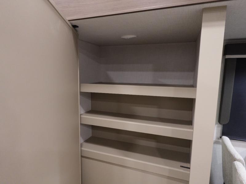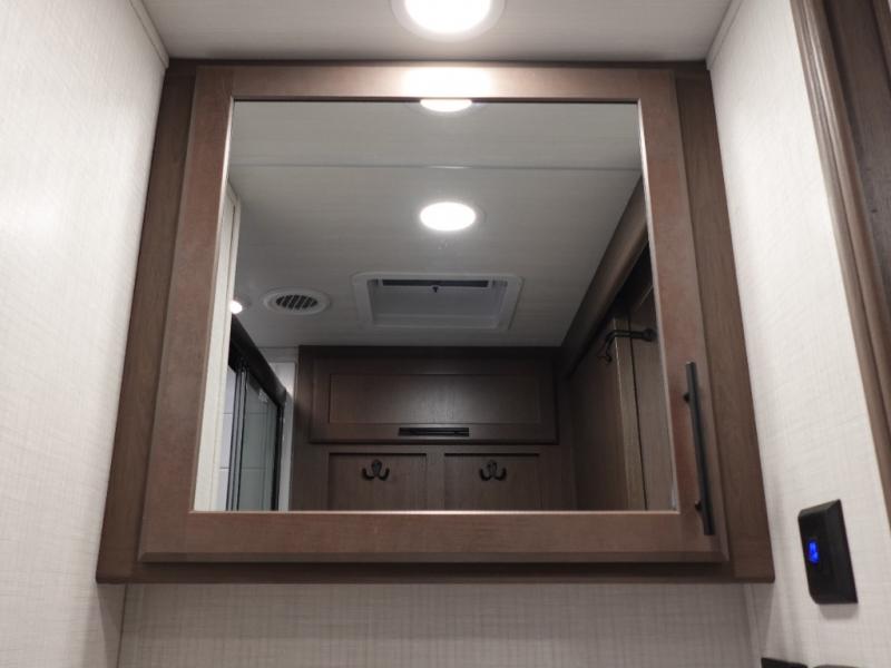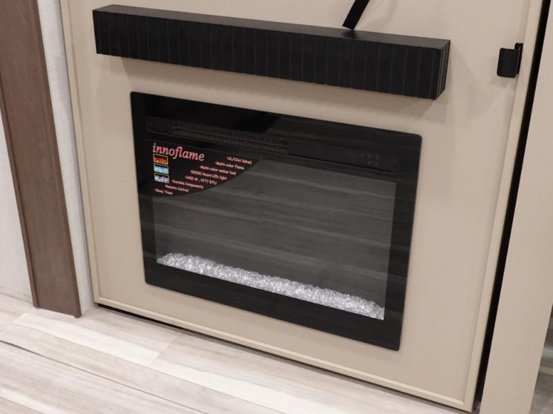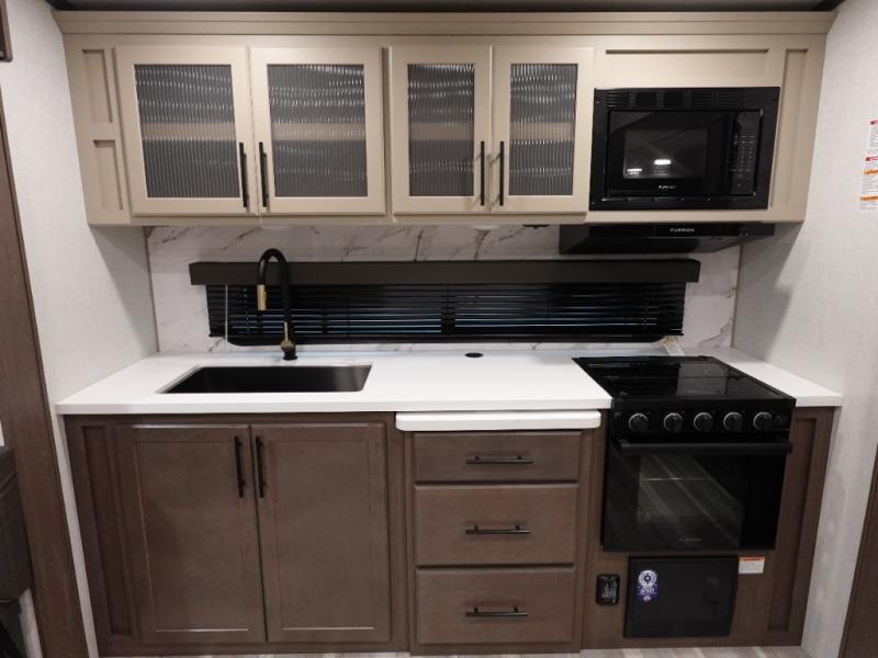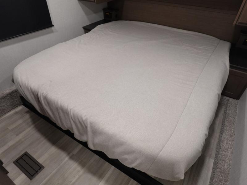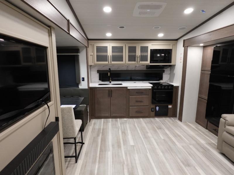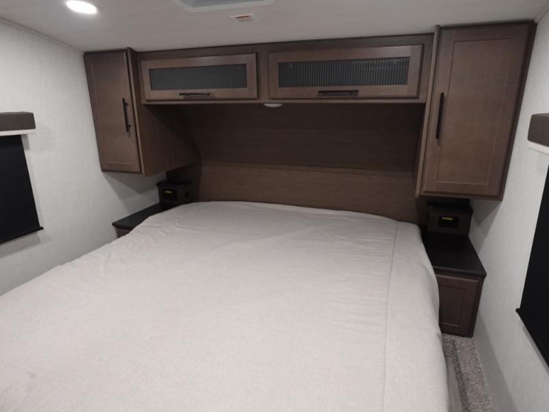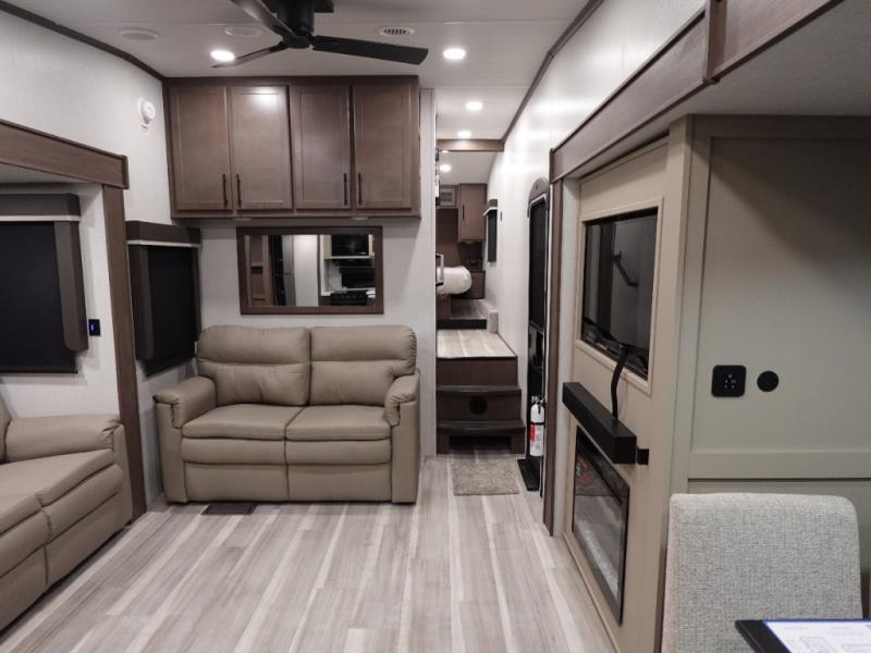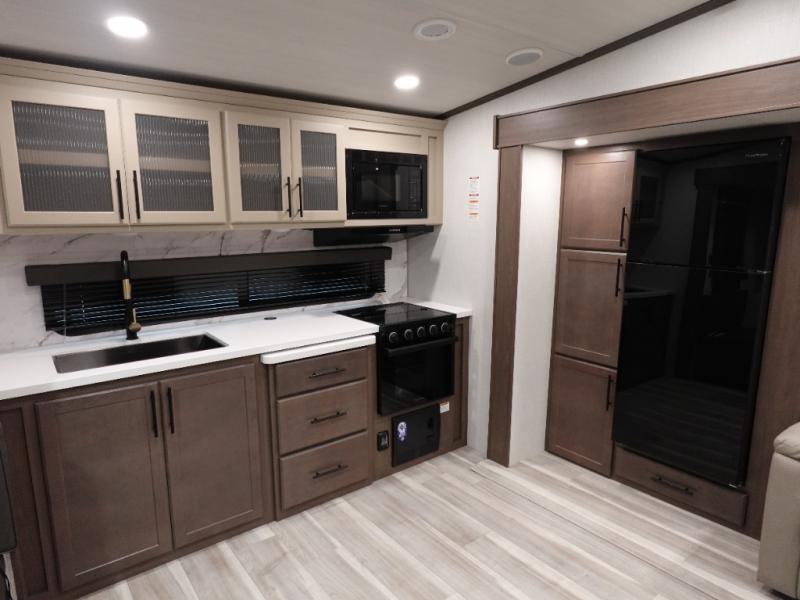 Time spent at the campground in this fifth wheel will be time well spent! Once you arrive, you can unload the unobstructed pass-thru storage, put out the two power awnings, and grab a cold drink from the outdoor mini refrigerator. Head inside to relax on the tri-fold sleeper sofa or theater seating across from the LED HDTV. The rear kitchen includes everything you need to make meals each day, including a pull-out countertop for more space plus a pantry and 12V refrigerator for food storage. The full bath with a 30" x 36" shower will let you freshen up before bed, and speaking of bedtime, the king bed in the front private bedroom is sure to bring a great night's rest. There are also dual wardrobes and nightstands here for your things, plus a third wardrobe with washer and dryer prep if you want to add these appliances.