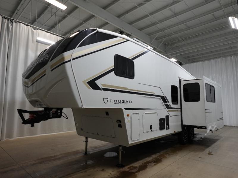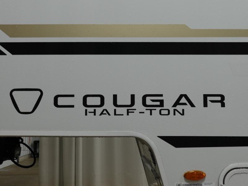 The Keystone Cougar Half-Ton fifth wheel and travel trailers are known as one of America's favorites for a reason! Some of those reasons are the exclusive features that come from Keystone, like the Winegard Air 360+ omni-directional rooftop antenna, the in-floor heating ducts, and the HyperCore composite wall construction with Vixen Fibrogloss high-gloss finish. The Cougar Half-Ton has a Climate Guard protection package with heat-deflecting white sidewalls, two roof attic vents, PEX plumbing and more to enjoy four season camping. Inside, you'll love the dimmable lighting, night roller shades throughout, shower skylight, and bedside USB outlets to keep your electronics charged.