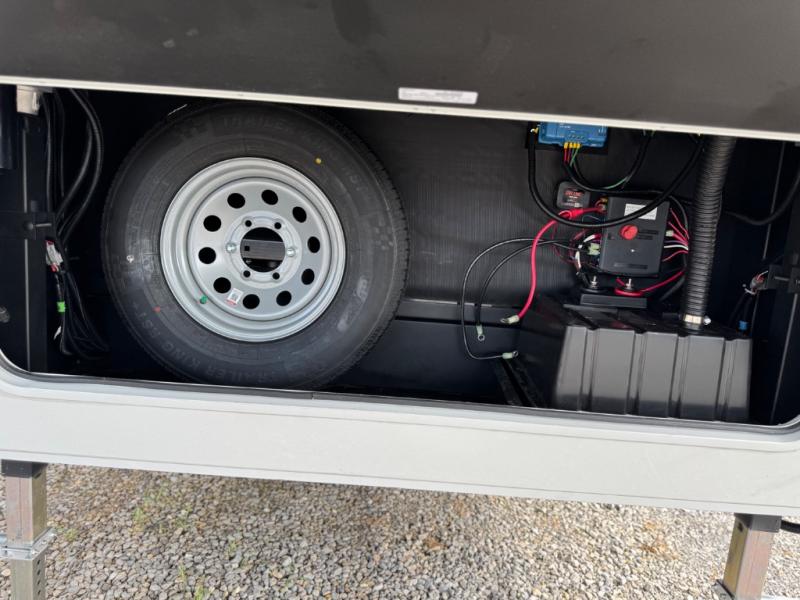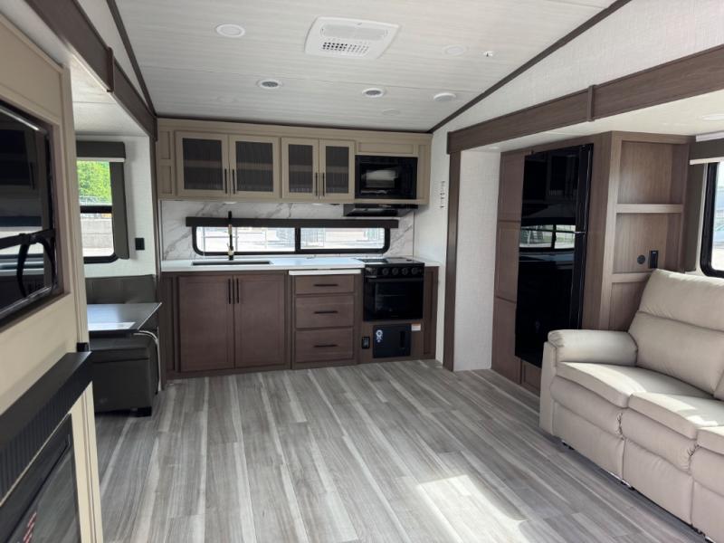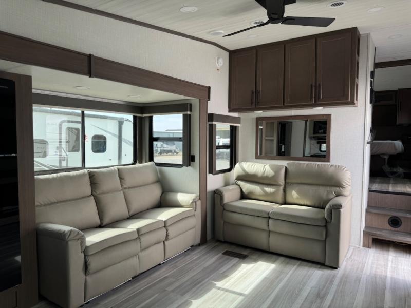 Time spent at the campground in this fifth wheel will be time well spent! Once you arrive, you can unload the unobstructed pass-thru storage, put out the two power awnings, and grab a cold drink from the outdoor mini refrigerator. Head inside to relax on the tri-fold sleeper sofa or theater seating across from the LED HDTV. The rear kitchen includes everything you need to make meals each day, including a pull-out countertop for more space plus a pantry and 12V refrigerator for food storage. The full bath with a 30" x 36" shower will let you freshen up before bed, and speaking of bedtime, the king bed in the front private bedroom is sure to bring a great night's rest. There are also dual wardrobes and nightstands here for your things, plus a third wardrobe with washer and dryer prep if you want to add these appliances.