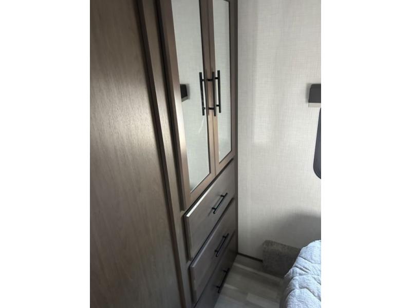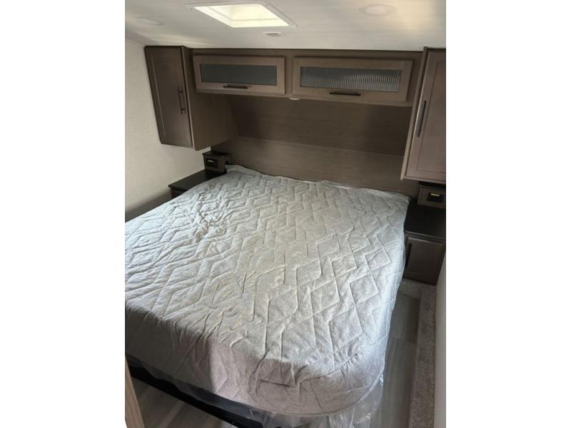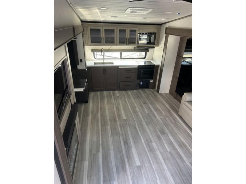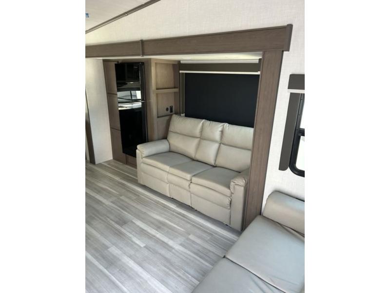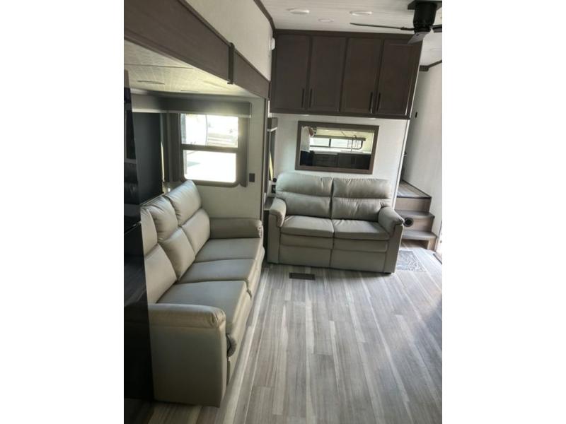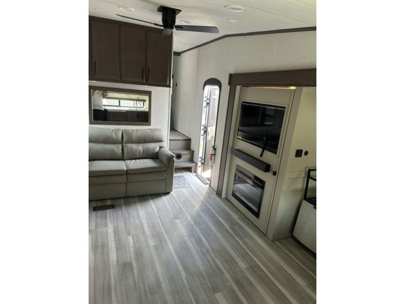 Time spent at the campground in this fifth wheel will be time well spent! Once you arrive, you can unload the unobstructed pass-thru storage, put out the two power awnings, and grab a cold drink from the outdoor mini refrigerator. Head inside to relax on the tri-fold sleeper sofa or theater seating across from the LED HDTV. The rear kitchen includes everything you need to make meals each day, including a pull-out countertop for more space plus a pantry and 12V refrigerator for food storage. The full bath with a 30" x 36" shower will let you freshen up before bed, and speaking of bedtime, the king bed in the front private bedroom is sure to bring a great night's rest. There are also dual wardrobes and nightstands here for your things, plus a third wardrobe with washer and dryer prep if you want to add these appliances.