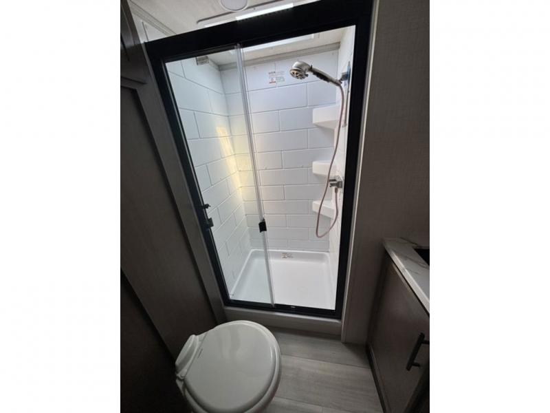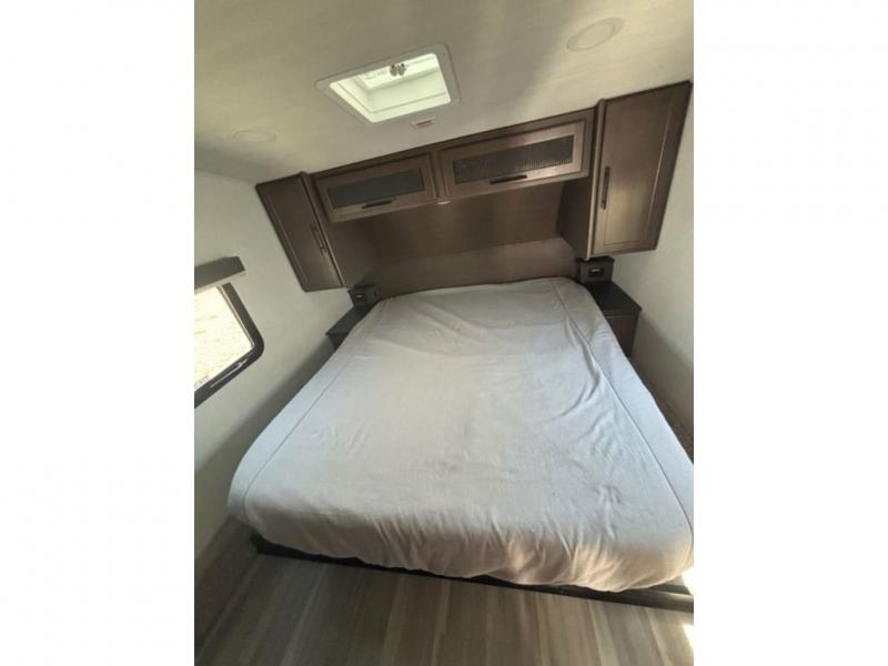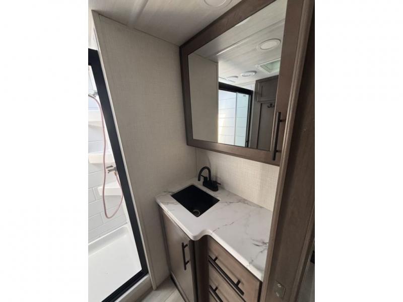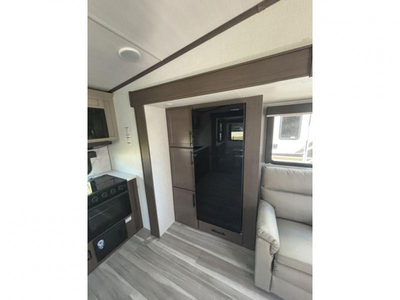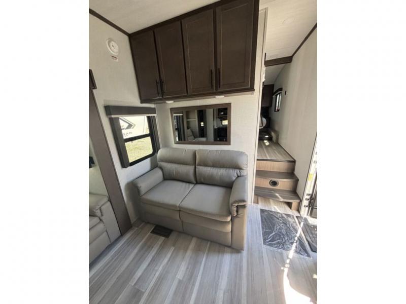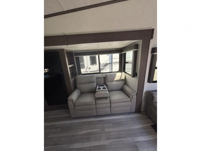 Time spent at the campground in this fifth wheel will be time well spent! Once you arrive, you can unload the unobstructed pass-thru storage, put out the two power awnings, and grab a cold drink from the outdoor mini refrigerator. Head inside to relax on the tri-fold sleeper sofa or theater seating across from the LED HDTV. The rear kitchen includes everything you need to make meals each day, including a pull-out countertop for more space plus a pantry and 12V refrigerator for food storage. The full bath with a 30" x 36" shower will let you freshen up before bed, and speaking of bedtime, the king bed in the front private bedroom is sure to bring a great night's rest. There are also dual wardrobes and nightstands here for your things, plus a third wardrobe with washer and dryer prep if you want to add these appliances.