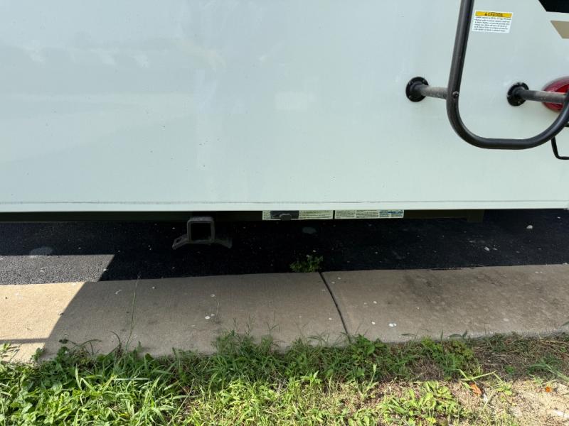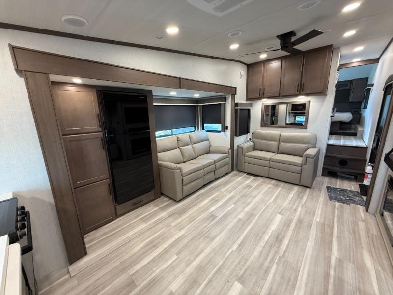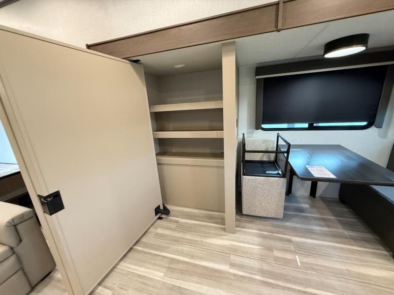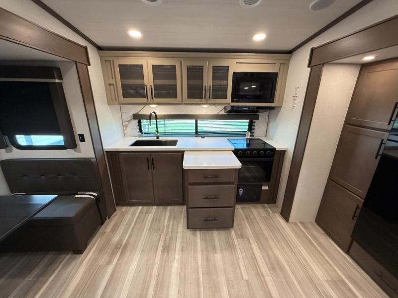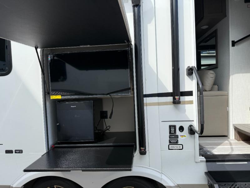 Time spent at the campground in this fifth wheel will be time well spent! Once you arrive, you can unload the unobstructed pass-thru storage, put out the two power awnings, and grab a cold drink from the outdoor mini refrigerator. Head inside to relax on the tri-fold sleeper sofa or theater seating across from the LED HDTV. The rear kitchen includes everything you need to make meals each day, including a pull-out countertop for more space plus a pantry and 12V refrigerator for food storage. The full bath with a 30" x 36" shower will let you freshen up before bed, and speaking of bedtime, the king bed in the front private bedroom is sure to bring a great night's rest. There are also dual wardrobes and nightstands here for your things, plus a third wardrobe with washer and dryer prep if you want to add these appliances.