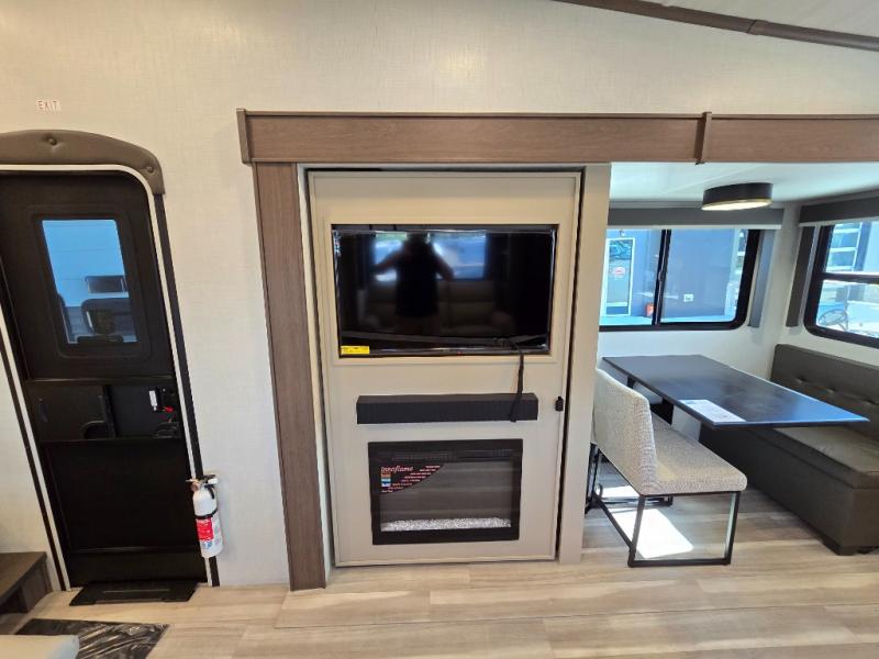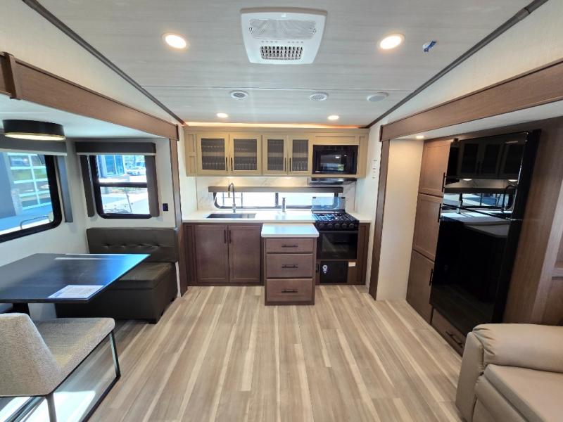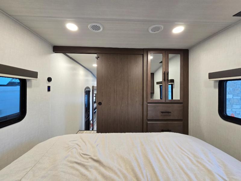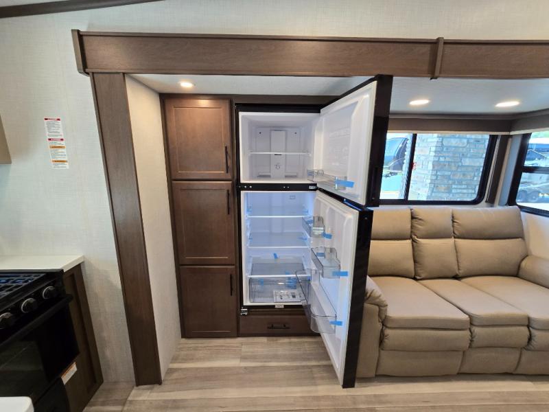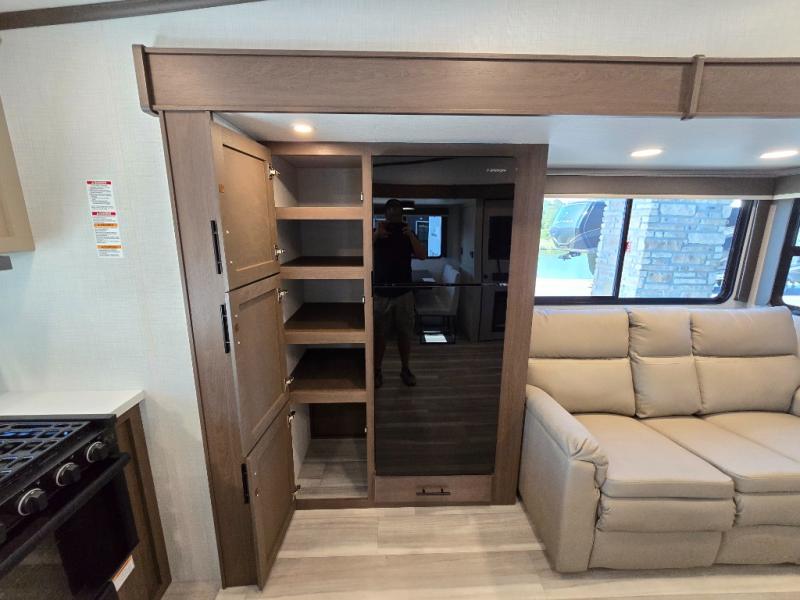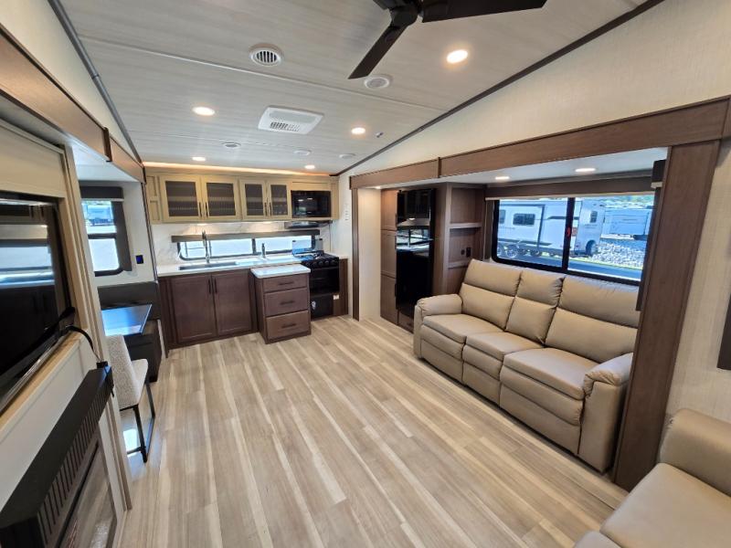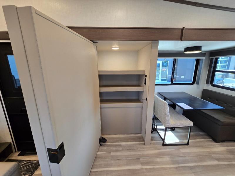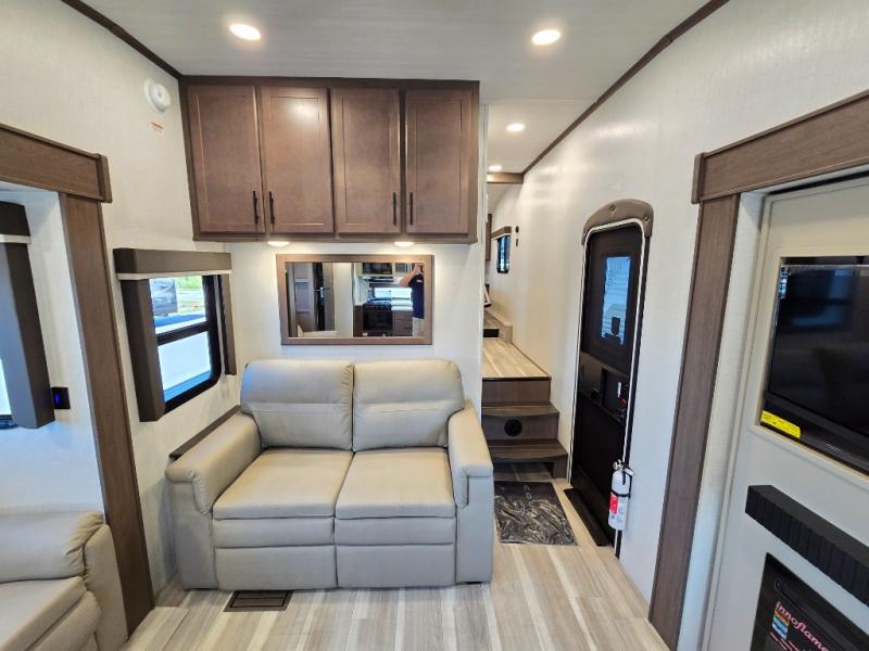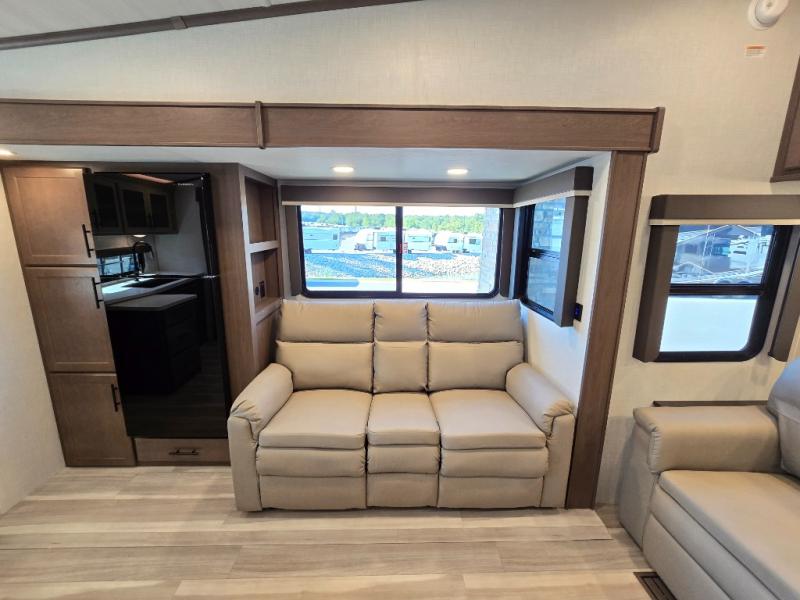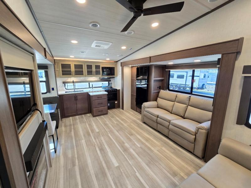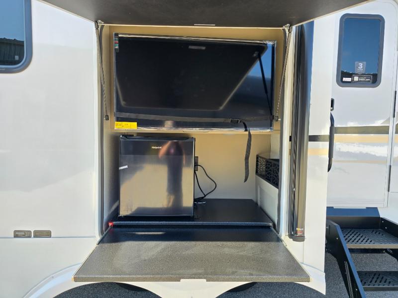 Time spent at the campground in this fifth wheel will be time well spent! Once you arrive, you can unload the unobstructed pass-thru storage, put out the two power awnings, and grab a cold drink from the outdoor mini refrigerator. Head inside to relax on the tri-fold sleeper sofa or theater seating across from the LED HDTV. The rear kitchen includes everything you need to make meals each day, including a pull-out countertop for more space plus a pantry and 12V refrigerator for food storage. The full bath with a 30" x 36" shower will let you freshen up before bed, and speaking of bedtime, the king bed in the front private bedroom is sure to bring a great night's rest. There are also dual wardrobes and nightstands here for your things, plus a third wardrobe with washer and dryer prep if you want to add these appliances.