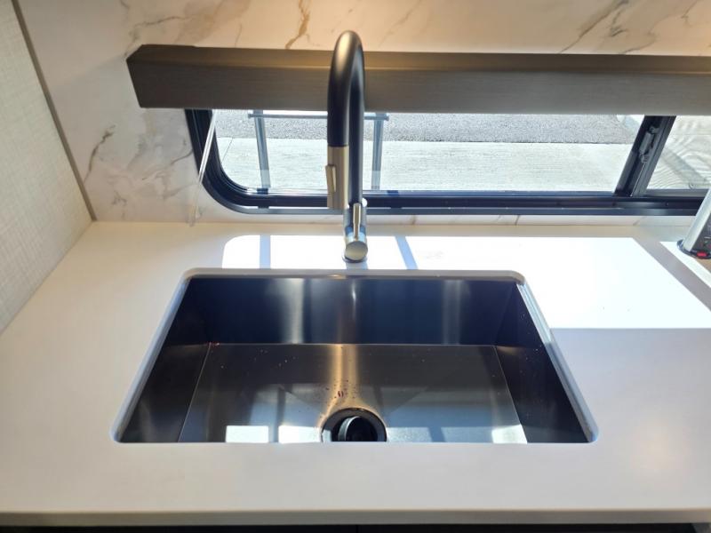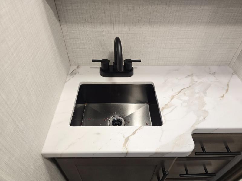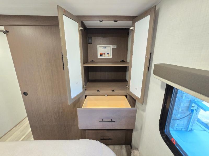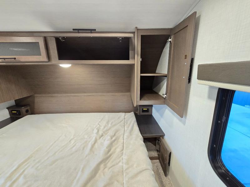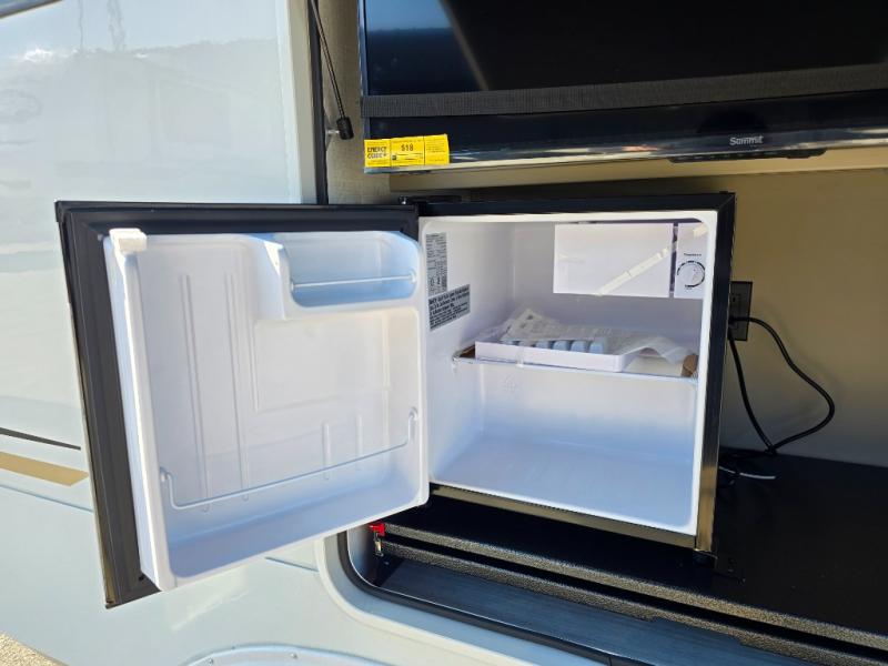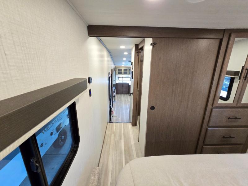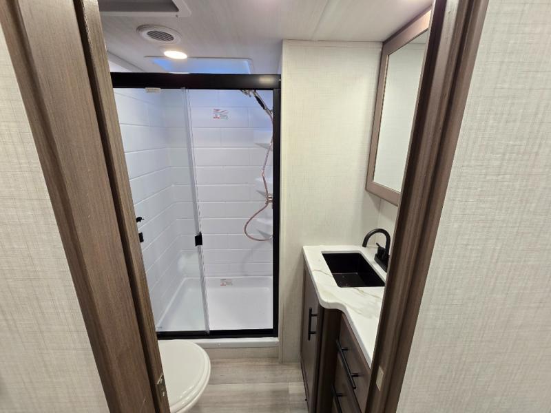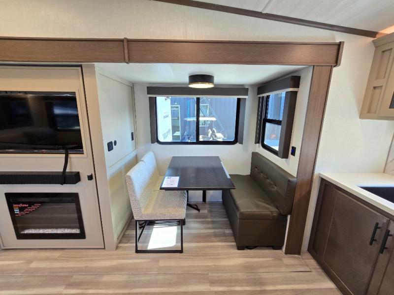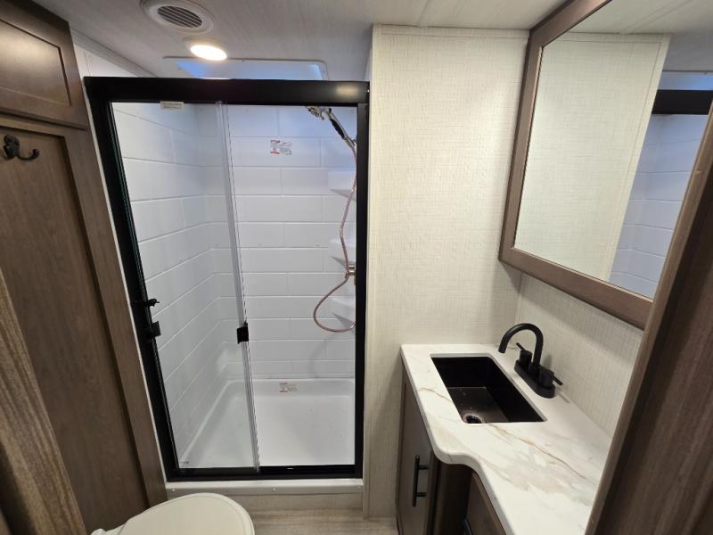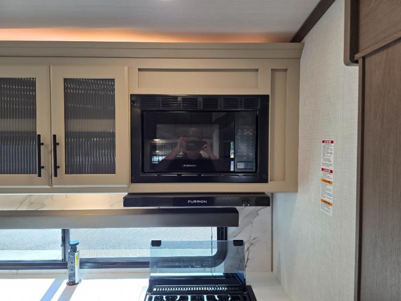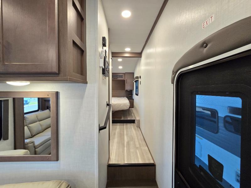 Time spent at the campground in this fifth wheel will be time well spent! Once you arrive, you can unload the unobstructed pass-thru storage, put out the two power awnings, and grab a cold drink from the outdoor mini refrigerator. Head inside to relax on the tri-fold sleeper sofa or theater seating across from the LED HDTV. The rear kitchen includes everything you need to make meals each day, including a pull-out countertop for more space plus a pantry and 12V refrigerator for food storage. The full bath with a 30" x 36" shower will let you freshen up before bed, and speaking of bedtime, the king bed in the front private bedroom is sure to bring a great night's rest. There are also dual wardrobes and nightstands here for your things, plus a third wardrobe with washer and dryer prep if you want to add these appliances.