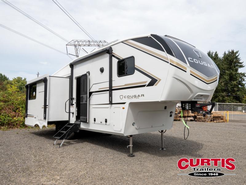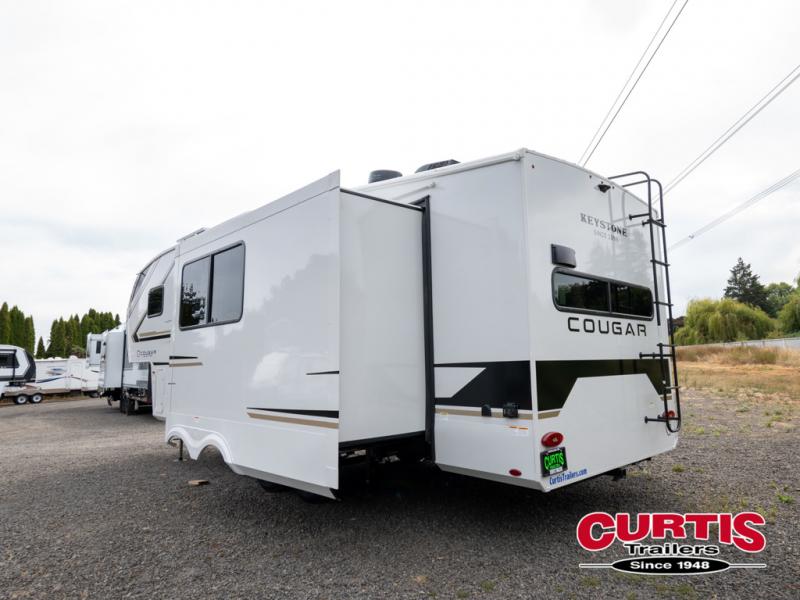 The Keystone Cougar Half-Ton fifth wheel and travel trailers are known as one of America's favorites for a reason! Some of those reasons are the exclusive features that come from Keystone, like the Winegard Air 360+ omni-directional rooftop antenna, the in-floor heating ducts, and the HyperCore composite wall construction with Vixen Fibrogloss high-gloss finish. The Cougar Half-Ton has a Climate Guard protection package with heat-deflecting white sidewalls, two roof attic vents, PEX plumbing and more to enjoy four season camping. Inside, you'll love the dimmable lighting, night roller shades throughout, shower skylight, and bedside USB outlets to keep your electronics charged.