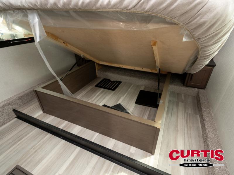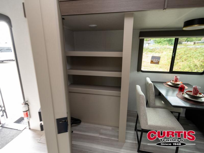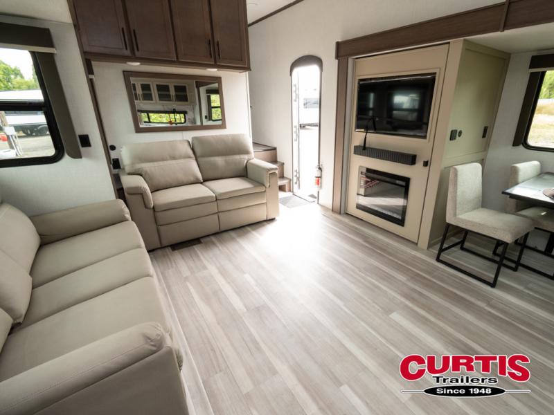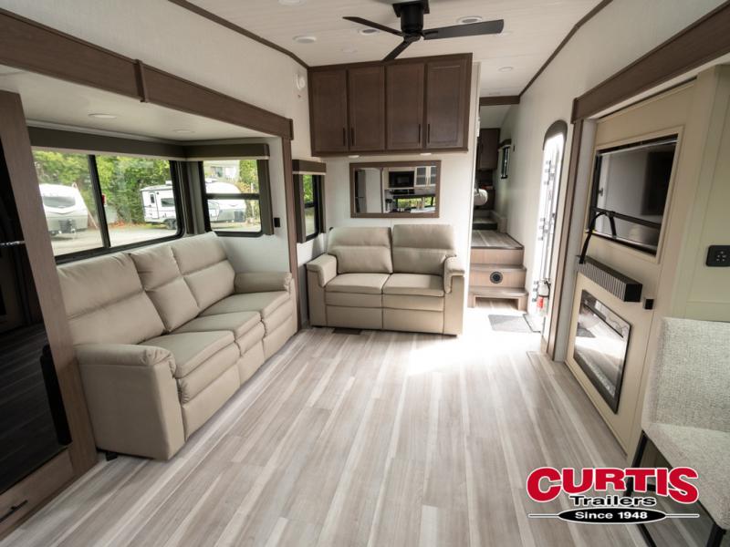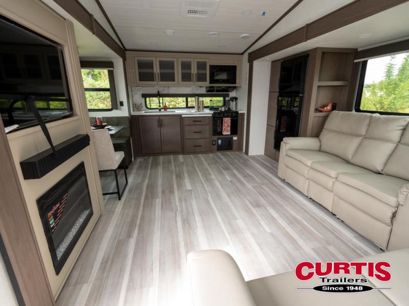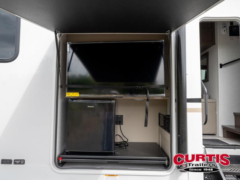 Time spent at the campground in this fifth wheel will be time well spent! Once you arrive, you can unload the unobstructed pass-thru storage, put out the two power awnings, and grab a cold drink from the outdoor mini refrigerator. Head inside to relax on the tri-fold sleeper sofa or theater seating across from the LED HDTV. The rear kitchen includes everything you need to make meals each day, including a pull-out countertop for more space plus a pantry and 12V refrigerator for food storage. The full bath with a 30" x 36" shower will let you freshen up before bed, and speaking of bedtime, the king bed in the front private bedroom is sure to bring a great night's rest. There are also dual wardrobes and nightstands here for your things, plus a third wardrobe with washer and dryer prep if you want to add these appliances.