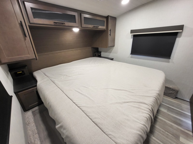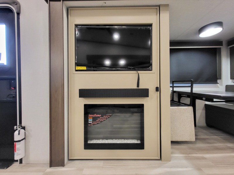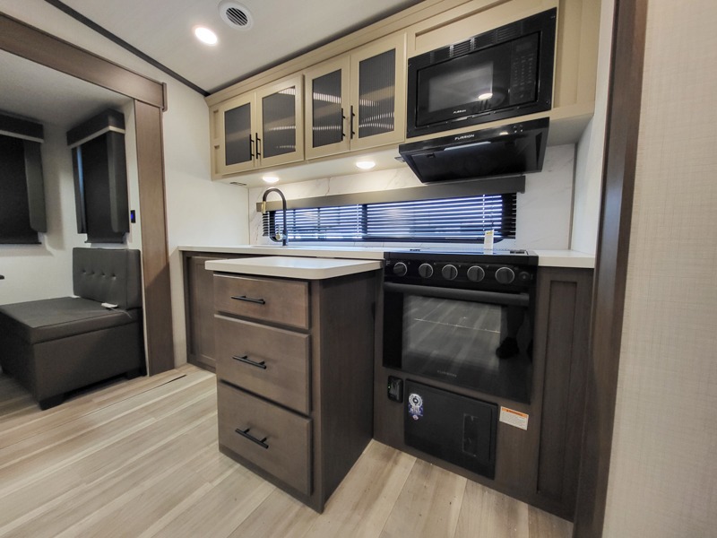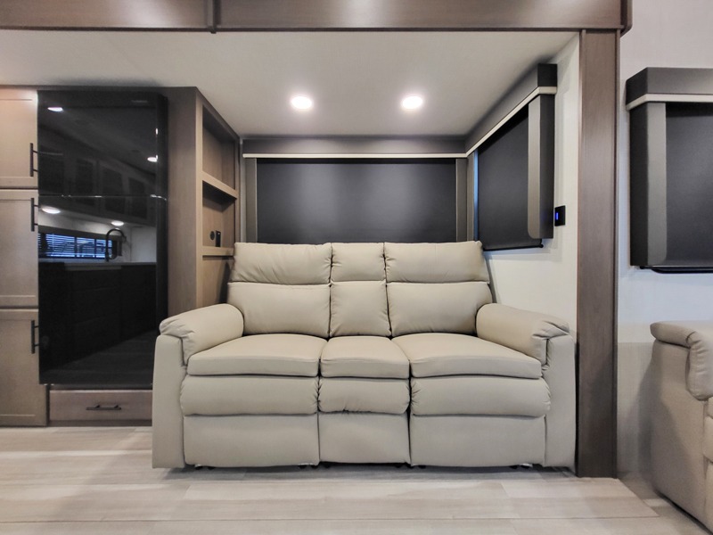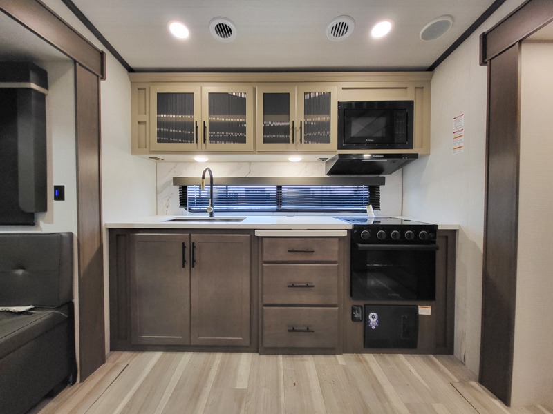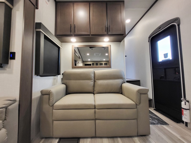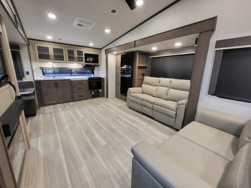 Time spent at the campground in this fifth wheel will be time well spent! Once you arrive, you can unload the unobstructed pass-thru storage, put out the two power awnings, and grab a cold drink from the outdoor mini refrigerator. Head inside to relax on the tri-fold sleeper sofa or theater seating across from the LED HDTV. The rear kitchen includes everything you need to make meals each day, including a pull-out countertop for more space plus a pantry and 12V refrigerator for food storage. The full bath with a 30" x 36" shower will let you freshen up before bed, and speaking of bedtime, the king bed in the front private bedroom is sure to bring a great night's rest. There are also dual wardrobes and nightstands here for your things, plus a third wardrobe with washer and dryer prep if you want to add these appliances.