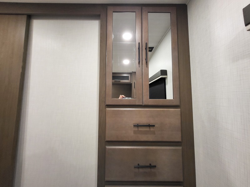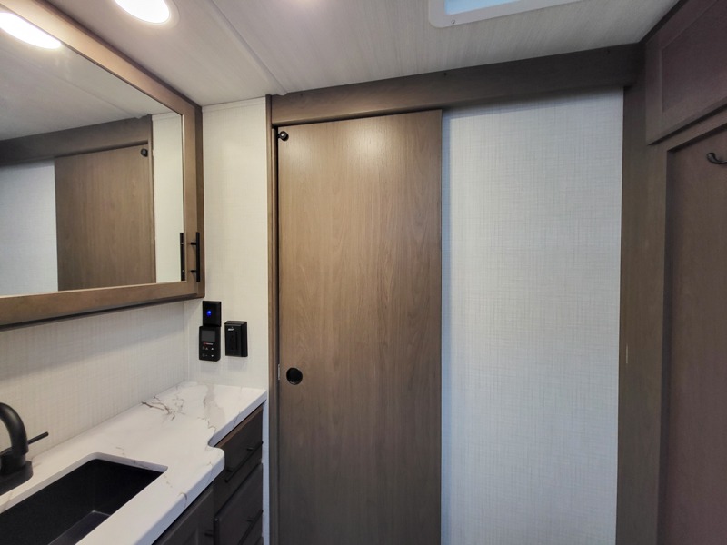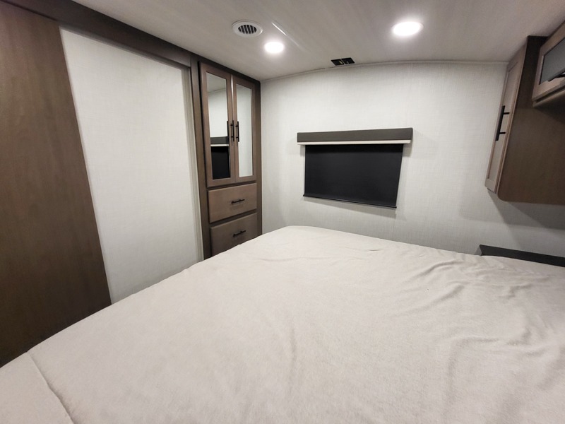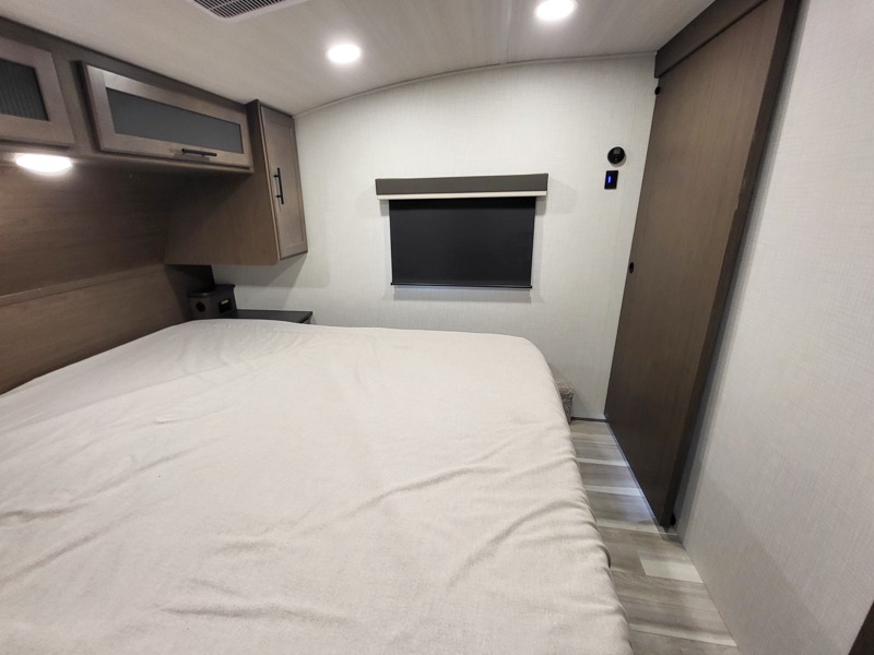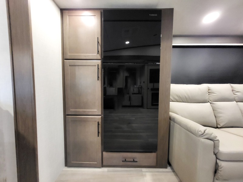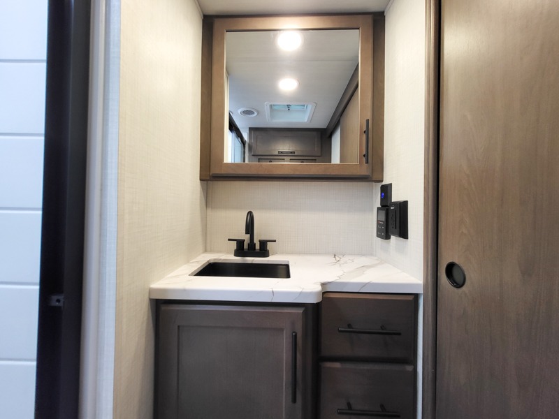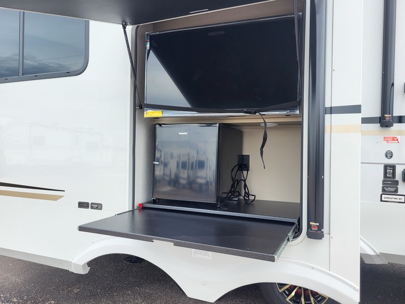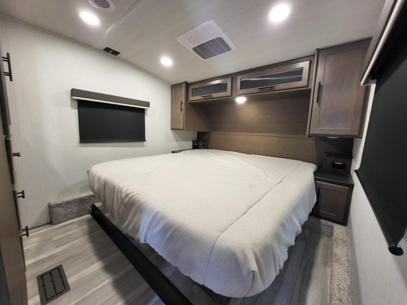 Time spent at the campground in this fifth wheel will be time well spent! Once you arrive, you can unload the unobstructed pass-thru storage, put out the two power awnings, and grab a cold drink from the outdoor mini refrigerator. Head inside to relax on the tri-fold sleeper sofa or theater seating across from the LED HDTV. The rear kitchen includes everything you need to make meals each day, including a pull-out countertop for more space plus a pantry and 12V refrigerator for food storage. The full bath with a 30" x 36" shower will let you freshen up before bed, and speaking of bedtime, the king bed in the front private bedroom is sure to bring a great night's rest. There are also dual wardrobes and nightstands here for your things, plus a third wardrobe with washer and dryer prep if you want to add these appliances.