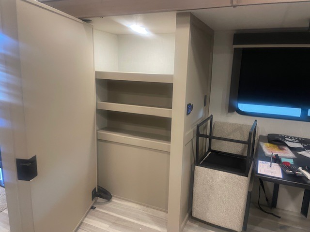 Time spent at the campground in this fifth wheel will be time well spent! Once you arrive, you can unload the unobstructed pass-thru storage, put out the two power awnings, and grab a cold drink from the outdoor mini refrigerator. Head inside to relax on the tri-fold sleeper sofa or theater seating across from the LED HDTV. The rear kitchen includes everything you need to make meals each day, including a pull-out countertop for more space plus a pantry and 12V refrigerator for food storage. The full bath with a 30" x 36" shower will let you freshen up before bed, and speaking of bedtime, the king bed in the front private bedroom is sure to bring a great night's rest. There are also dual wardrobes and nightstands here for your things, plus a third wardrobe with washer and dryer prep if you want to add these appliances.