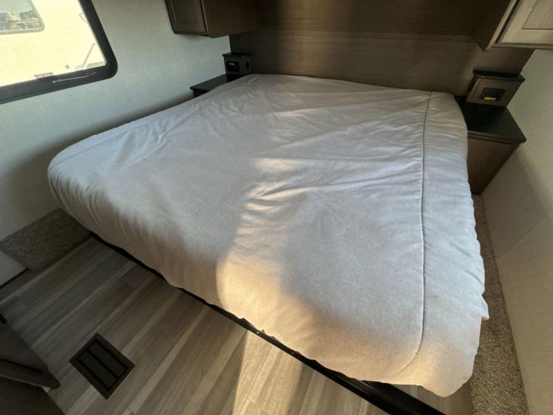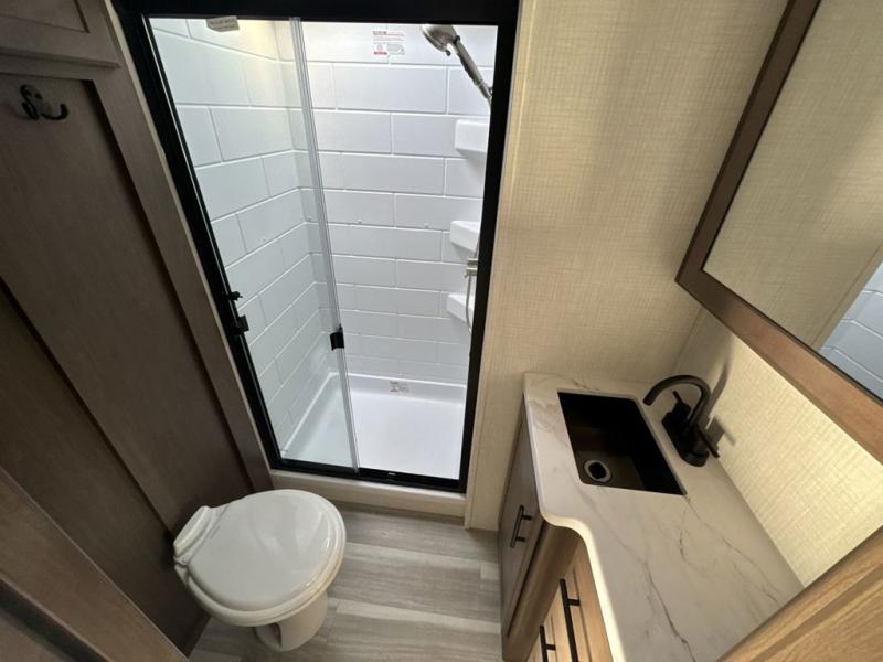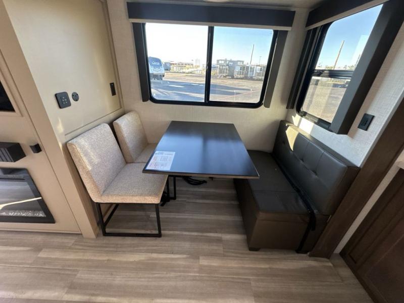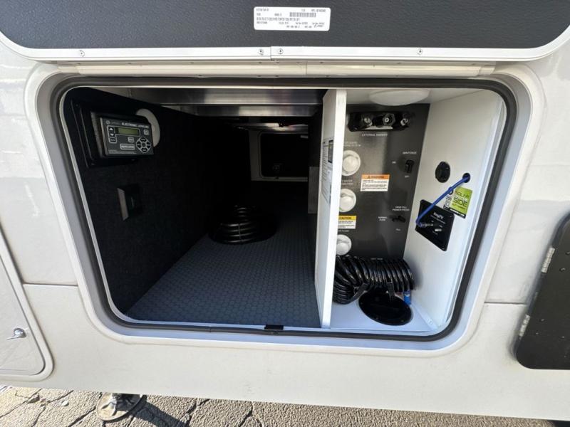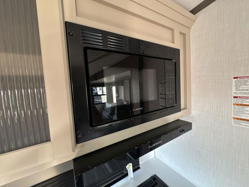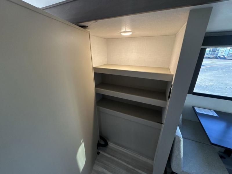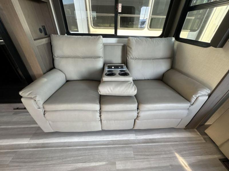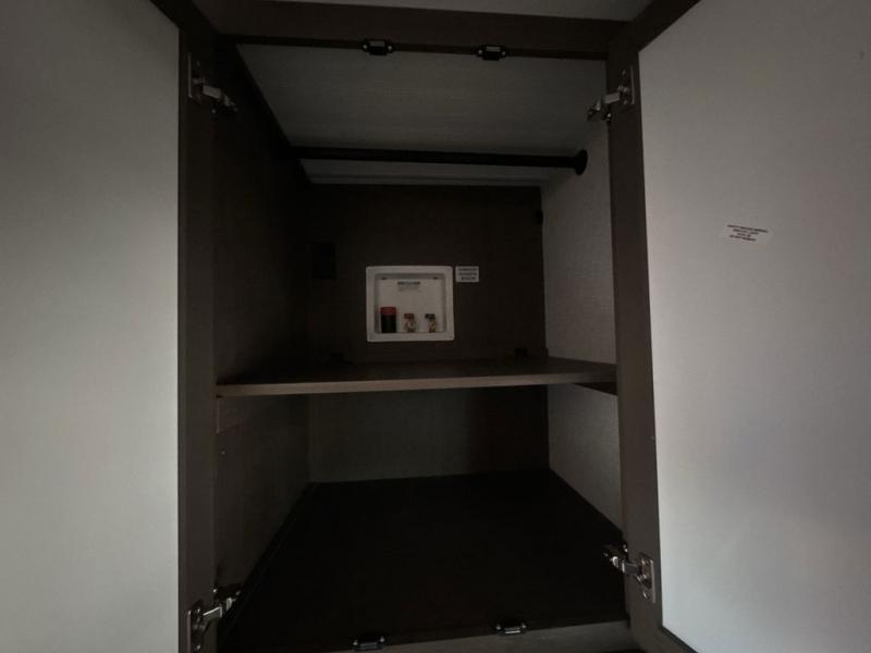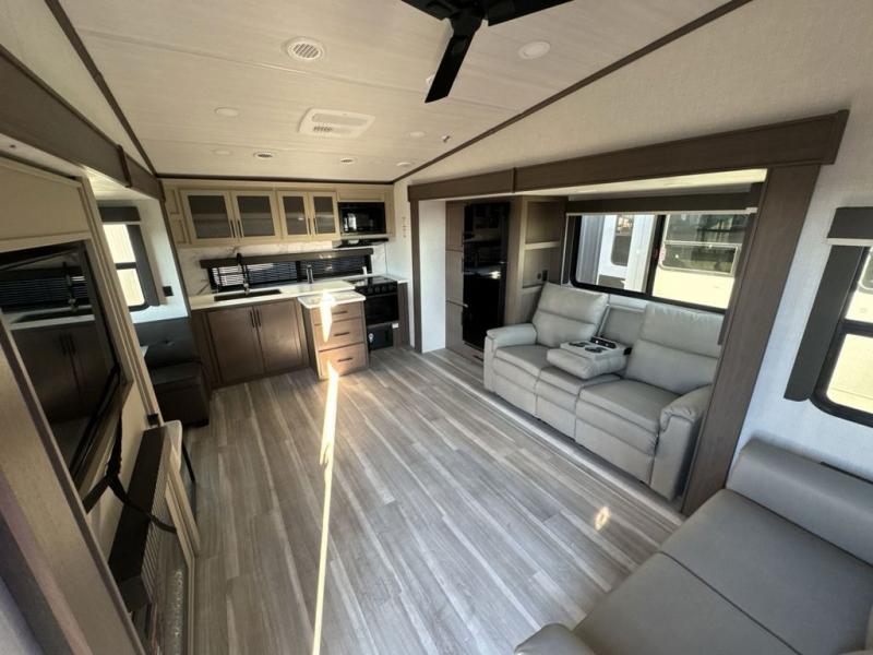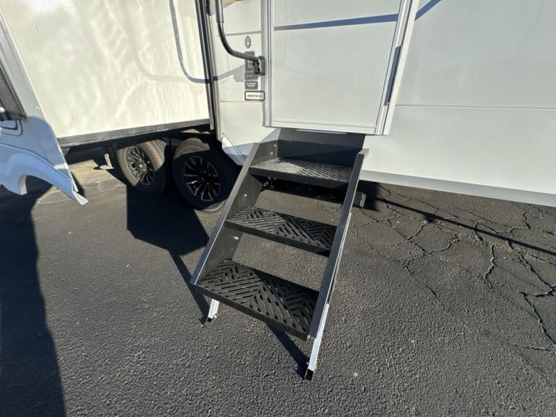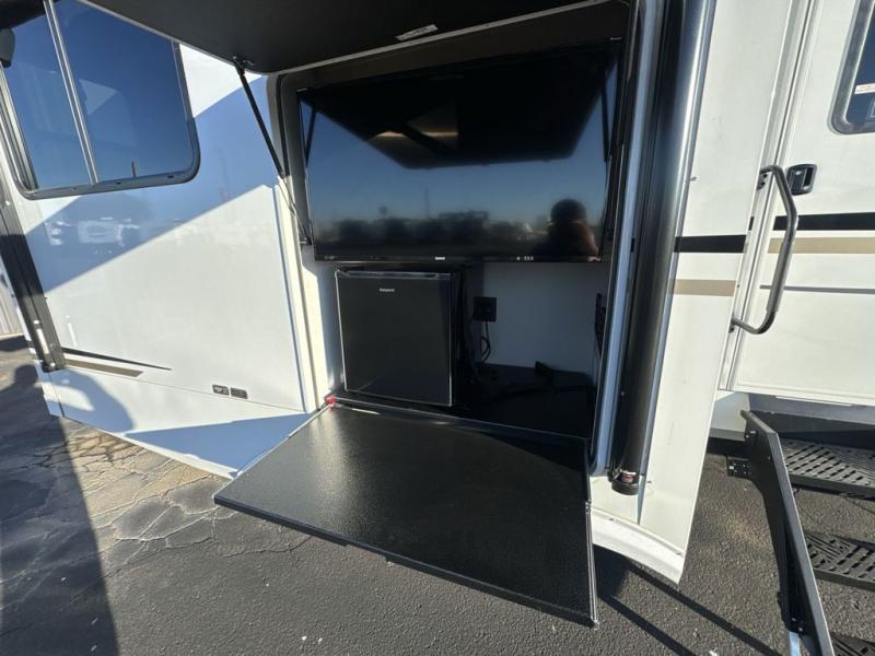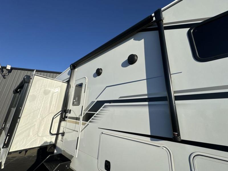 Time spent at the campground in this fifth wheel will be time well spent! Once you arrive, you can unload the unobstructed pass-thru storage, put out the two power awnings, and grab a cold drink from the outdoor mini refrigerator. Head inside to relax on the tri-fold sleeper sofa or theater seating across from the LED HDTV. The rear kitchen includes everything you need to make meals each day, including a pull-out countertop for more space plus a pantry and 12V refrigerator for food storage. The full bath with a 30" x 36" shower will let you freshen up before bed, and speaking of bedtime, the king bed in the front private bedroom is sure to bring a great night's rest. There are also dual wardrobes and nightstands here for your things, plus a third wardrobe with washer and dryer prep if you want to add these appliances.