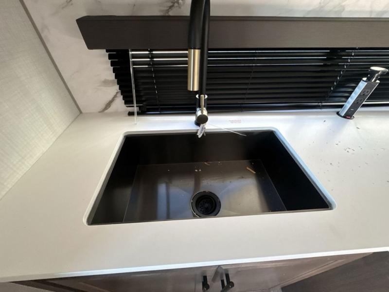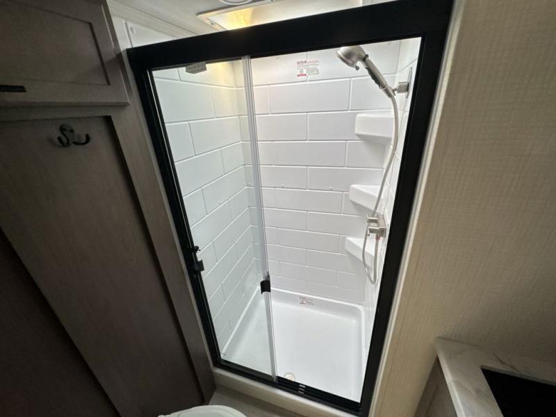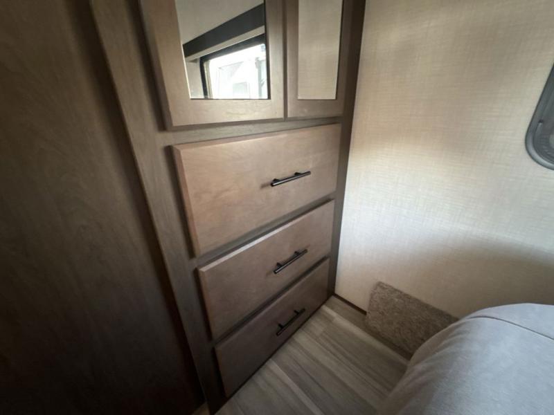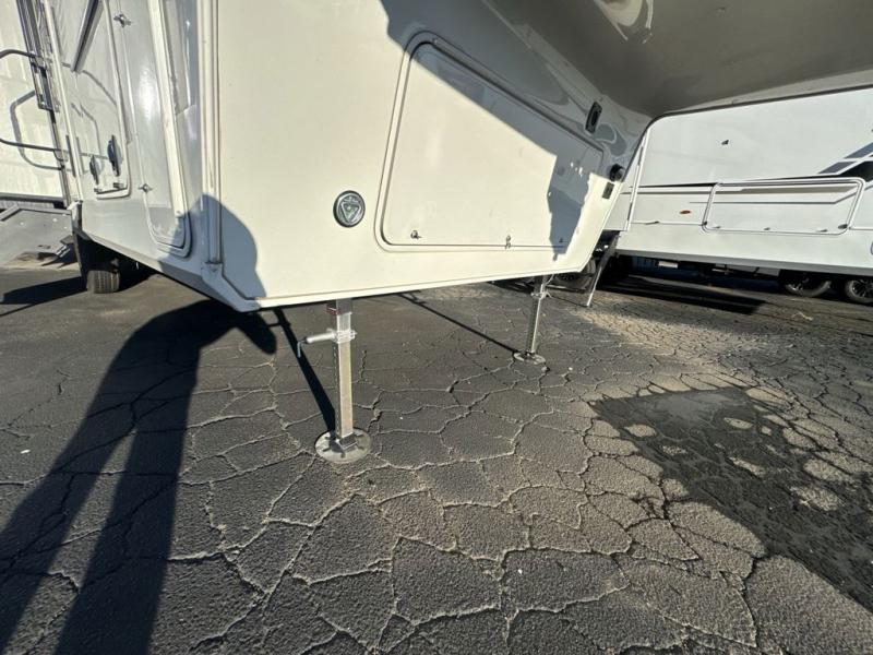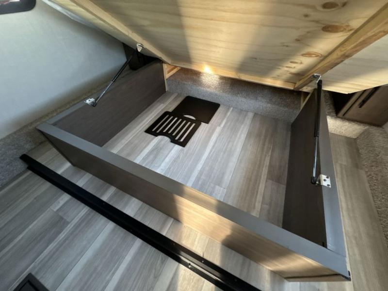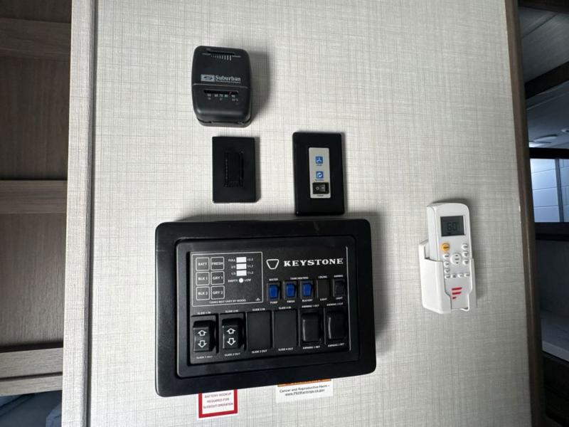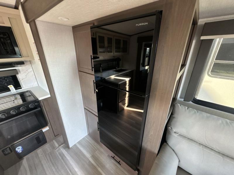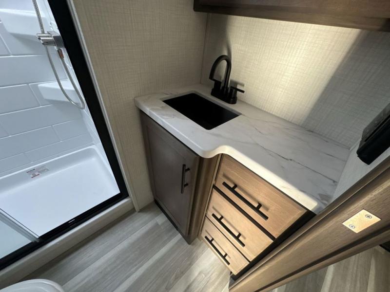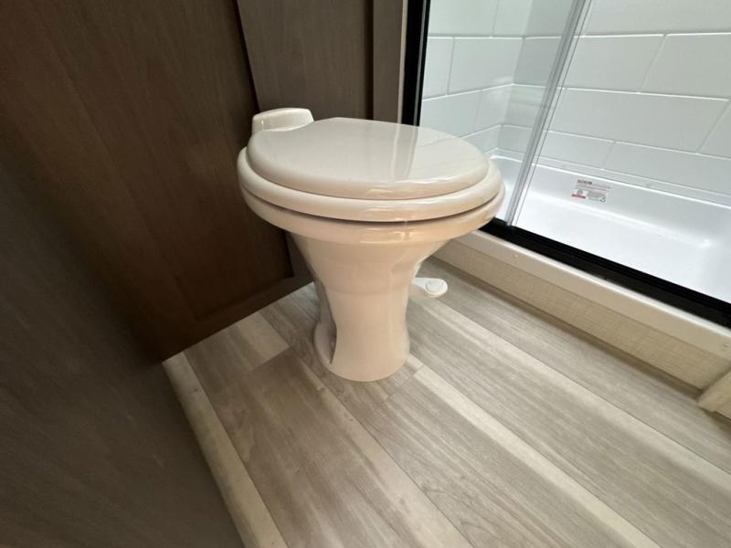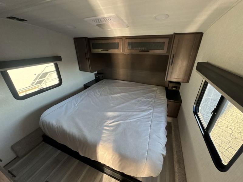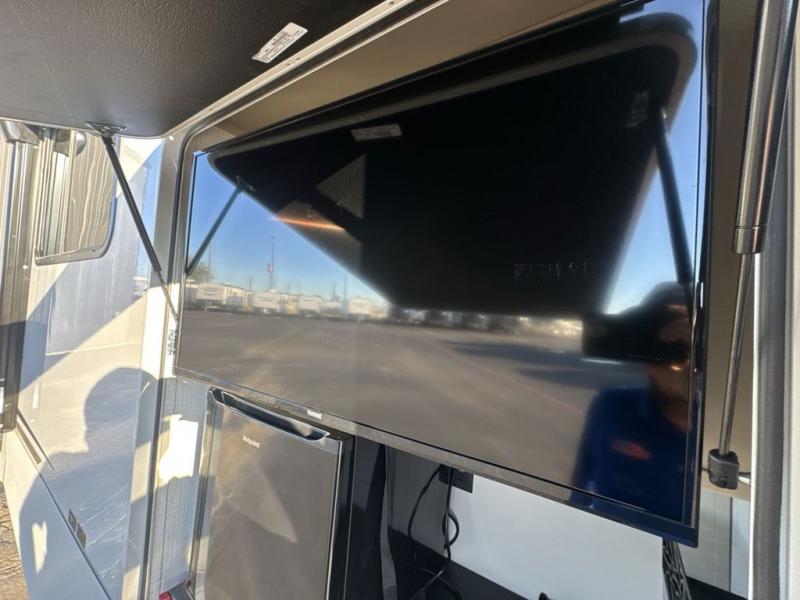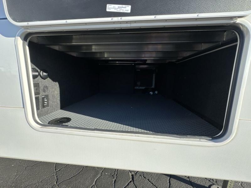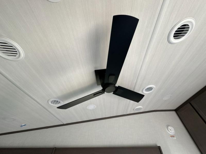 Time spent at the campground in this fifth wheel will be time well spent! Once you arrive, you can unload the unobstructed pass-thru storage, put out the two power awnings, and grab a cold drink from the outdoor mini refrigerator. Head inside to relax on the tri-fold sleeper sofa or theater seating across from the LED HDTV. The rear kitchen includes everything you need to make meals each day, including a pull-out countertop for more space plus a pantry and 12V refrigerator for food storage. The full bath with a 30" x 36" shower will let you freshen up before bed, and speaking of bedtime, the king bed in the front private bedroom is sure to bring a great night's rest. There are also dual wardrobes and nightstands here for your things, plus a third wardrobe with washer and dryer prep if you want to add these appliances.