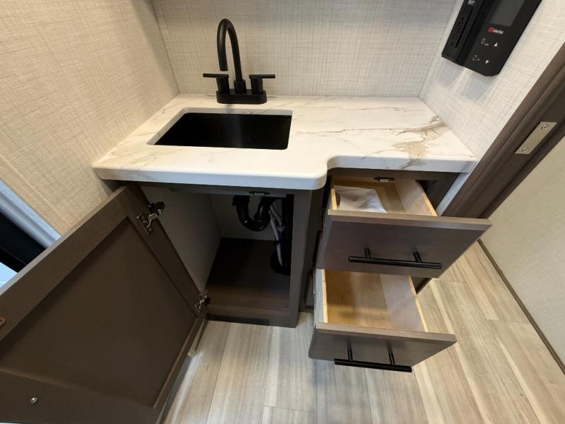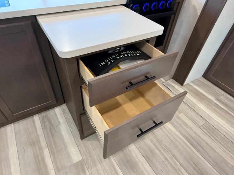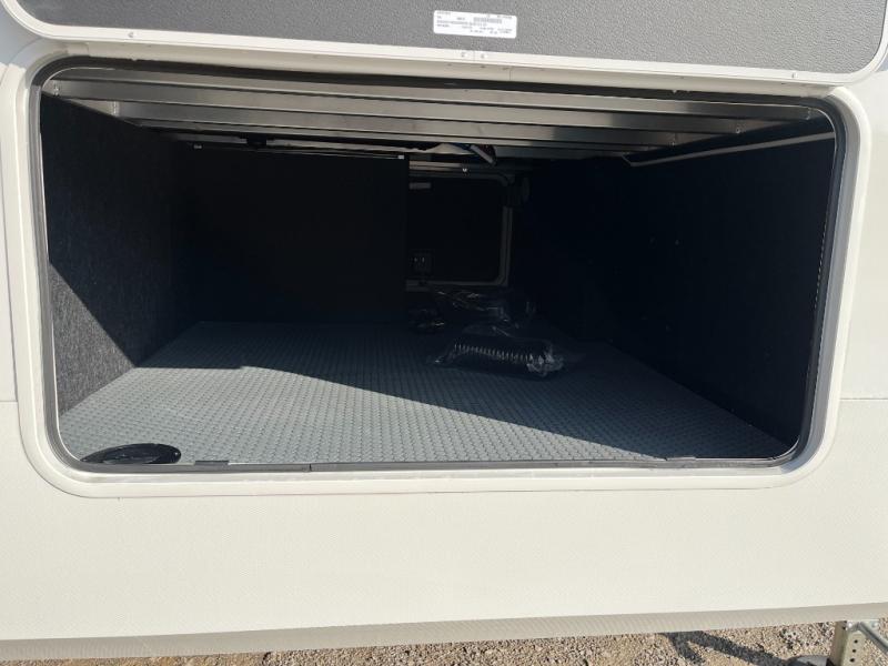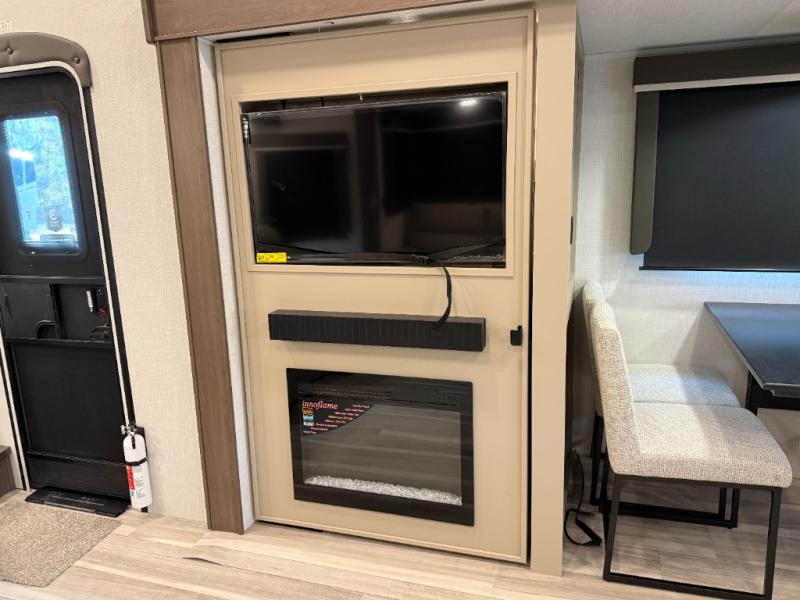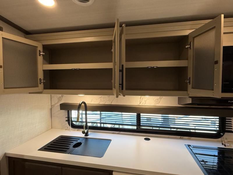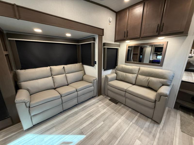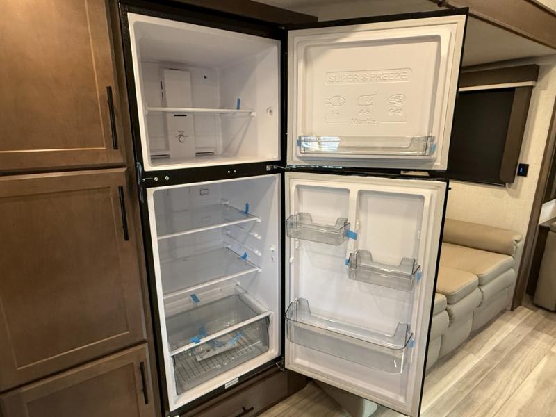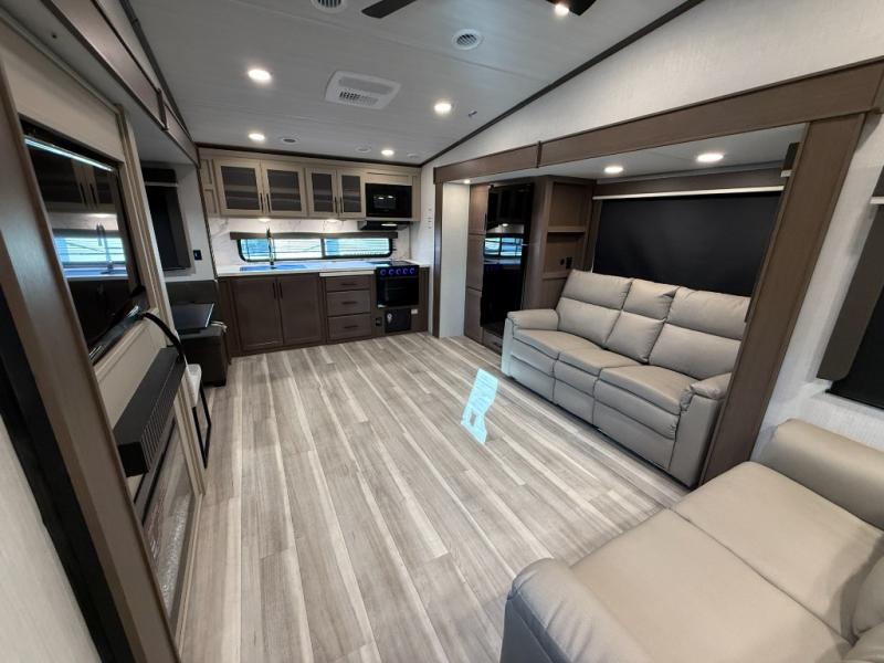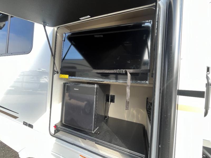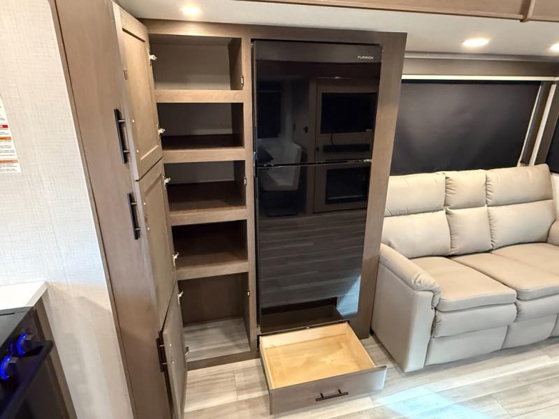 Time spent at the campground in this fifth wheel will be time well spent! Once you arrive, you can unload the unobstructed pass-thru storage, put out the two power awnings, and grab a cold drink from the outdoor mini refrigerator. Head inside to relax on the tri-fold sleeper sofa or theater seating across from the LED HDTV. The rear kitchen includes everything you need to make meals each day, including a pull-out countertop for more space plus a pantry and 12V refrigerator for food storage. The full bath with a 30" x 36" shower will let you freshen up before bed, and speaking of bedtime, the king bed in the front private bedroom is sure to bring a great night's rest. There are also dual wardrobes and nightstands here for your things, plus a third wardrobe with washer and dryer prep if you want to add these appliances.