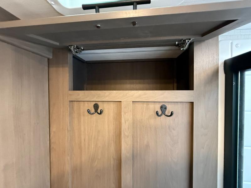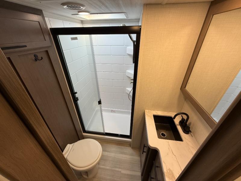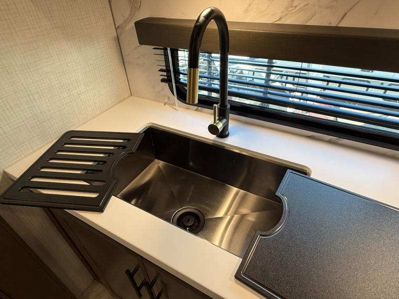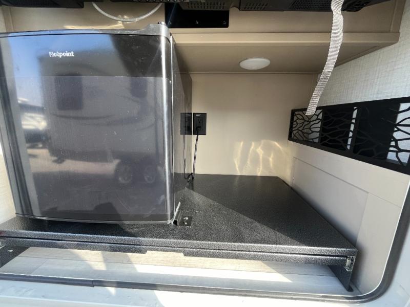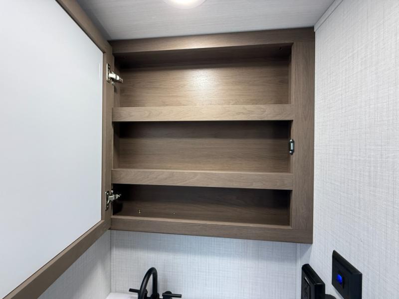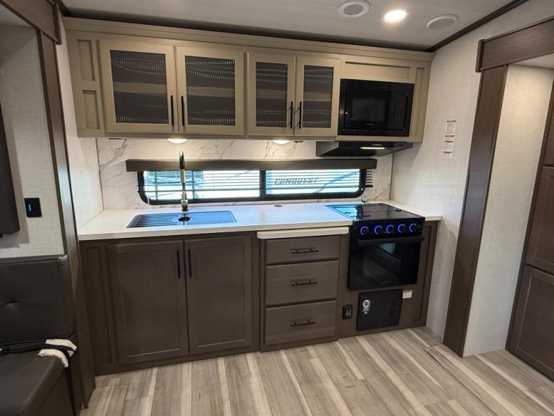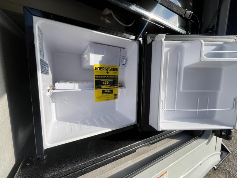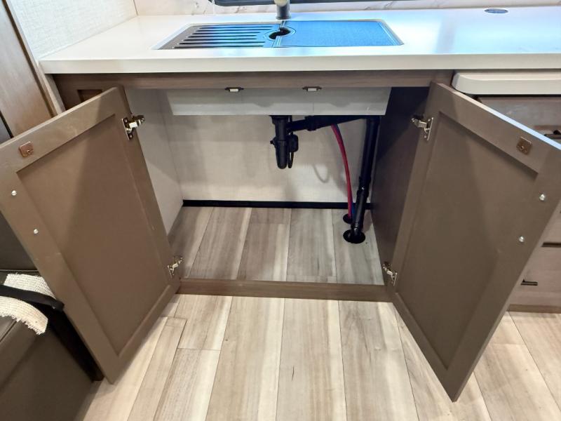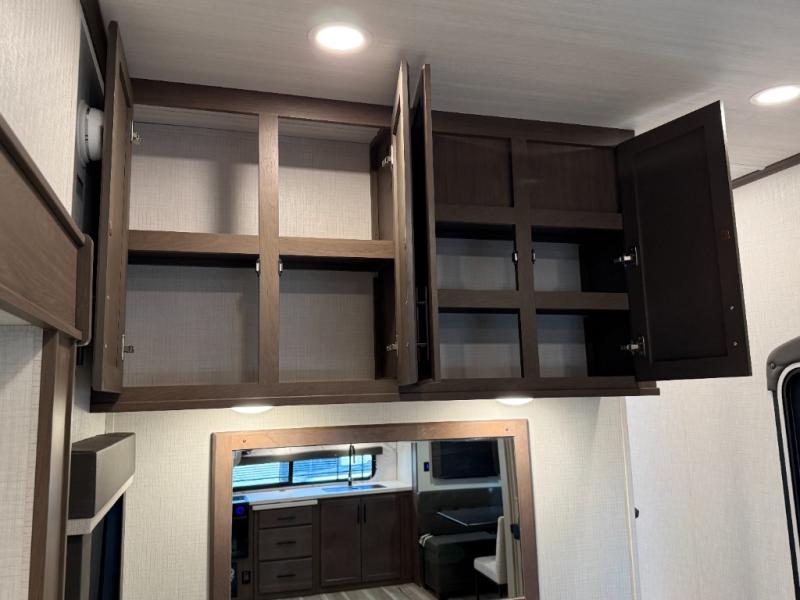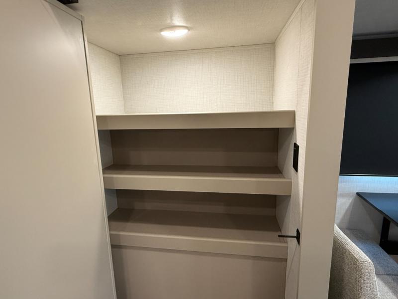 Time spent at the campground in this fifth wheel will be time well spent! Once you arrive, you can unload the unobstructed pass-thru storage, put out the two power awnings, and grab a cold drink from the outdoor mini refrigerator. Head inside to relax on the tri-fold sleeper sofa or theater seating across from the LED HDTV. The rear kitchen includes everything you need to make meals each day, including a pull-out countertop for more space plus a pantry and 12V refrigerator for food storage. The full bath with a 30" x 36" shower will let you freshen up before bed, and speaking of bedtime, the king bed in the front private bedroom is sure to bring a great night's rest. There are also dual wardrobes and nightstands here for your things, plus a third wardrobe with washer and dryer prep if you want to add these appliances.