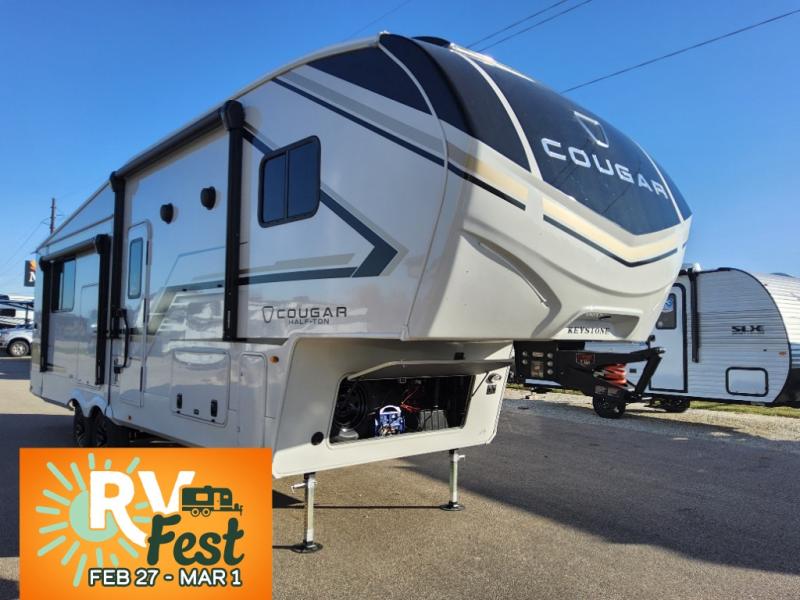 The Keystone Cougar Half-Ton fifth wheel and travel trailers are known as one of America's favorites for a reason! Some of those reasons are the exclusive features that come from Keystone, like the Winegard Air 360+ omni-directional rooftop antenna, the in-floor heating ducts, and the HyperCore composite wall construction with Vixen Fibrogloss high-gloss finish. The Cougar Half-Ton has a Climate Guard protection package with heat-deflecting white sidewalls, two roof attic vents, PEX plumbing and more to enjoy four season camping. Inside, you'll love the dimmable lighting, night roller shades throughout, shower skylight, and bedside USB outlets to keep your electronics charged.