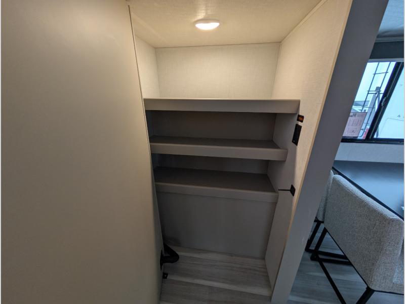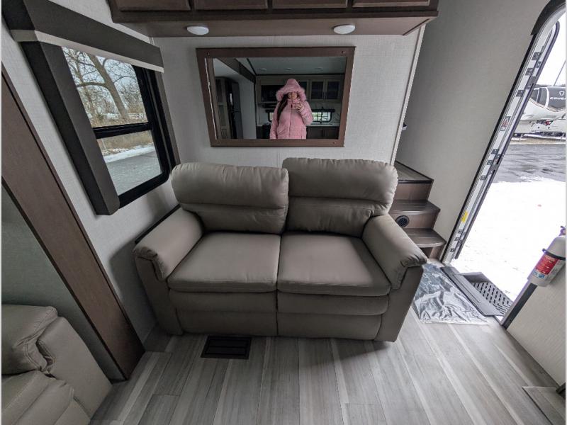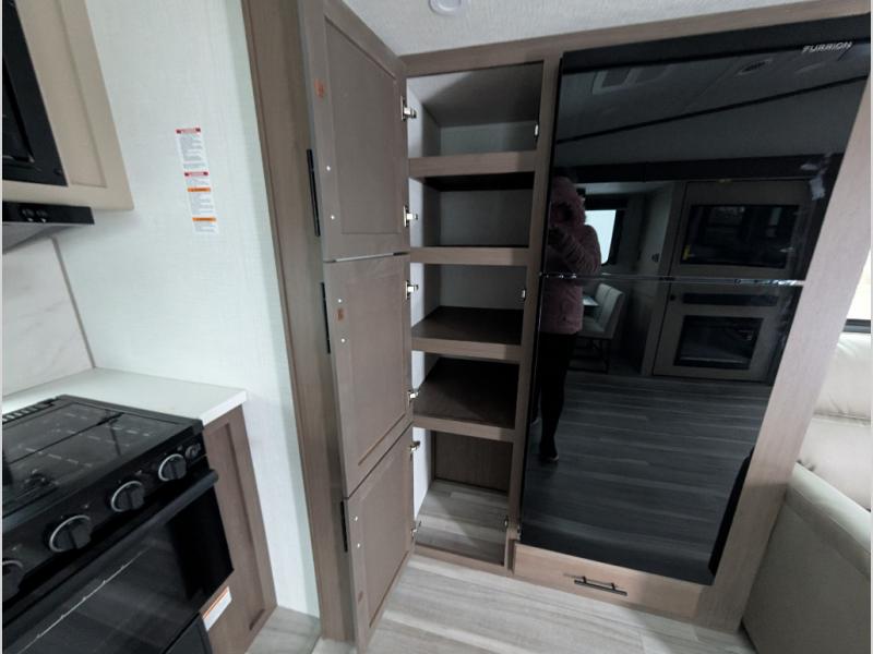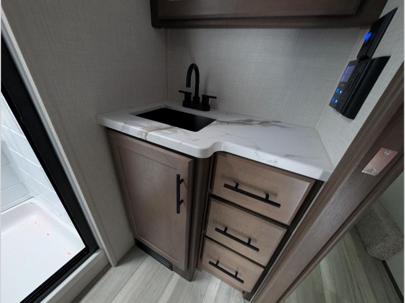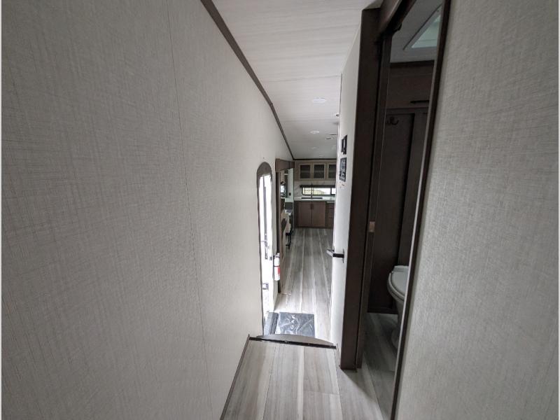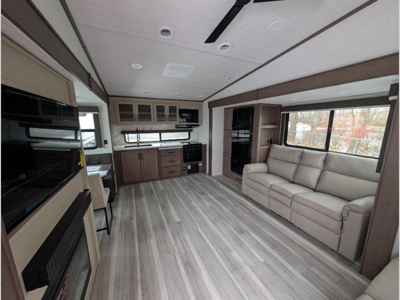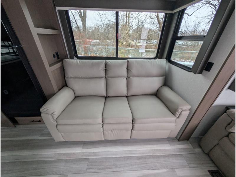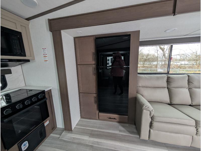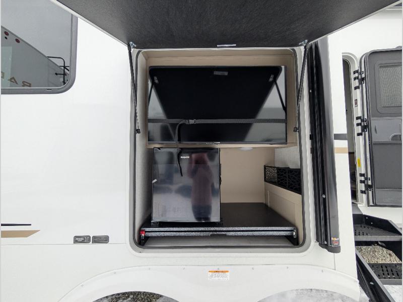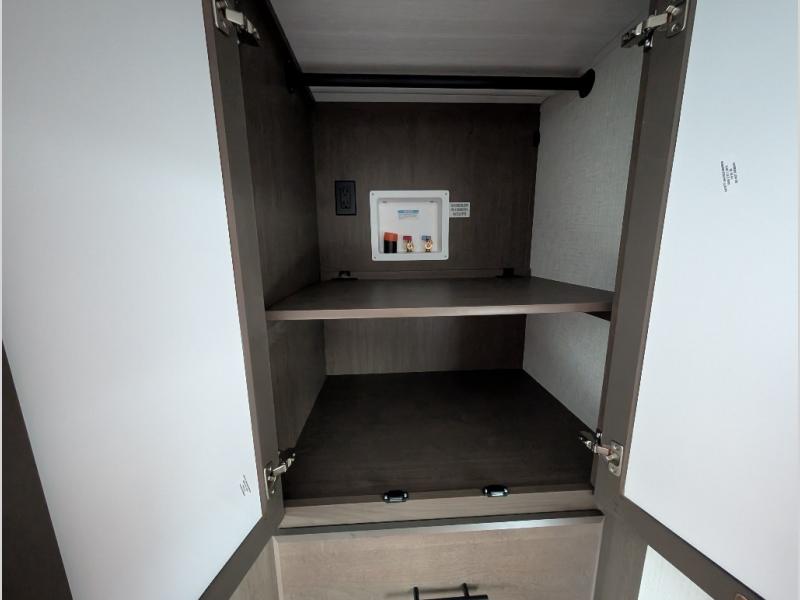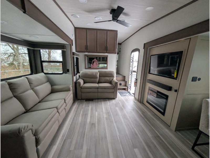 Time spent at the campground in this fifth wheel will be time well spent! Once you arrive, you can unload the unobstructed pass-thru storage, put out the two power awnings, and grab a cold drink from the outdoor mini refrigerator. Head inside to relax on the tri-fold sleeper sofa or theater seating across from the LED HDTV. The rear kitchen includes everything you need to make meals each day, including a pull-out countertop for more space plus a pantry and 12V refrigerator for food storage. The full bath with a 30" x 36" shower will let you freshen up before bed, and speaking of bedtime, the king bed in the front private bedroom is sure to bring a great night's rest. There are also dual wardrobes and nightstands here for your things, plus a third wardrobe with washer and dryer prep if you want to add these appliances.