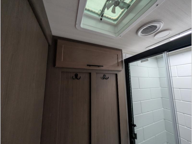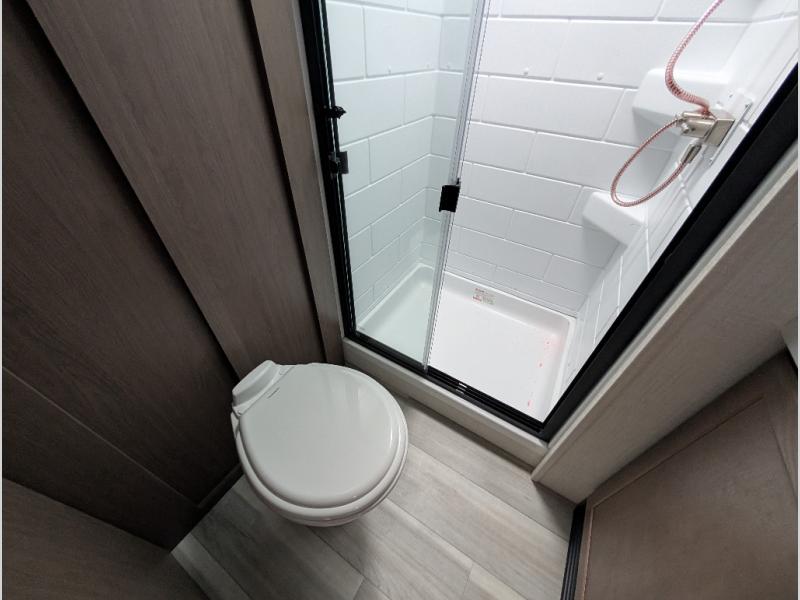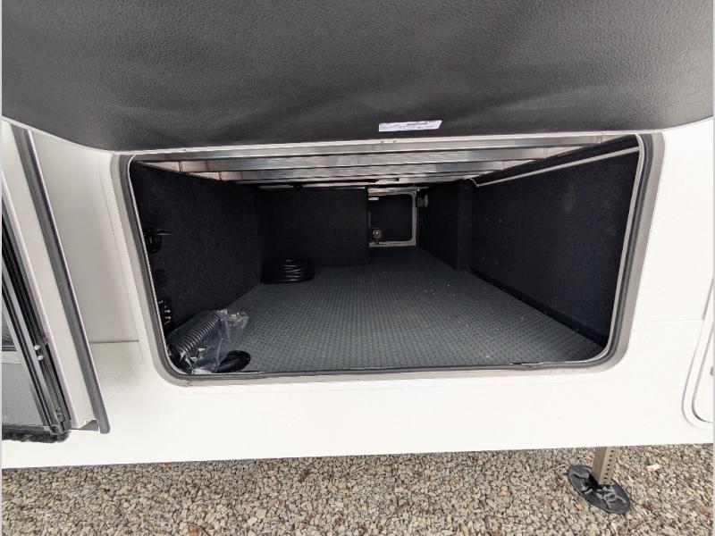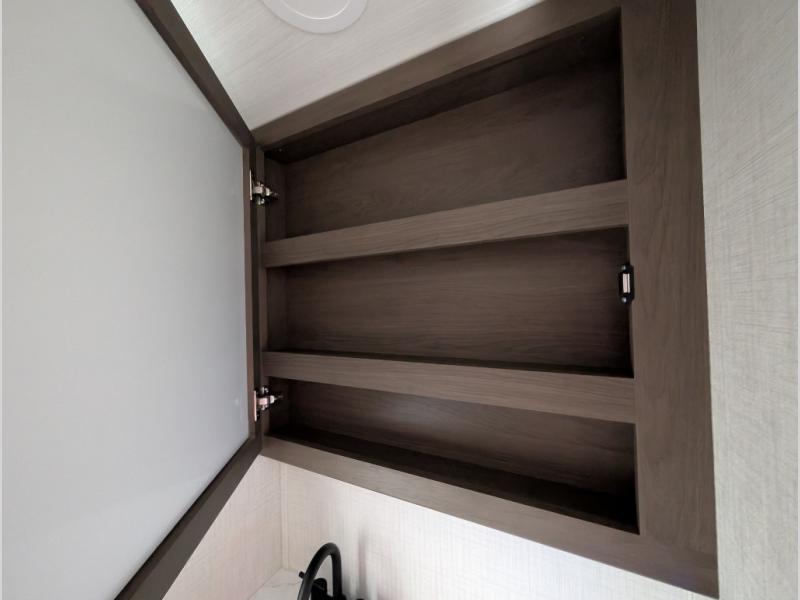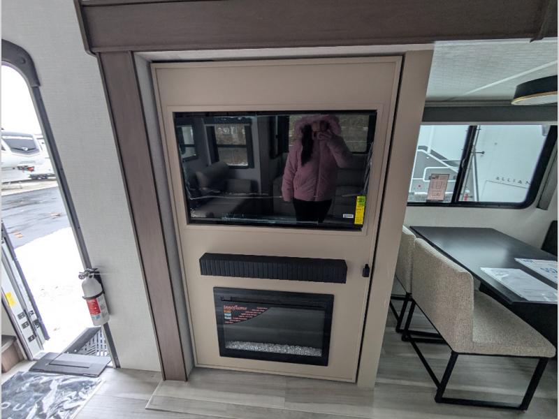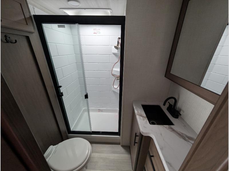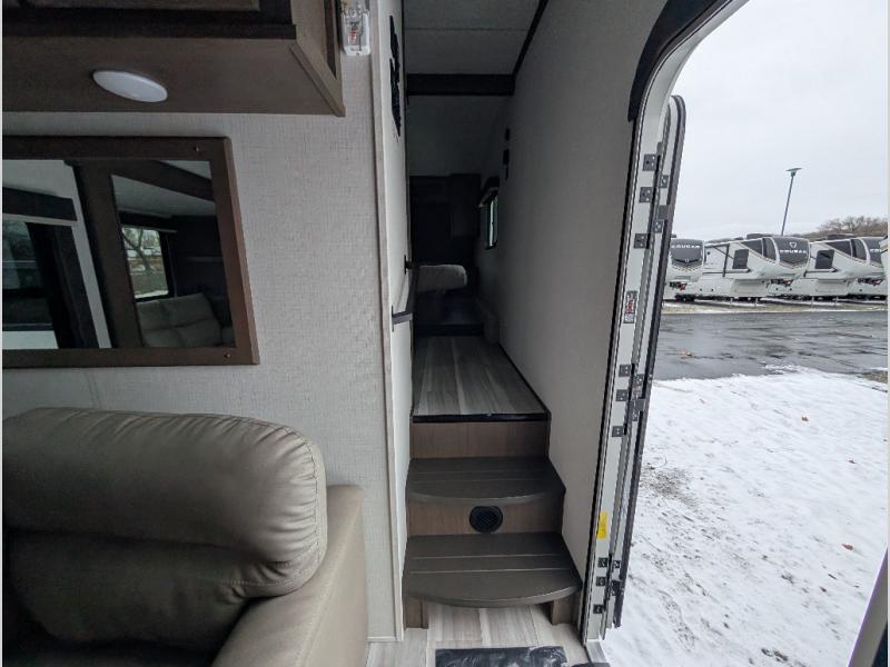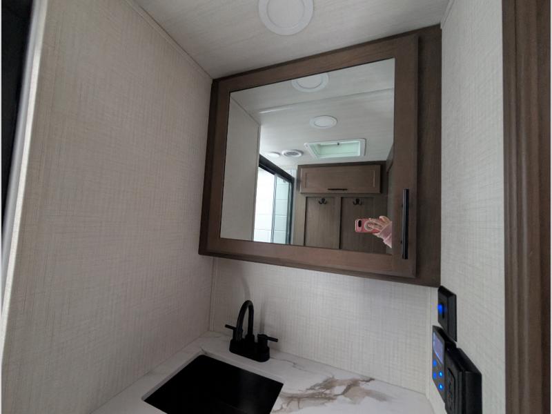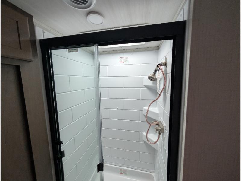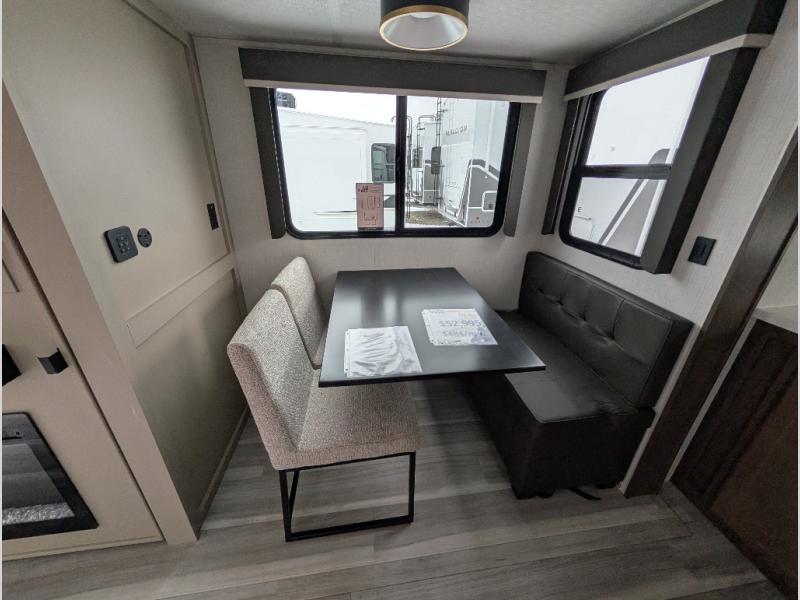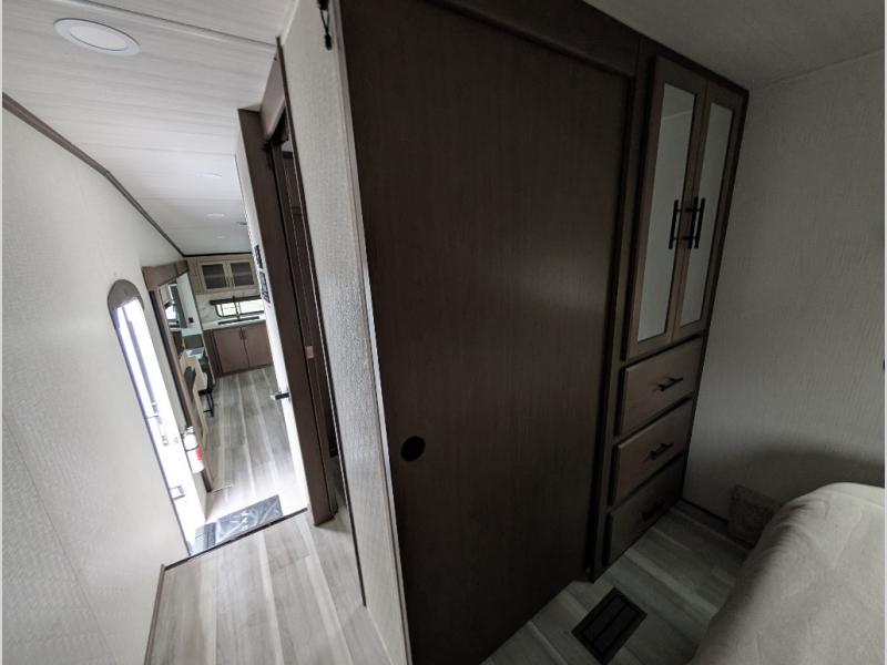 Time spent at the campground in this fifth wheel will be time well spent! Once you arrive, you can unload the unobstructed pass-thru storage, put out the two power awnings, and grab a cold drink from the outdoor mini refrigerator. Head inside to relax on the tri-fold sleeper sofa or theater seating across from the LED HDTV. The rear kitchen includes everything you need to make meals each day, including a pull-out countertop for more space plus a pantry and 12V refrigerator for food storage. The full bath with a 30" x 36" shower will let you freshen up before bed, and speaking of bedtime, the king bed in the front private bedroom is sure to bring a great night's rest. There are also dual wardrobes and nightstands here for your things, plus a third wardrobe with washer and dryer prep if you want to add these appliances.