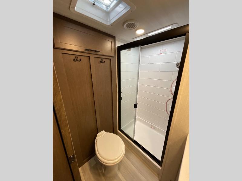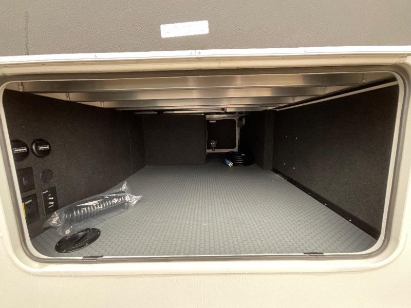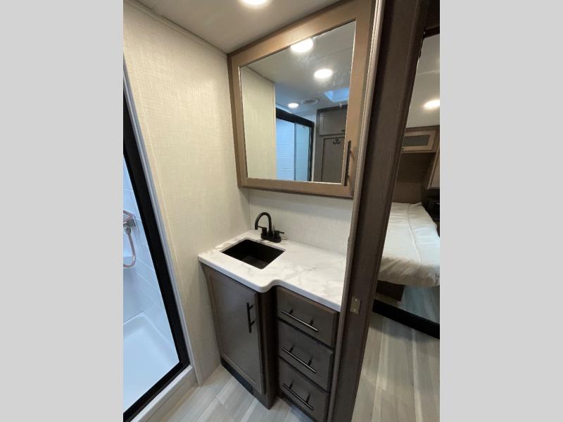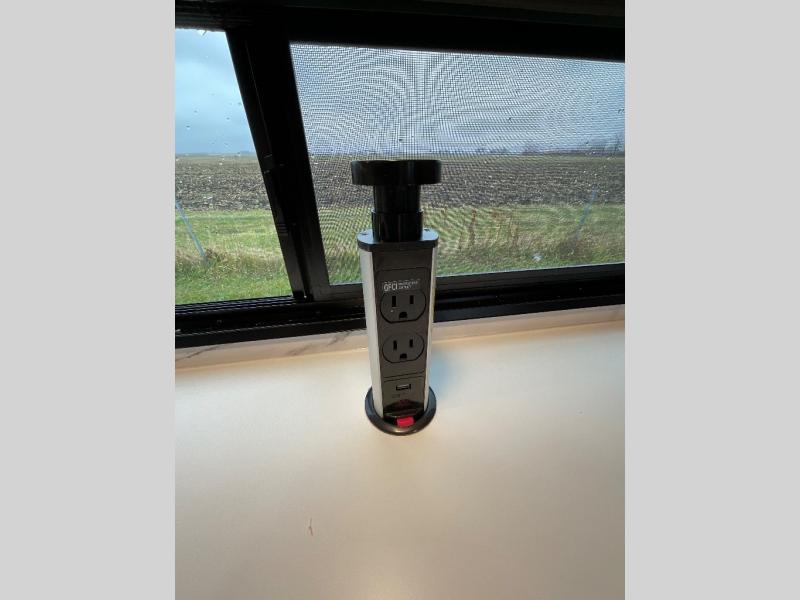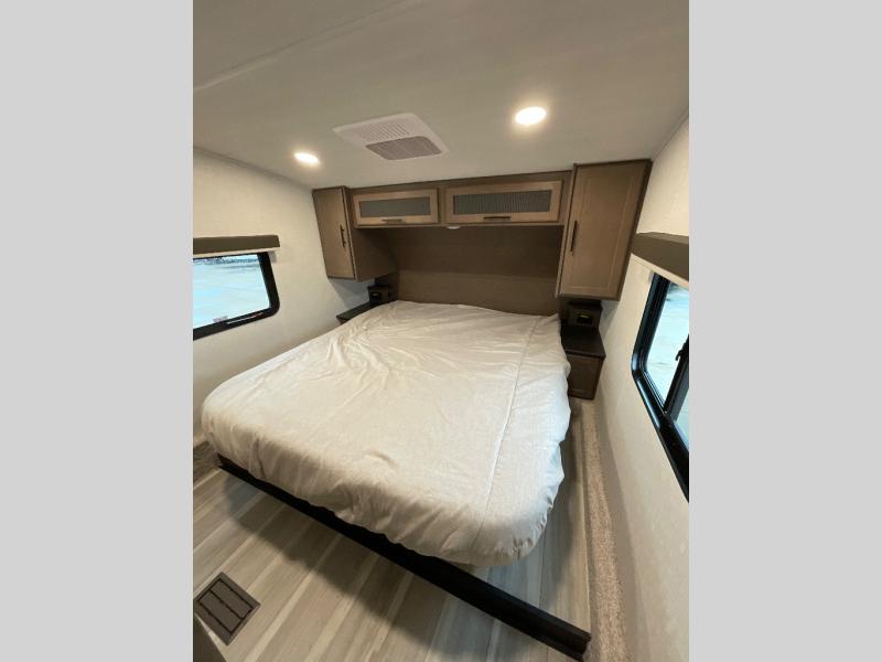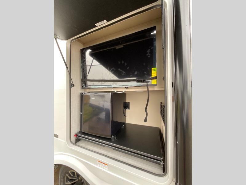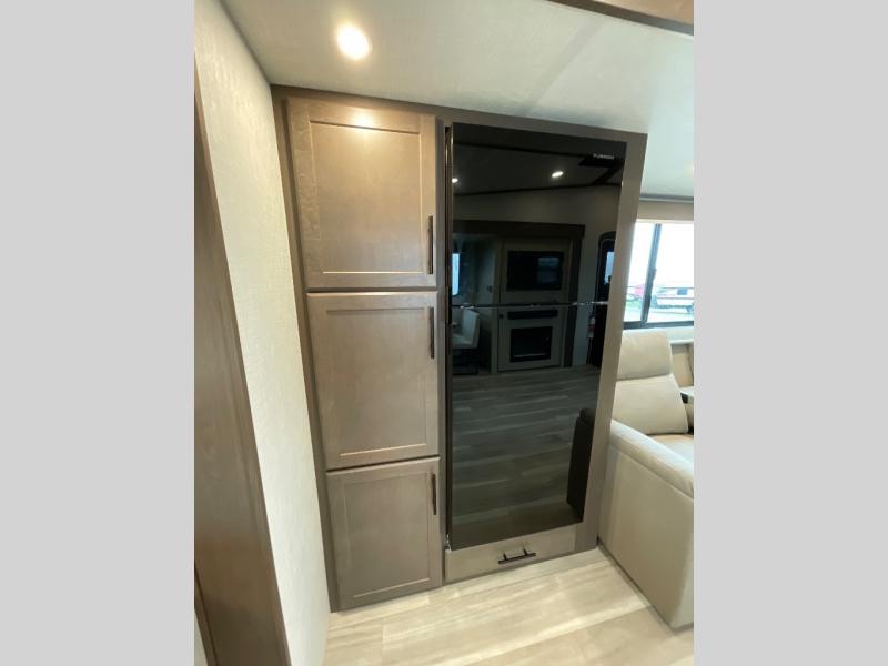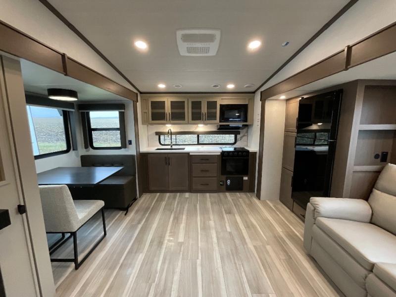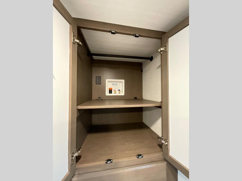 Time spent at the campground in this fifth wheel will be time well spent! Once you arrive, you can unload the unobstructed pass-thru storage, put out the two power awnings, and grab a cold drink from the outdoor mini refrigerator. Head inside to relax on the tri-fold sleeper sofa or theater seating across from the LED HDTV. The rear kitchen includes everything you need to make meals each day, including a pull-out countertop for more space plus a pantry and 12V refrigerator for food storage. The full bath with a 30" x 36" shower will let you freshen up before bed, and speaking of bedtime, the king bed in the front private bedroom is sure to bring a great night's rest. There are also dual wardrobes and nightstands here for your things, plus a third wardrobe with washer and dryer prep if you want to add these appliances.