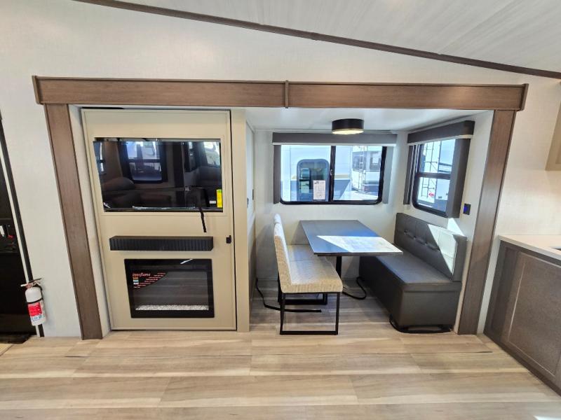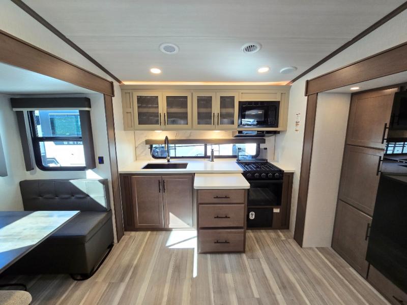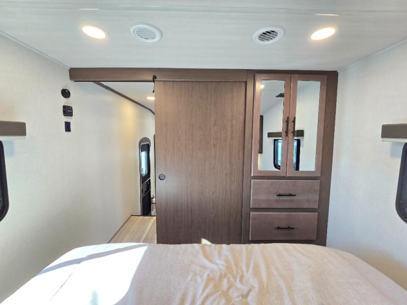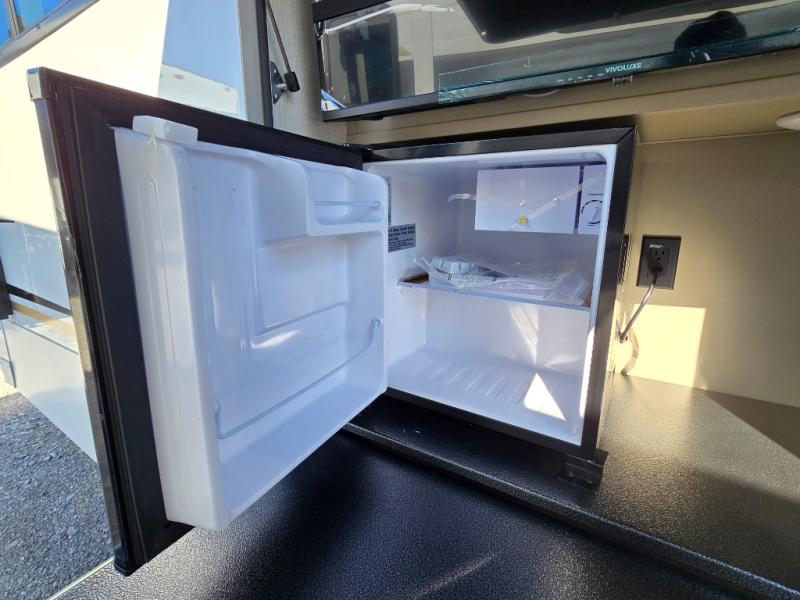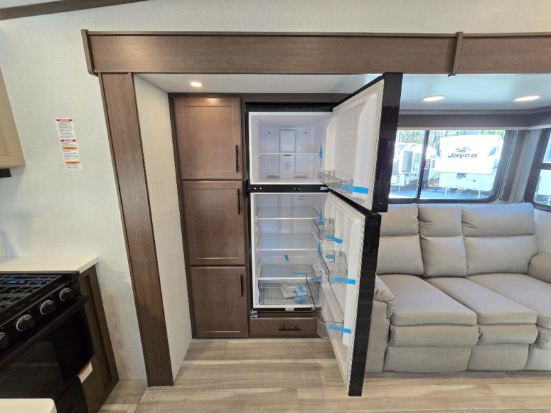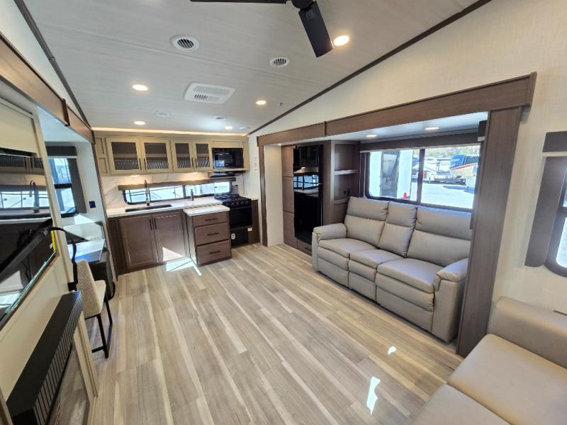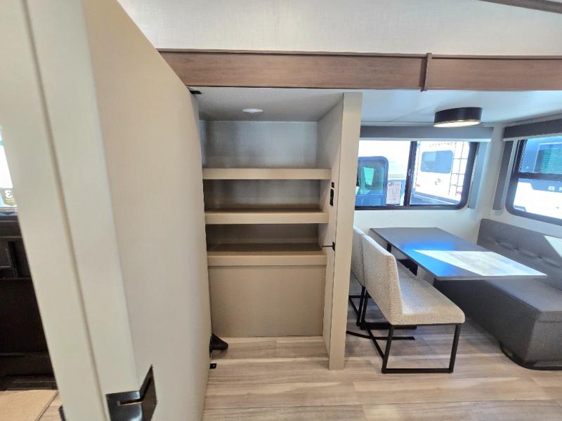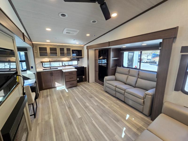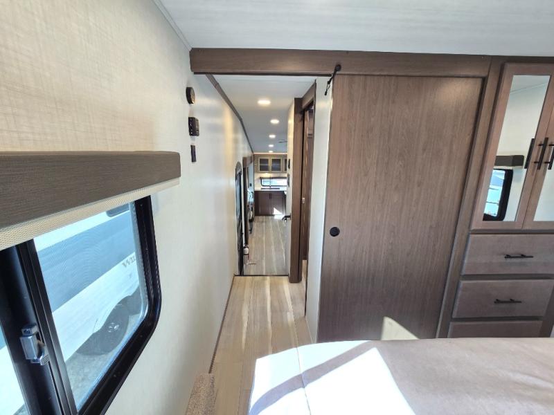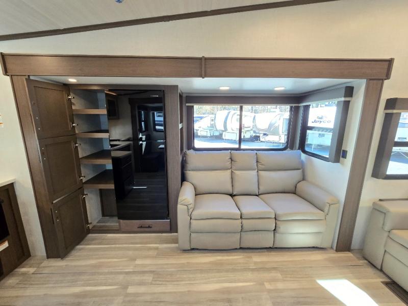 Time spent at the campground in this fifth wheel will be time well spent! Once you arrive, you can unload the unobstructed pass-thru storage, put out the two power awnings, and grab a cold drink from the outdoor mini refrigerator. Head inside to relax on the tri-fold sleeper sofa or theater seating across from the LED HDTV. The rear kitchen includes everything you need to make meals each day, including a pull-out countertop for more space plus a pantry and 12V refrigerator for food storage. The full bath with a 30" x 36" shower will let you freshen up before bed, and speaking of bedtime, the king bed in the front private bedroom is sure to bring a great night's rest. There are also dual wardrobes and nightstands here for your things, plus a third wardrobe with washer and dryer prep if you want to add these appliances.