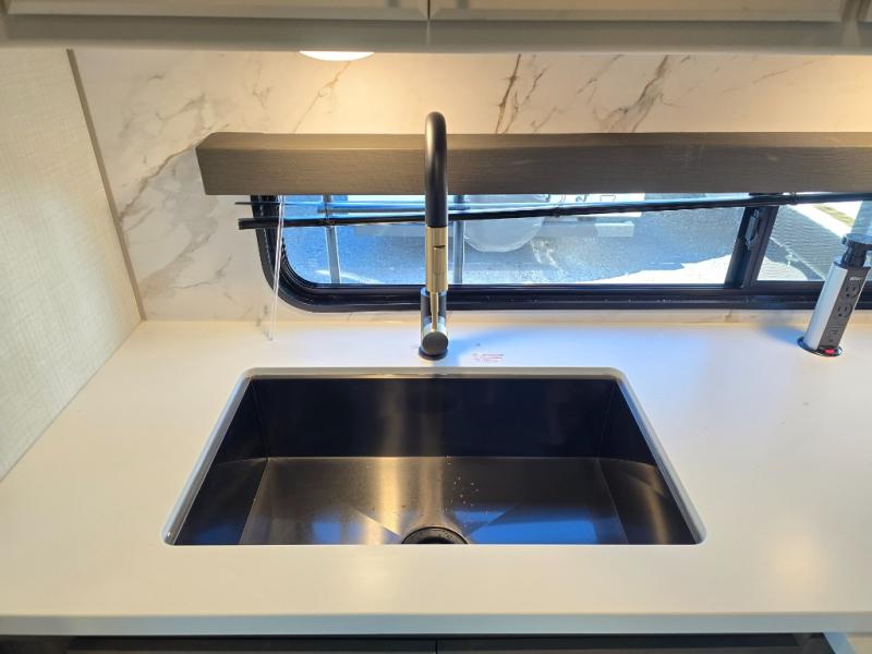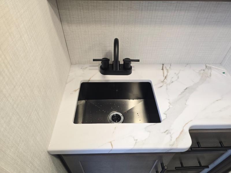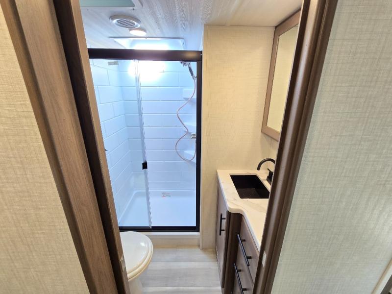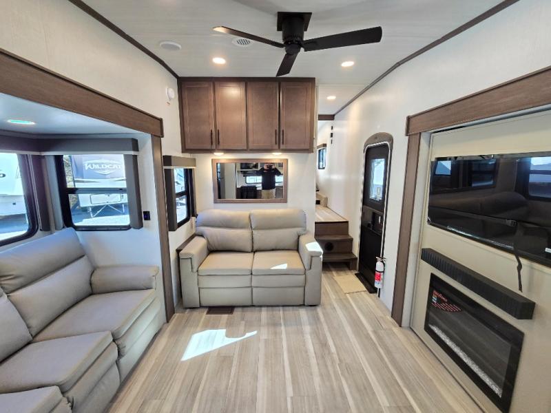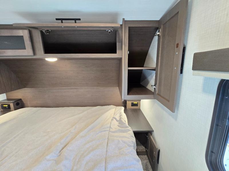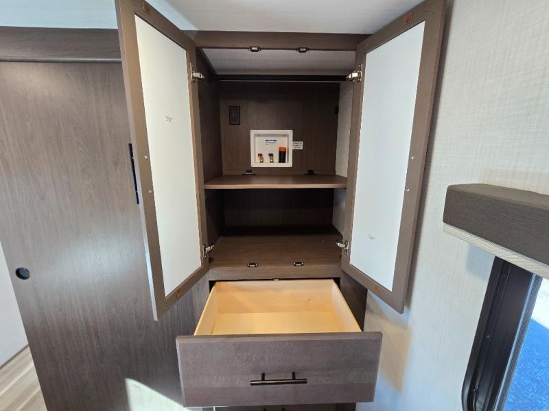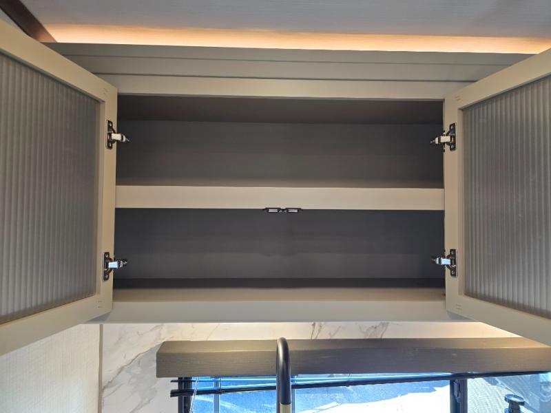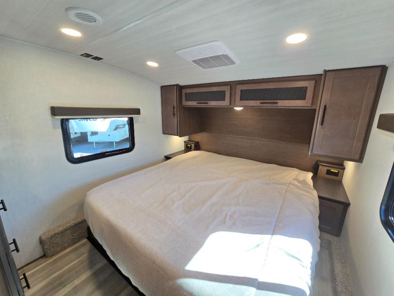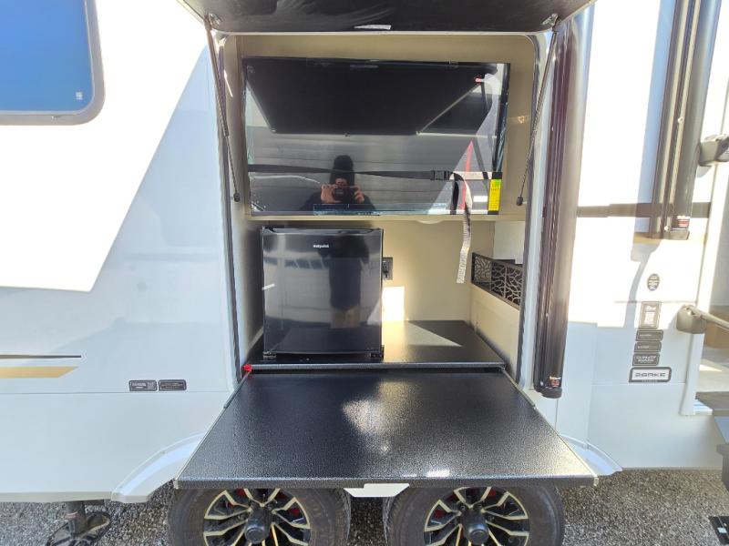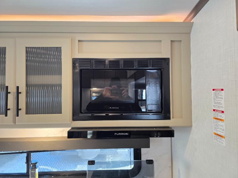 Time spent at the campground in this fifth wheel will be time well spent! Once you arrive, you can unload the unobstructed pass-thru storage, put out the two power awnings, and grab a cold drink from the outdoor mini refrigerator. Head inside to relax on the tri-fold sleeper sofa or theater seating across from the LED HDTV. The rear kitchen includes everything you need to make meals each day, including a pull-out countertop for more space plus a pantry and 12V refrigerator for food storage. The full bath with a 30" x 36" shower will let you freshen up before bed, and speaking of bedtime, the king bed in the front private bedroom is sure to bring a great night's rest. There are also dual wardrobes and nightstands here for your things, plus a third wardrobe with washer and dryer prep if you want to add these appliances.