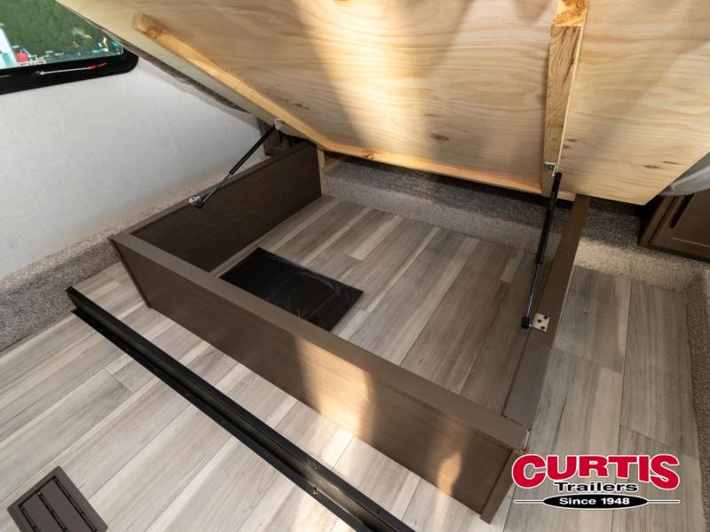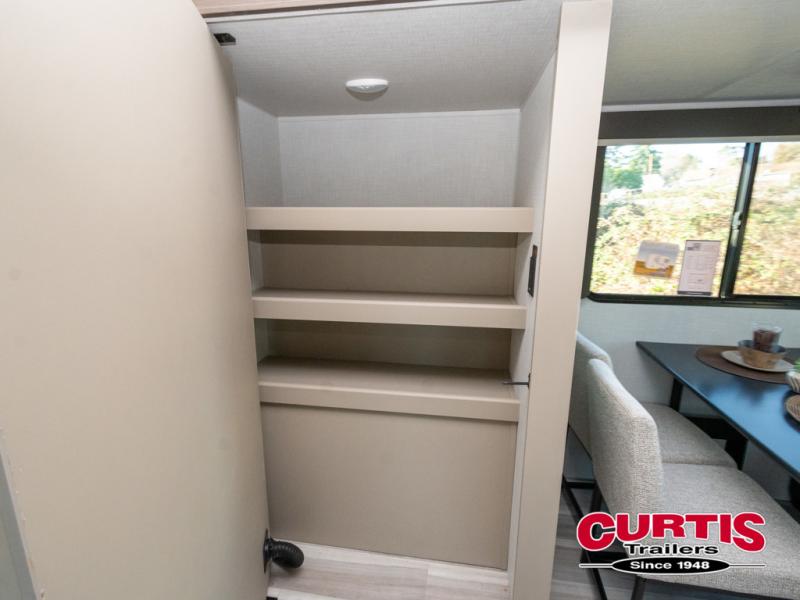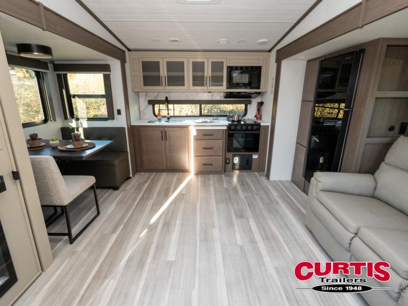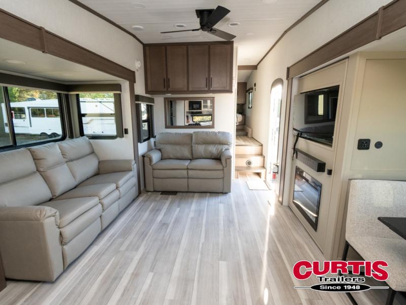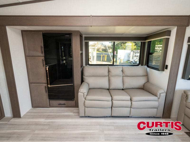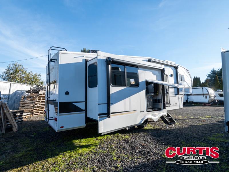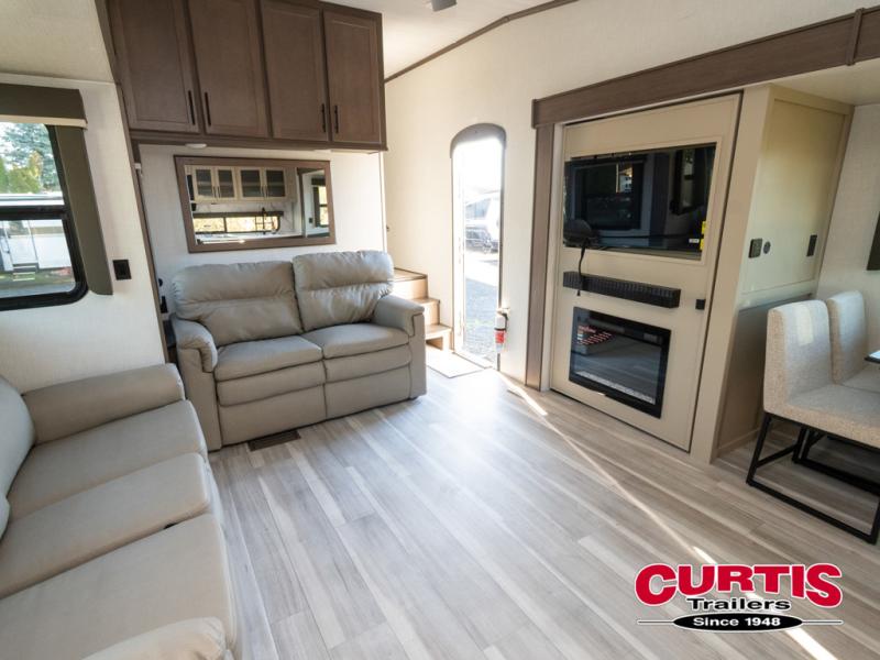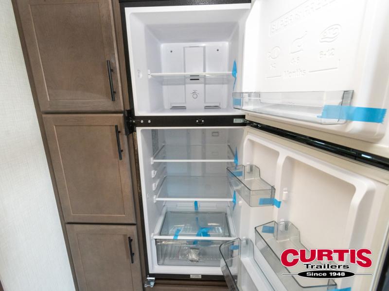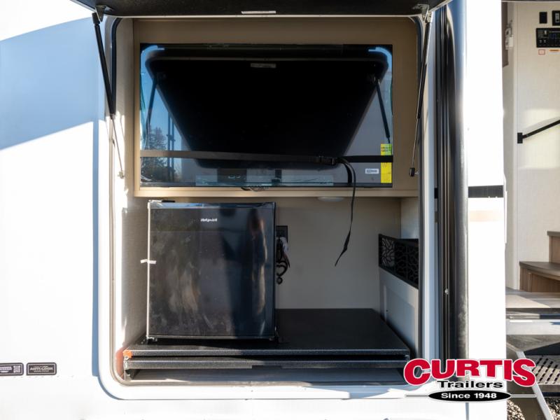 Time spent at the campground in this fifth wheel will be time well spent! Once you arrive, you can unload the unobstructed pass-thru storage, put out the two power awnings, and grab a cold drink from the outdoor mini refrigerator. Head inside to relax on the tri-fold sleeper sofa or theater seating across from the LED HDTV. The rear kitchen includes everything you need to make meals each day, including a pull-out countertop for more space plus a pantry and 12V refrigerator for food storage. The full bath with a 30" x 36" shower will let you freshen up before bed, and speaking of bedtime, the king bed in the front private bedroom is sure to bring a great night's rest. There are also dual wardrobes and nightstands here for your things, plus a third wardrobe with washer and dryer prep if you want to add these appliances.