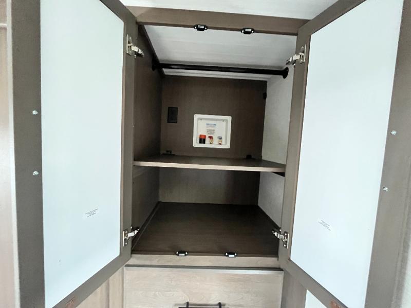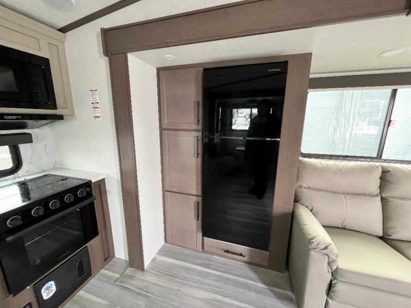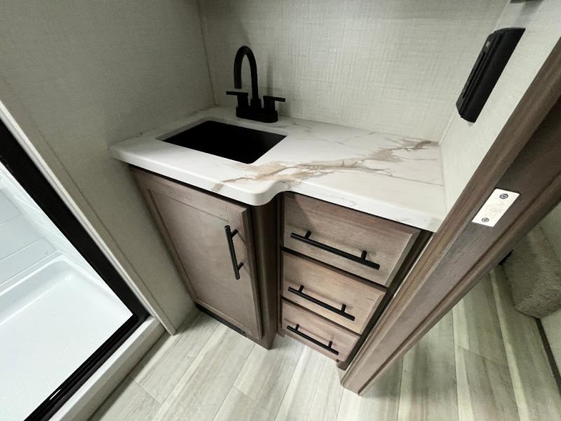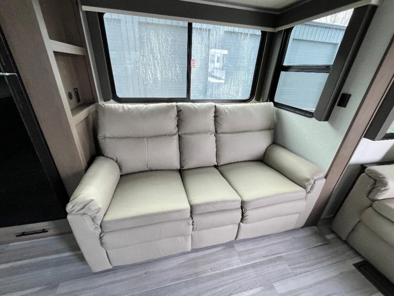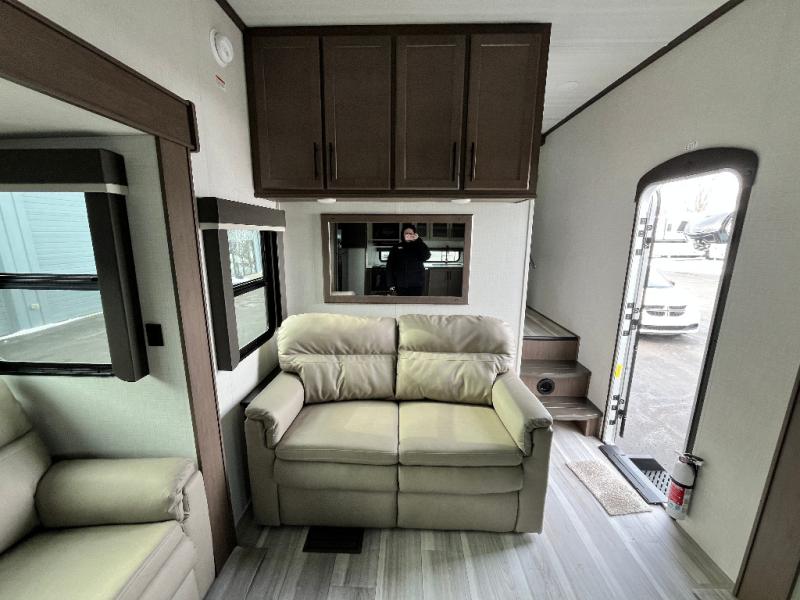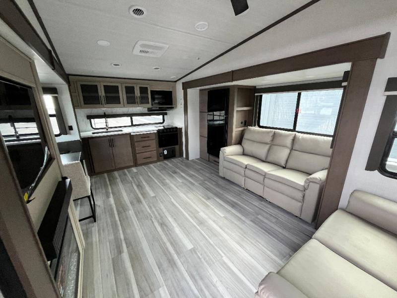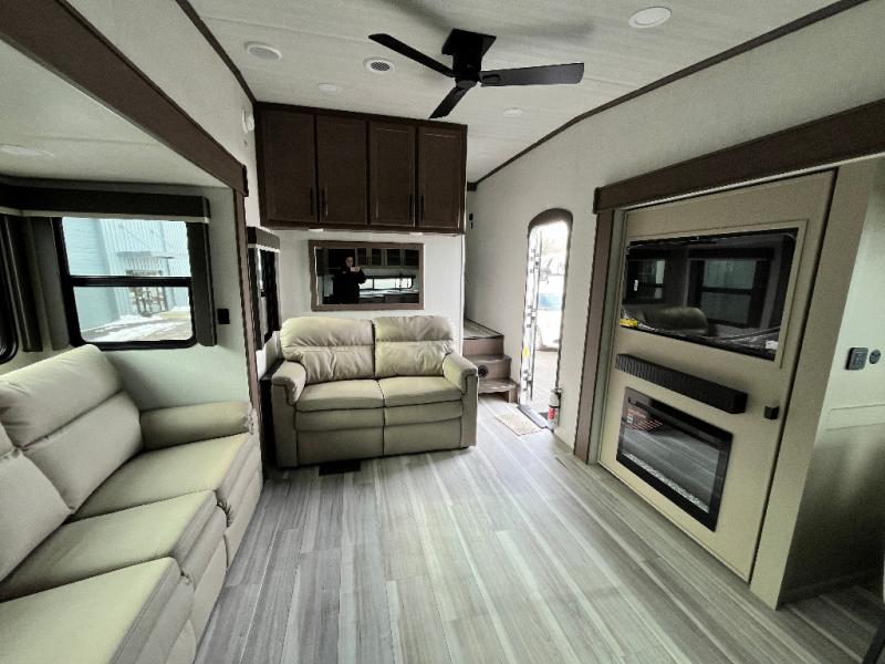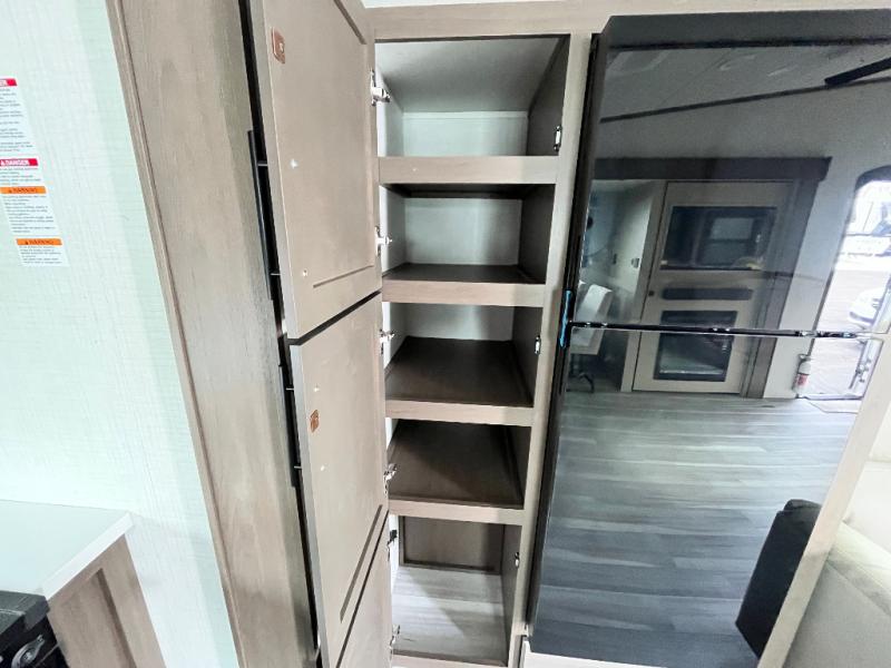 Time spent at the campground in this fifth wheel will be time well spent! Once you arrive, you can unload the unobstructed pass-thru storage, put out the two power awnings, and grab a cold drink from the outdoor mini refrigerator. Head inside to relax on the tri-fold sleeper sofa or theater seating across from the LED HDTV. The rear kitchen includes everything you need to make meals each day, including a pull-out countertop for more space plus a pantry and 12V refrigerator for food storage. The full bath with a 30" x 36" shower will let you freshen up before bed, and speaking of bedtime, the king bed in the front private bedroom is sure to bring a great night's rest. There are also dual wardrobes and nightstands here for your things, plus a third wardrobe with washer and dryer prep if you want to add these appliances.
