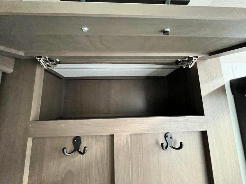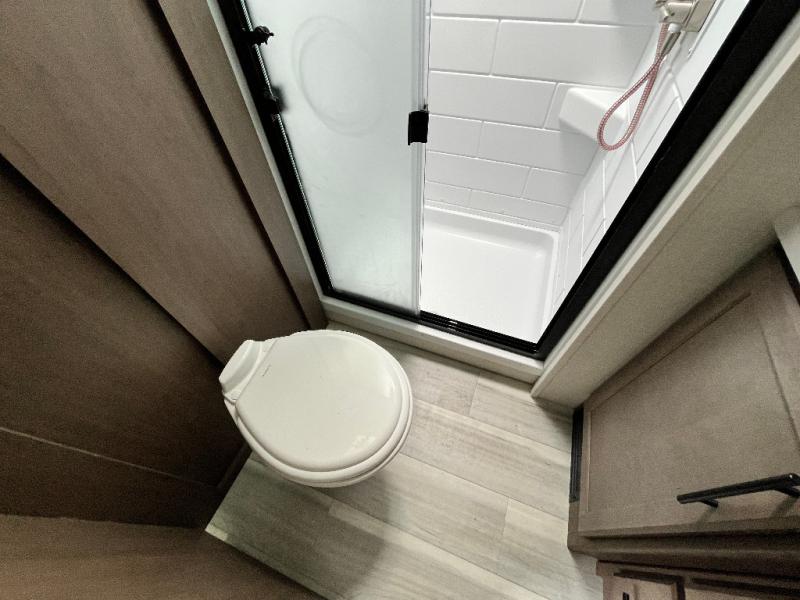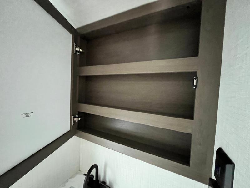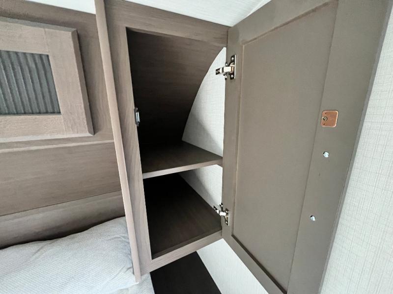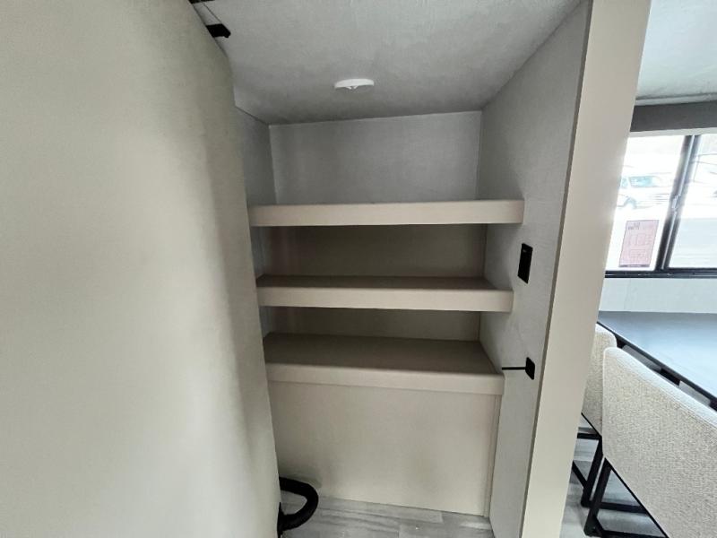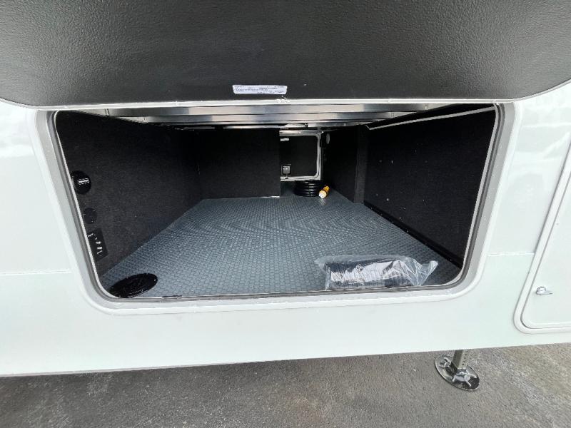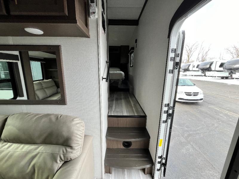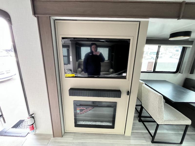 Time spent at the campground in this fifth wheel will be time well spent! Once you arrive, you can unload the unobstructed pass-thru storage, put out the two power awnings, and grab a cold drink from the outdoor mini refrigerator. Head inside to relax on the tri-fold sleeper sofa or theater seating across from the LED HDTV. The rear kitchen includes everything you need to make meals each day, including a pull-out countertop for more space plus a pantry and 12V refrigerator for food storage. The full bath with a 30" x 36" shower will let you freshen up before bed, and speaking of bedtime, the king bed in the front private bedroom is sure to bring a great night's rest. There are also dual wardrobes and nightstands here for your things, plus a third wardrobe with washer and dryer prep if you want to add these appliances.