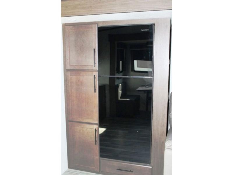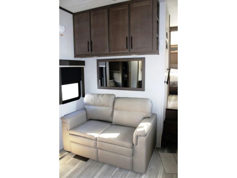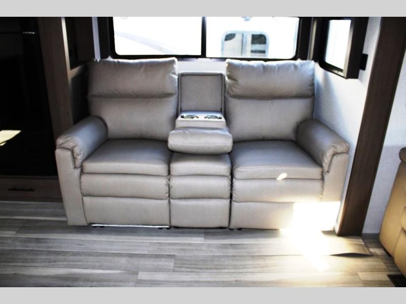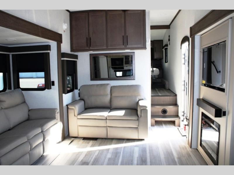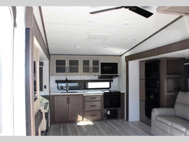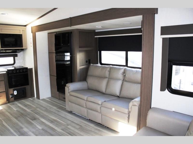 Time spent at the campground in this fifth wheel will be time well spent! Once you arrive, you can unload the unobstructed pass-thru storage, put out the two power awnings, and grab a cold drink from the outdoor mini refrigerator. Head inside to relax on the tri-fold sleeper sofa or theater seating across from the LED HDTV. The rear kitchen includes everything you need to make meals each day, including a pull-out countertop for more space plus a pantry and 12V refrigerator for food storage. The full bath with a 30" x 36" shower will let you freshen up before bed, and speaking of bedtime, the king bed in the front private bedroom is sure to bring a great night's rest. There are also dual wardrobes and nightstands here for your things, plus a third wardrobe with washer and dryer prep if you want to add these appliances.
