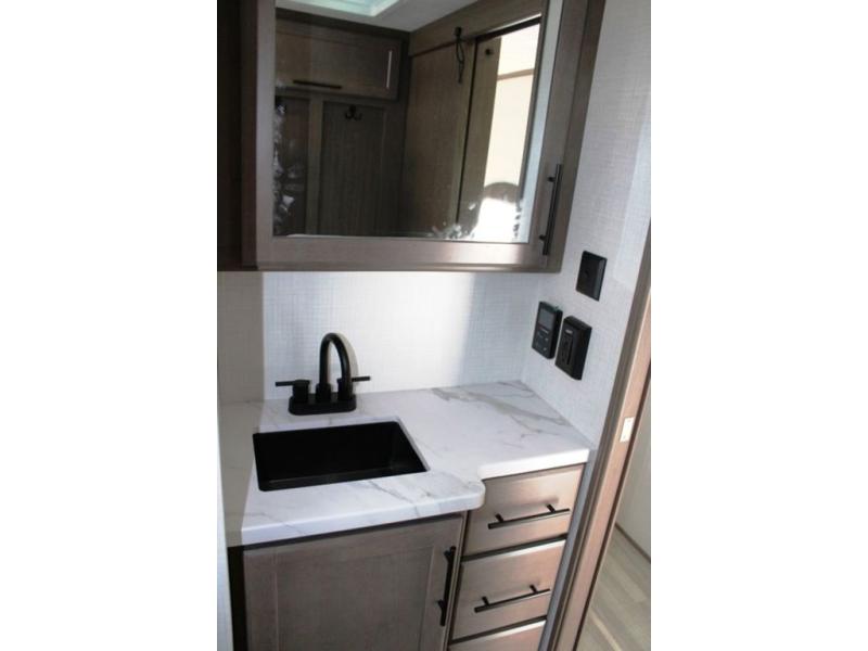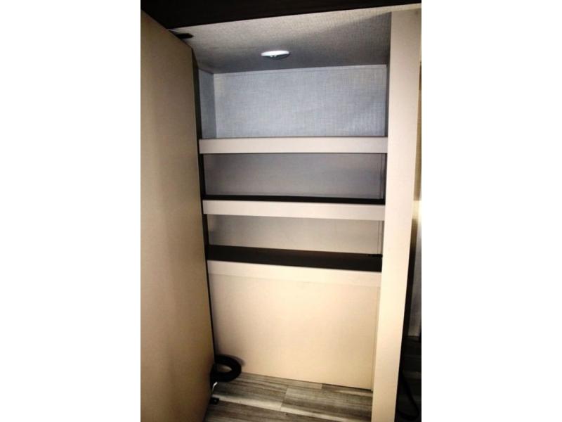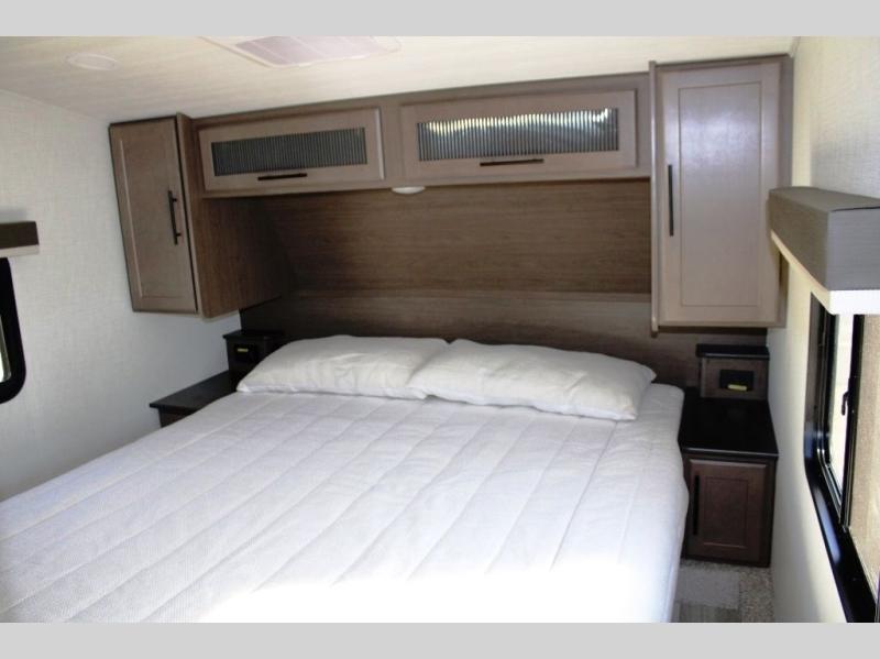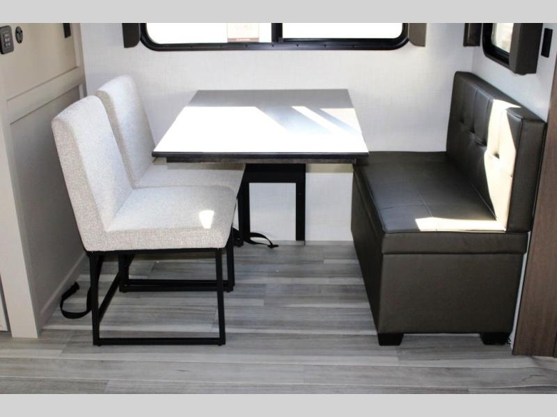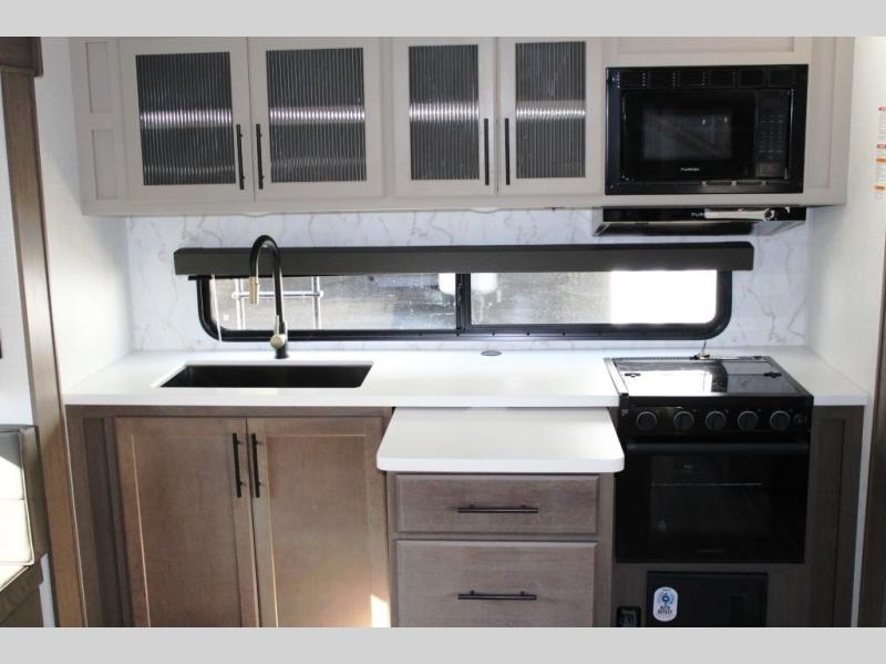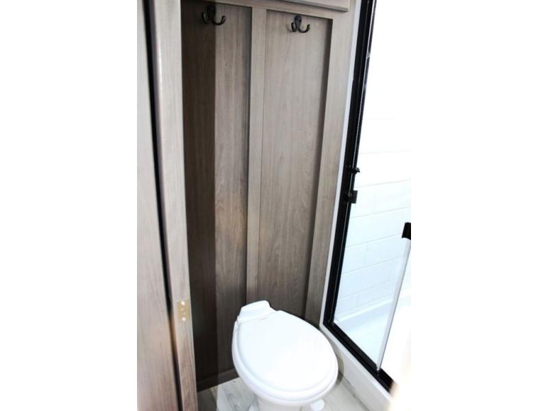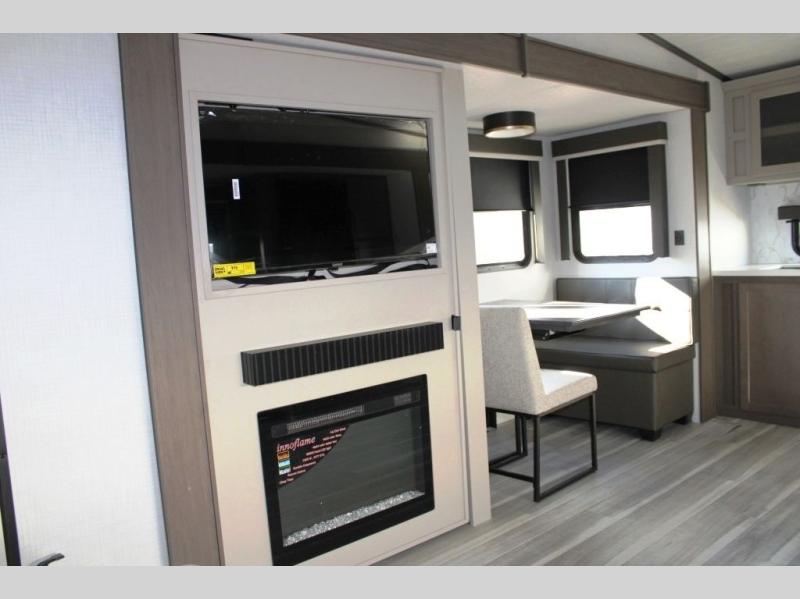 Time spent at the campground in this fifth wheel will be time well spent! Once you arrive, you can unload the unobstructed pass-thru storage, put out the two power awnings, and grab a cold drink from the outdoor mini refrigerator. Head inside to relax on the tri-fold sleeper sofa or theater seating across from the LED HDTV. The rear kitchen includes everything you need to make meals each day, including a pull-out countertop for more space plus a pantry and 12V refrigerator for food storage. The full bath with a 30" x 36" shower will let you freshen up before bed, and speaking of bedtime, the king bed in the front private bedroom is sure to bring a great night's rest. There are also dual wardrobes and nightstands here for your things, plus a third wardrobe with washer and dryer prep if you want to add these appliances.