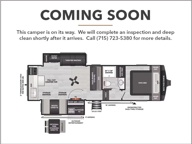 Time spent at the campground in this fifth wheel will be time well spent! Once you arrive, you can unload the unobstructed pass-thru storage, put out the two power awnings, and grab a cold drink from the outdoor mini refrigerator. Head inside to relax on the tri-fold sleeper sofa or theater seating across from the LED HDTV. The rear kitchen includes everything you need to make meals each day, including a pull-out countertop for more space plus a pantry and 12V refrigerator for food storage. The full bath with a 30" x 36" shower will let you freshen up before bed, and speaking of bedtime, the king bed in the front private bedroom is sure to bring a great night's rest. There are also dual wardrobes and nightstands here for your things, plus a third wardrobe with washer and dryer prep if you want to add these appliances.