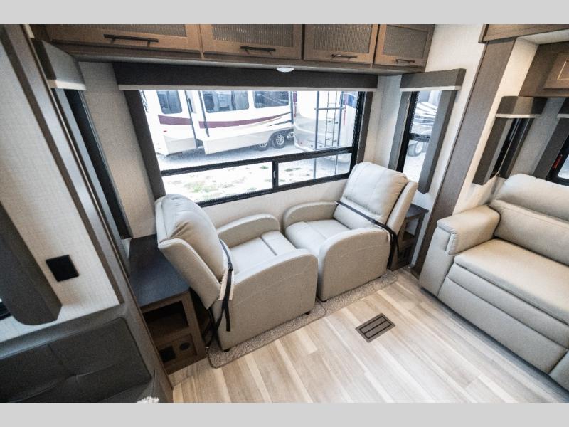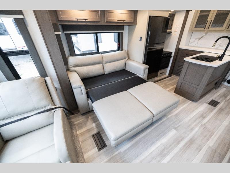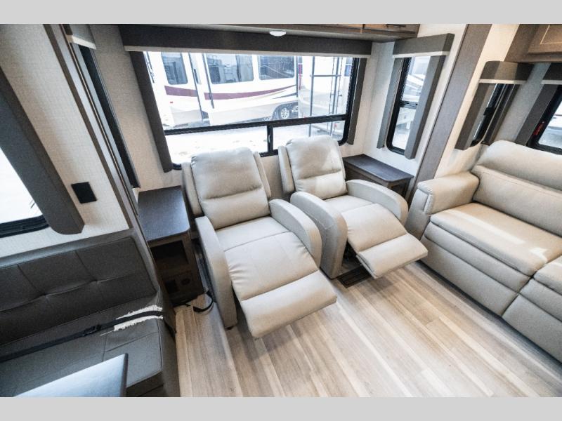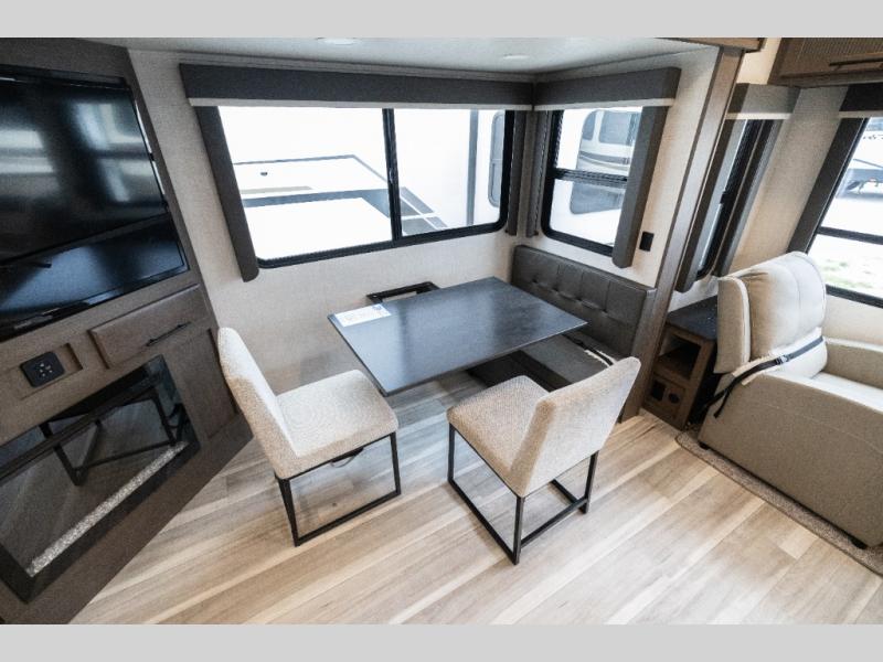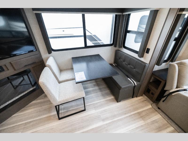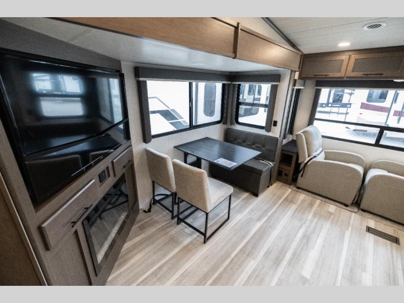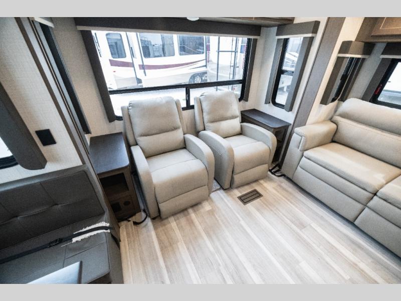 When you are ready to enjoy the fresh outdoor air, you'll want this Cougar Half-Ton fifth wheel to be there with you! The interior will feel spacious and comfortable because of the opposing slides, and you'll have plenty of seating to offer to any friends that stop by with the two recliners in the back, the tri-fold sleeper sofa and the optional free-standing dinette. You can sit down and chat, or you can head outside to grab some fresh air underneath the 10' power awning. When you're ready to call it a night, the queen bed in the front bedroom is sure to bring a great night's rest, and there is a wardrobe slide for added space and storage!