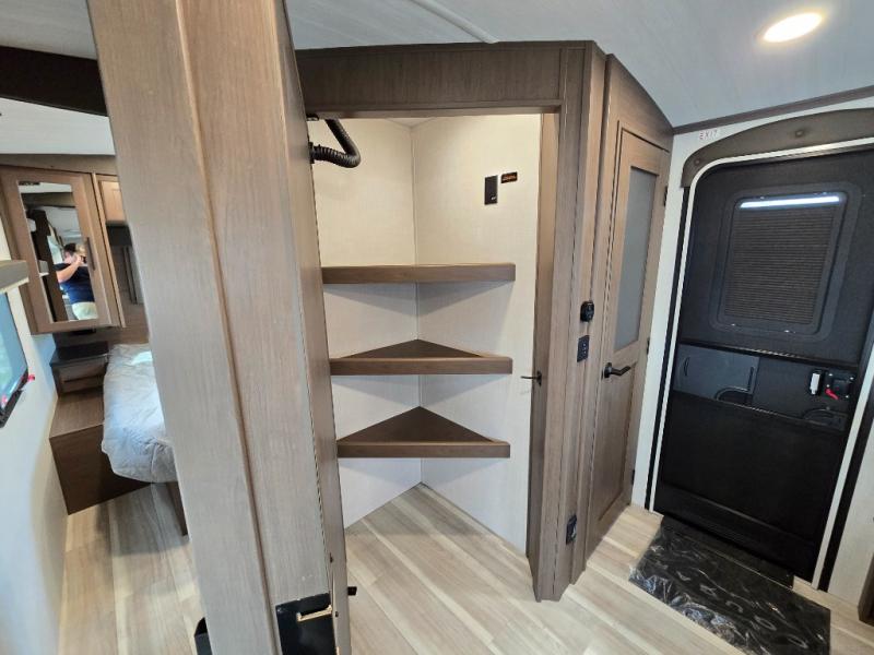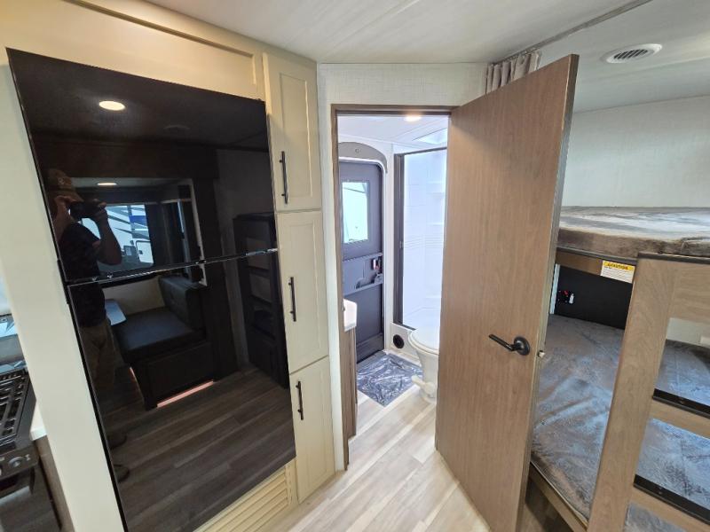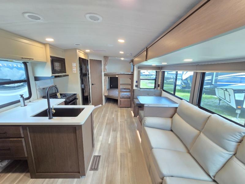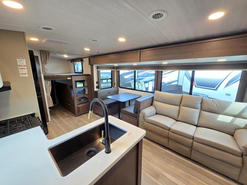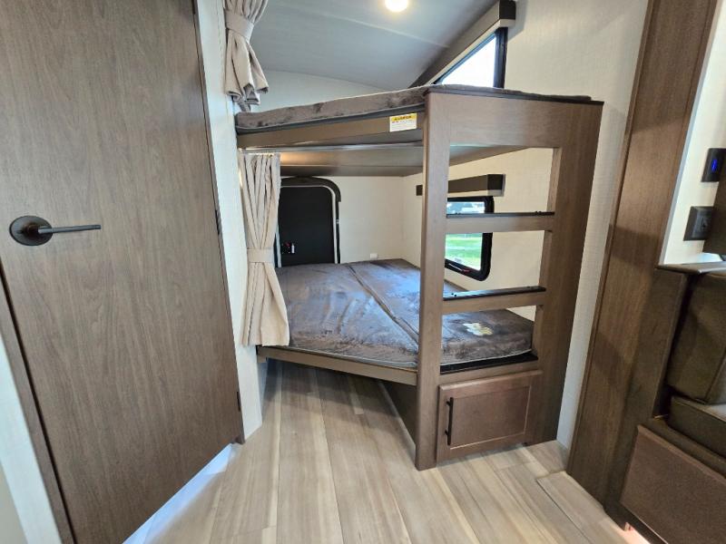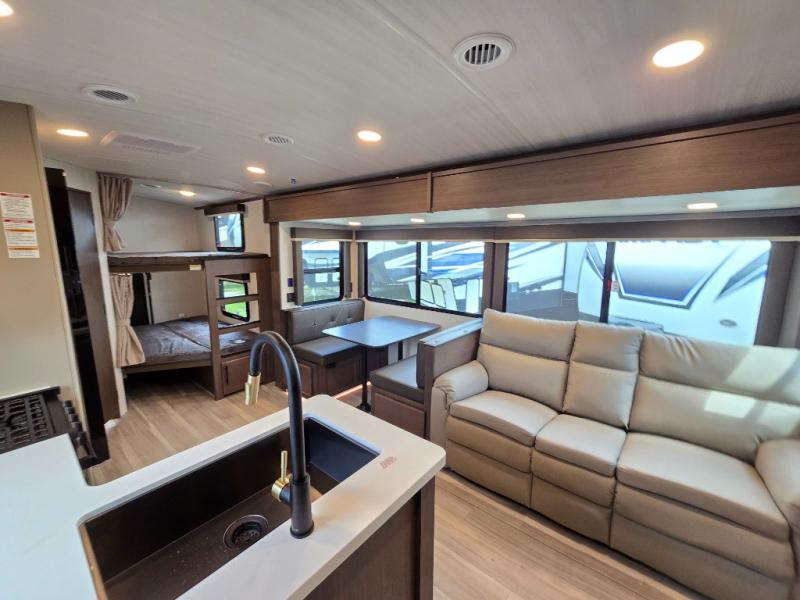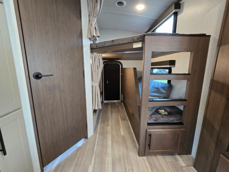 With dual entry doors in this travel trailer, you can enter in through the main living area or the full bath for convenience! Once inside, the sleeper sofa and booth dinette provide places to relax, eat, and play games, plus there is an entertainment center with hidden storage behind to keep movies organized. A full kitchen with a three burner cooktop and 12V refrigerator will allow you to cook and store food, or you can head outdoors to cook on the outdoor kitchen. There is also drop-frame storage outside for fishing poles and hiking gear, and the 21' electric awning provides shade as you relax. When it's time to call it a night, the king bed in the front private bedroom is sure to bring comfort, while the little ones take the double-size bunks, and any other guests can sleep on the living room furniture!
