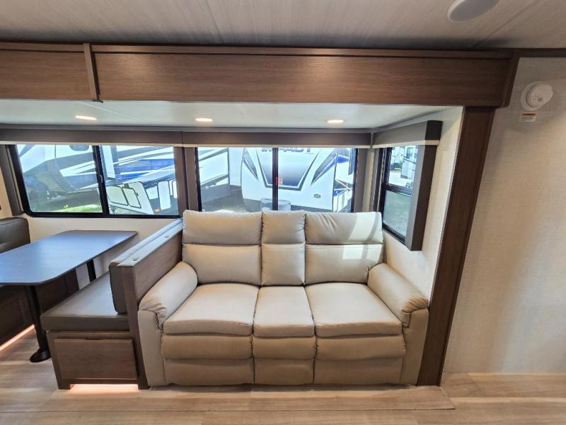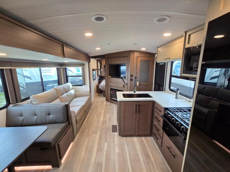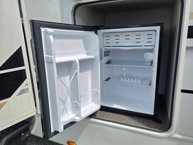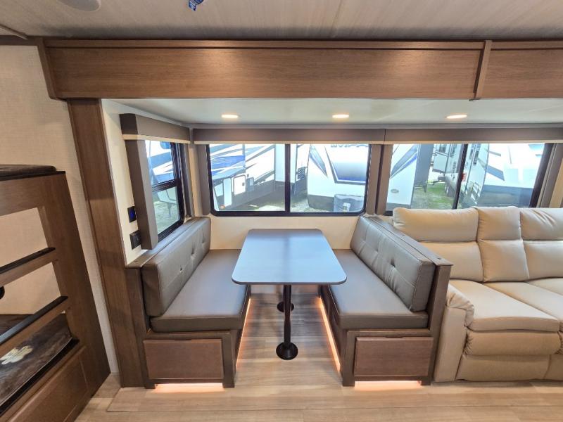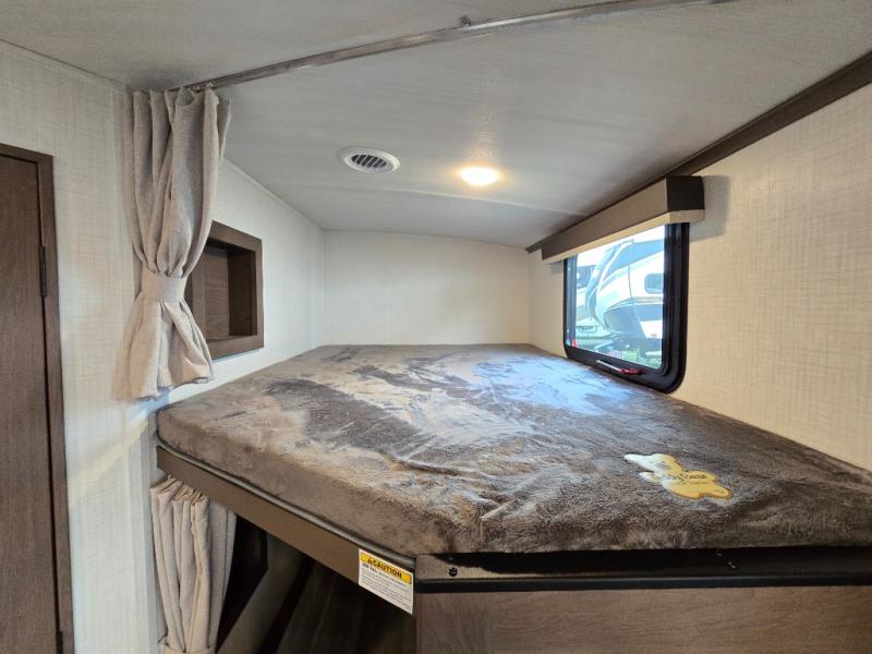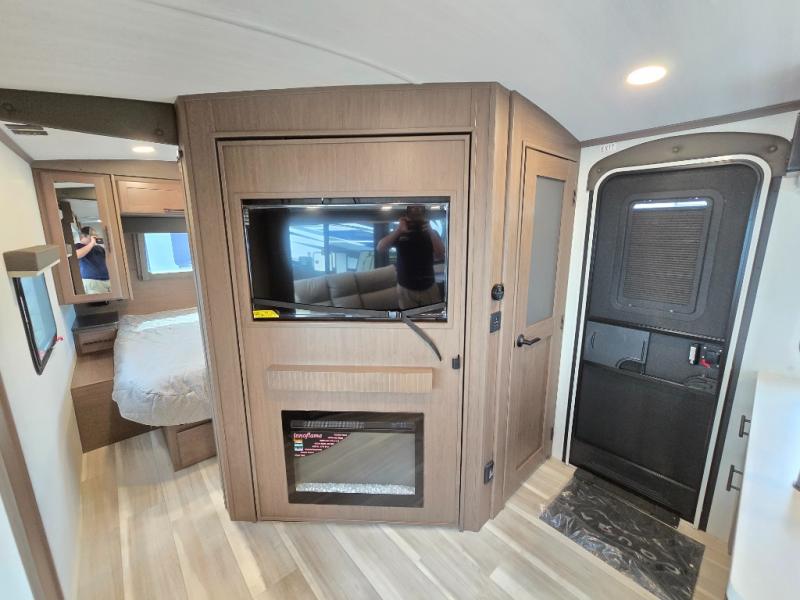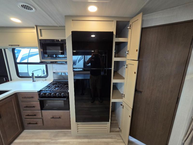 With dual entry doors in this travel trailer, you can enter in through the main living area or the full bath for convenience! Once inside, the sleeper sofa and booth dinette provide places to relax, eat, and play games, plus there is an entertainment center with hidden storage behind to keep movies organized. A full kitchen with a three burner cooktop and 12V refrigerator will allow you to cook and store food, or you can head outdoors to cook on the outdoor kitchen. There is also drop-frame storage outside for fishing poles and hiking gear, and the 21' electric awning provides shade as you relax. When it's time to call it a night, the king bed in the front private bedroom is sure to bring comfort, while the little ones take the double-size bunks, and any other guests can sleep on the living room furniture!