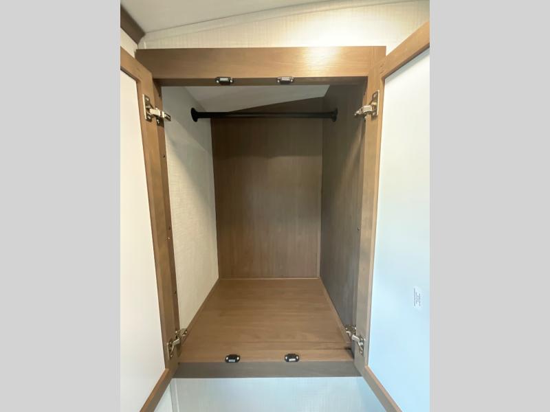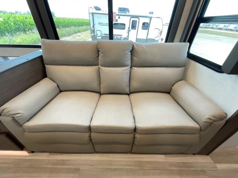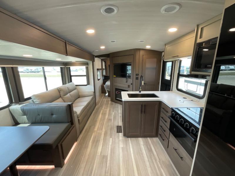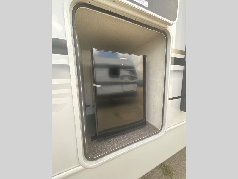 With dual entry doors in this travel trailer, you can enter in through the main living area or the full bath for convenience! Once inside, the sleeper sofa and booth dinette provide places to relax, eat, and play games, plus there is an entertainment center with hidden storage behind to keep movies organized. A full kitchen with a three burner cooktop and 12V refrigerator will allow you to cook and store food, or you can head outdoors to use the outdoor kitchen prep area. There is also drop-frame storage outside for fishing poles and hiking gear, and the 21' electric awning provides shade as you relax. When it's time to call it a night, the king bed in the front private bedroom is sure to bring comfort, while the little ones take the double-size bunks, and any other guests can sleep on the living room furniture!