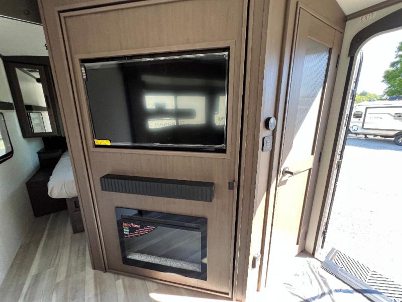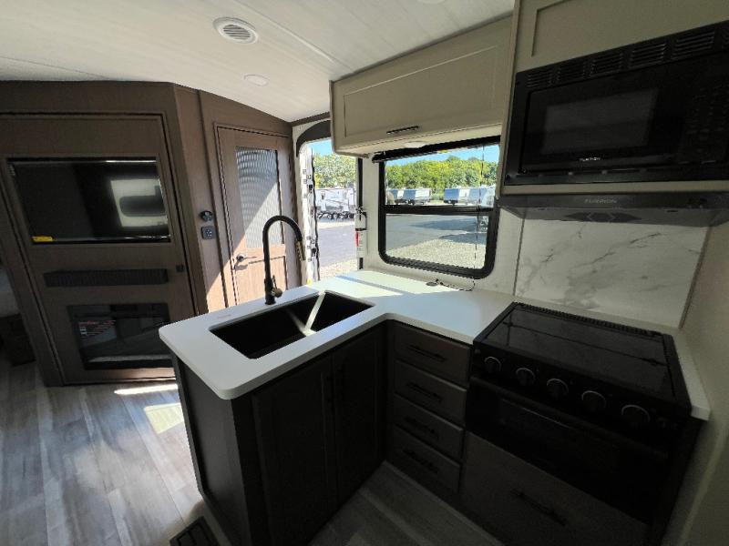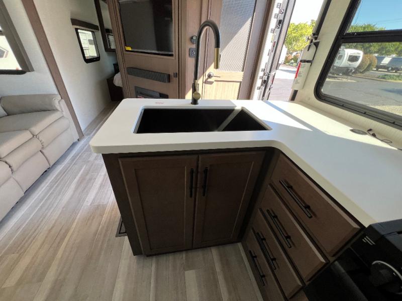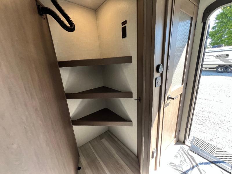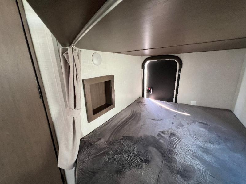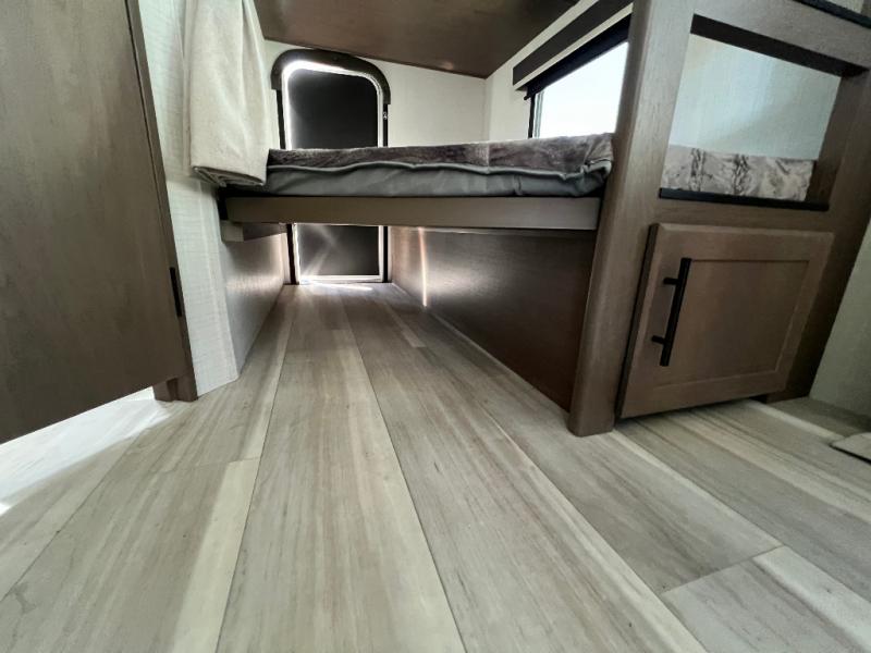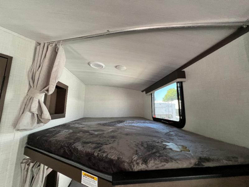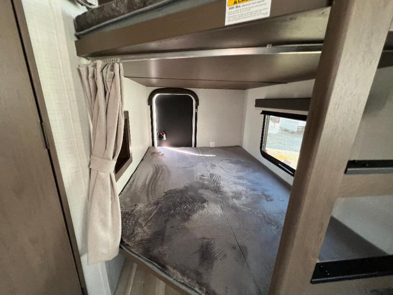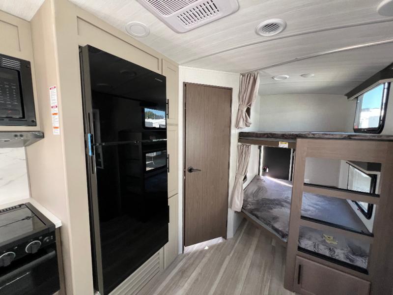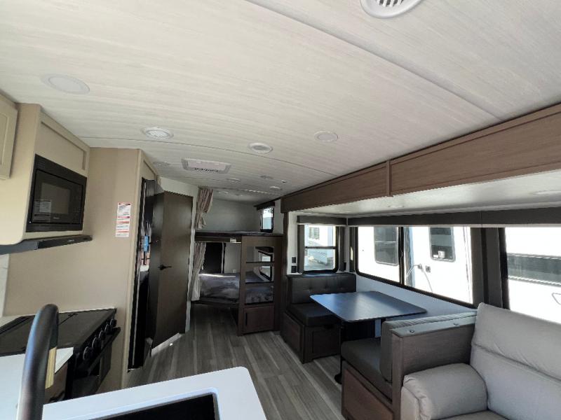 With dual entry doors in this travel trailer, you can enter in through the main living area or the full bath for convenience! Once inside, the sleeper sofa and booth dinette provide places to relax, eat, and play games, plus there is an entertainment center with hidden storage behind to keep movies organized. A full kitchen with a three burner cooktop and 12V refrigerator will allow you to cook and store food, or you can head outdoors to use the outdoor kitchen prep area. There is also drop-frame storage outside for fishing poles and hiking gear, and the 21' electric awning provides shade as you relax. When it's time to call it a night, the king bed in the front private bedroom is sure to bring comfort, while the little ones take the double-size bunks, and any other guests can sleep on the living room furniture!